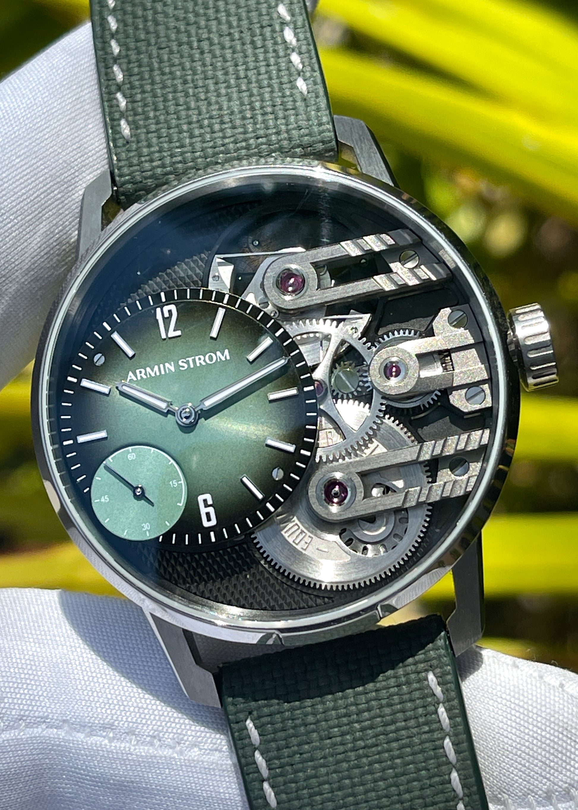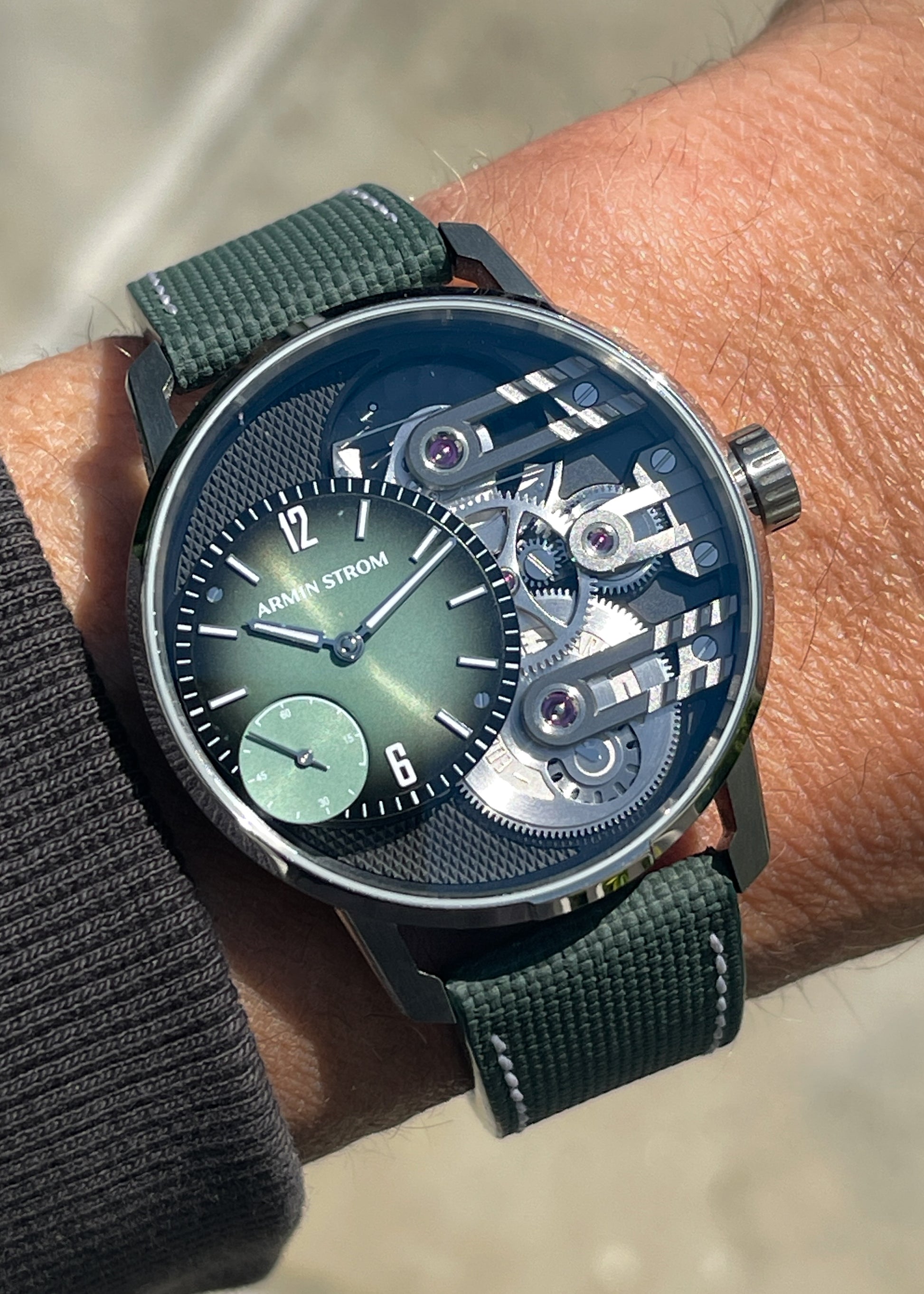 Give green a go with the Armin Strom Gravity Equal Force P03, a 30 piece Special Edition for my friends at Collective Horology. Featuring a guilloché backplate executed by the workshop of Kari Voutilainen and a striking khaki green fumé dial which vignettes from light green at its center to a dark greenish black at the periphery.