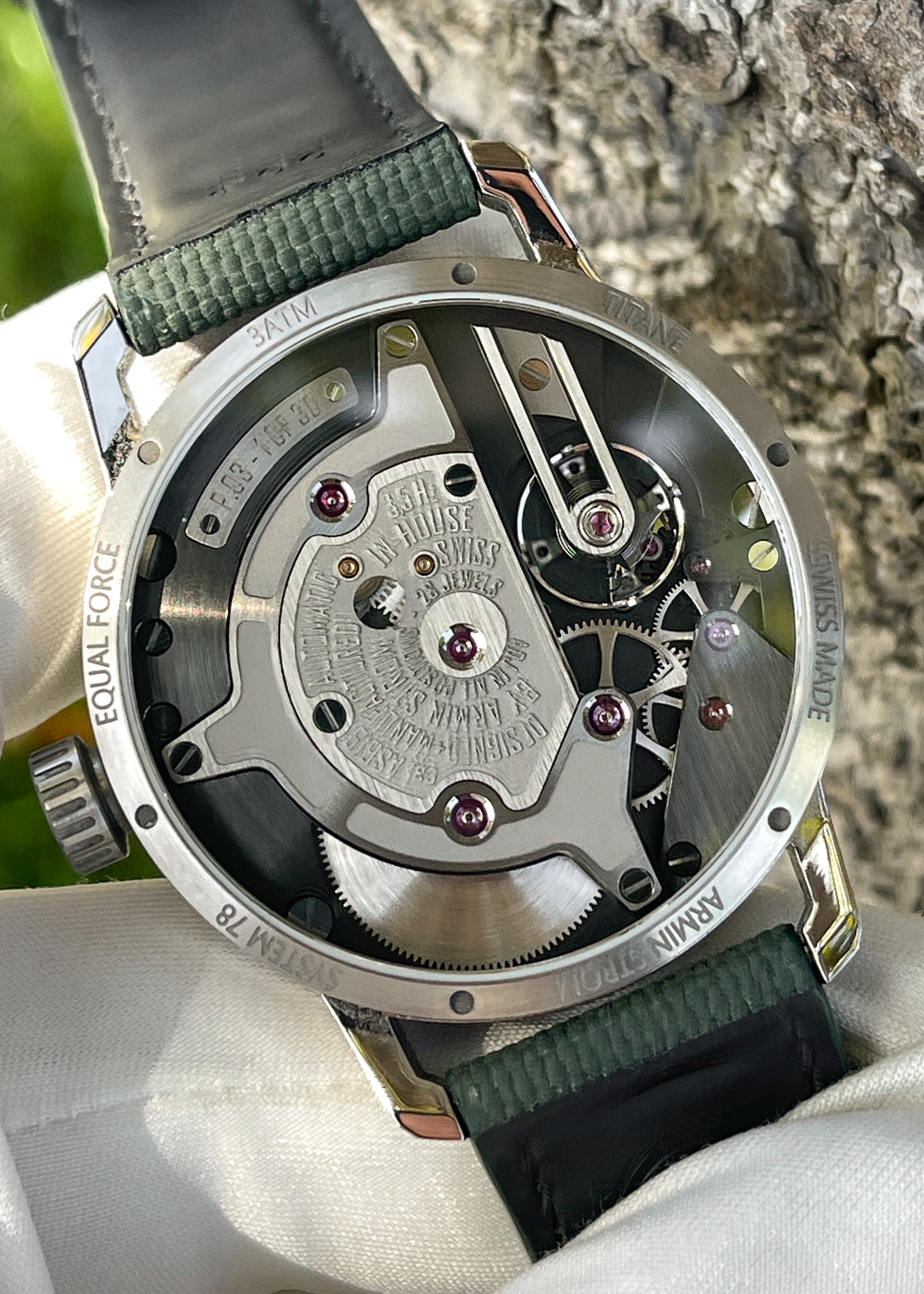 The movement is Armin Strom's signature Gravity Equal Force calibre, the world’s first automatic winding watch with constant force transmission. The movement operates at an uncommon 25,200 vibrations per hour or 3.5 Hz. The watch is automatic winding by way of a micro-rotor positioned at 1 o'clock on the dial side and has a 72 hour power reserve.