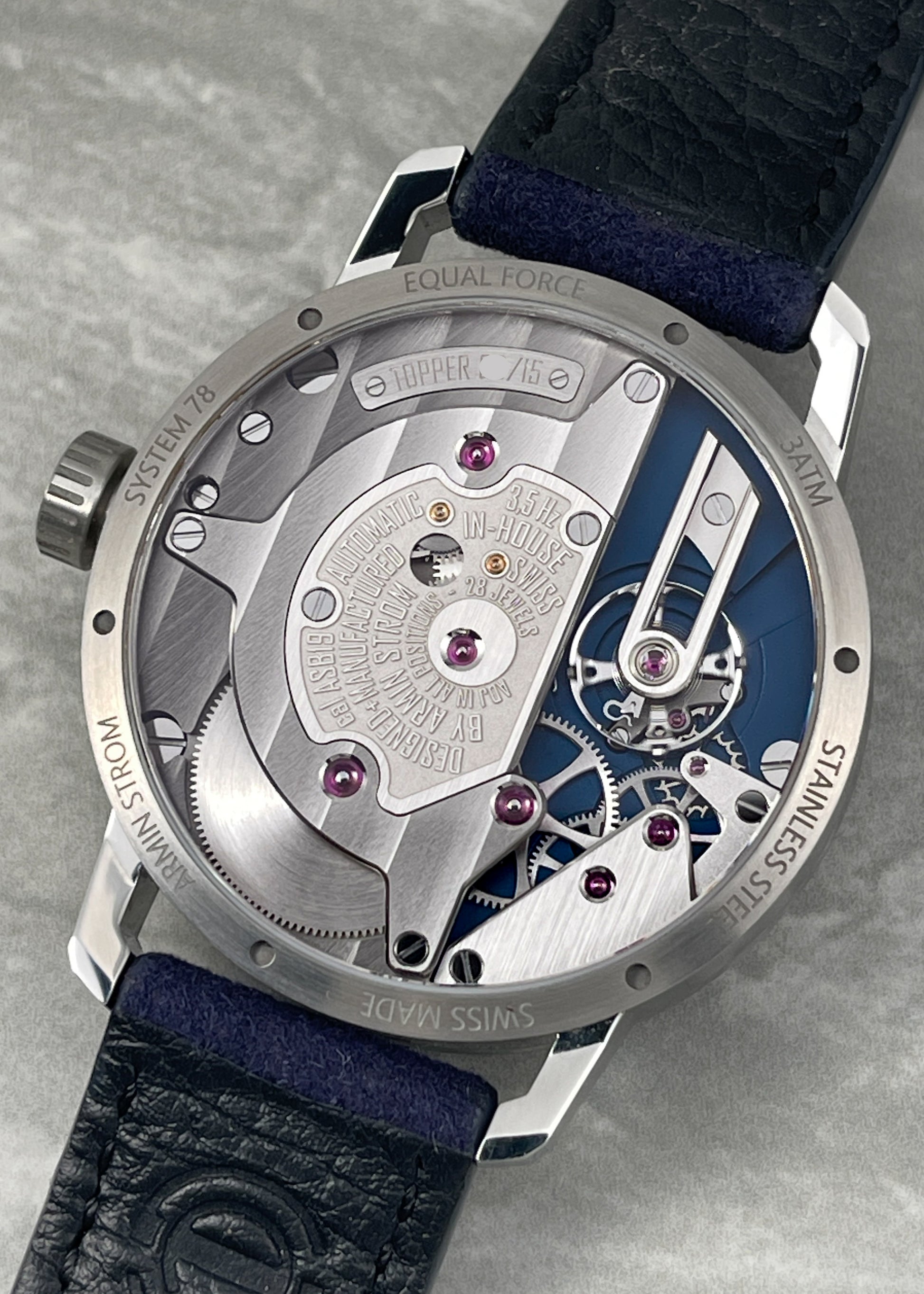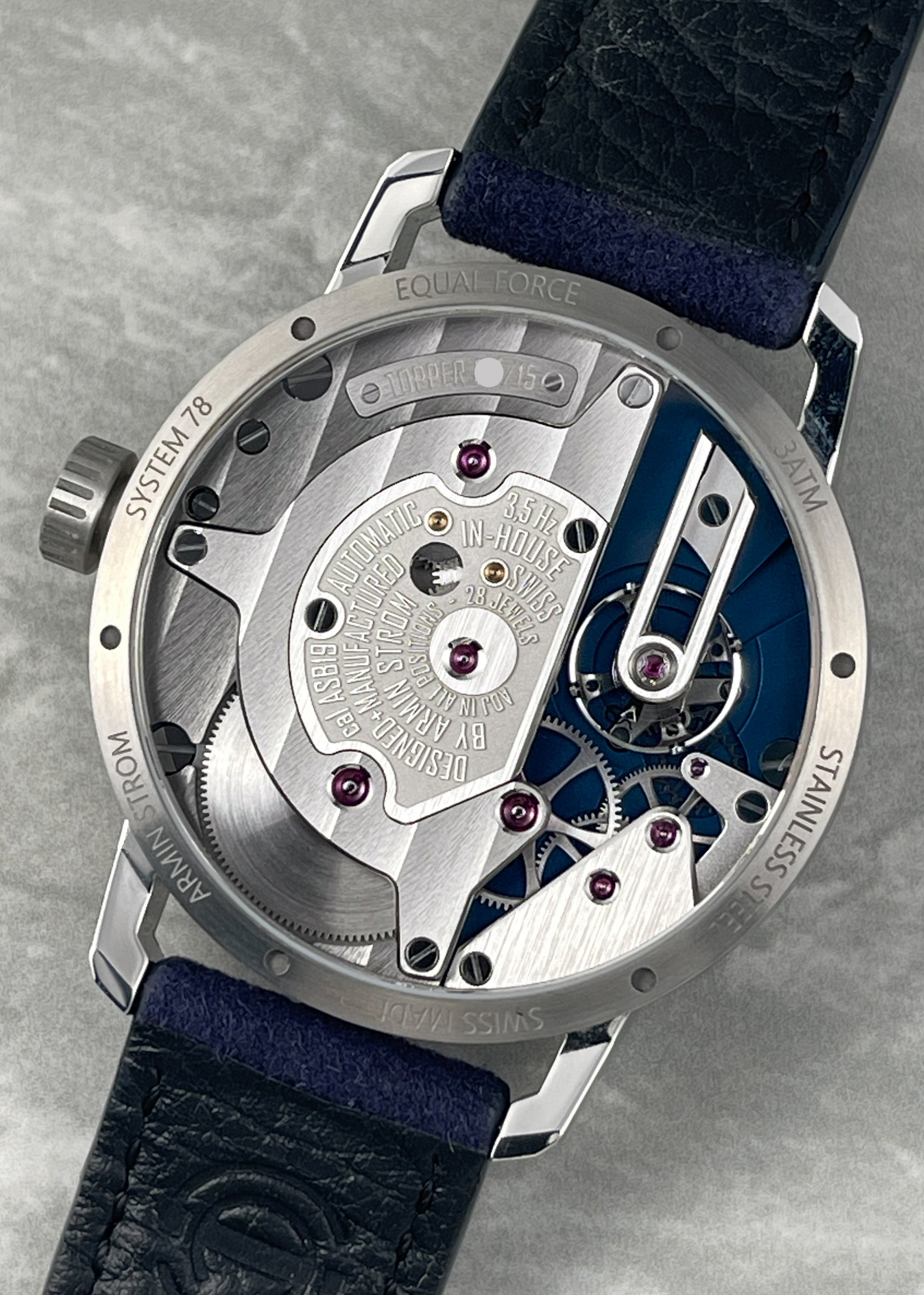 The movement is Armin Strom's signature Gravity Equal Force calibre, the world’s first automatic winding watch with constant force transmission. The movement operates at an uncommon 25,200 vibrations per hour or 3.5 Hz. The watch is automatic winding by way of a micro-rotor positioned at 1 o'clock on the dial side and has a 72 hour power reserve.