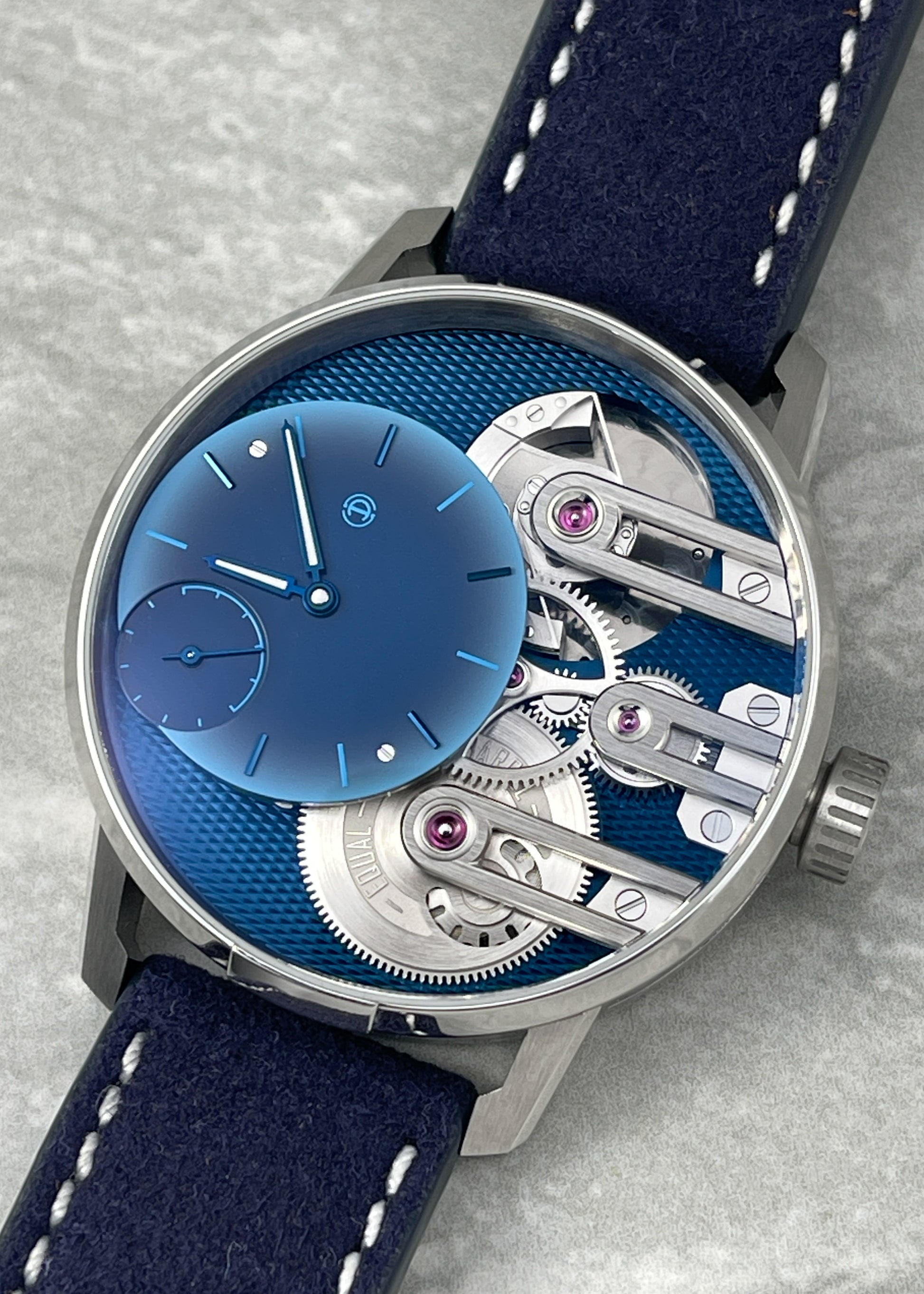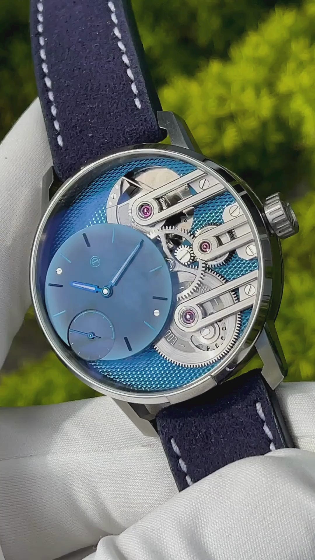 Give your wrist the blues in the best way possible with the Armin Strom Gravity Equal Force "Tranquility” Topper Edition. Featuring a ‘grain d’orge’ guilloché backplate executed by the workshop of Kari Voutilainen and a fumé dial which is darkest in the center and lightens at the periphery.