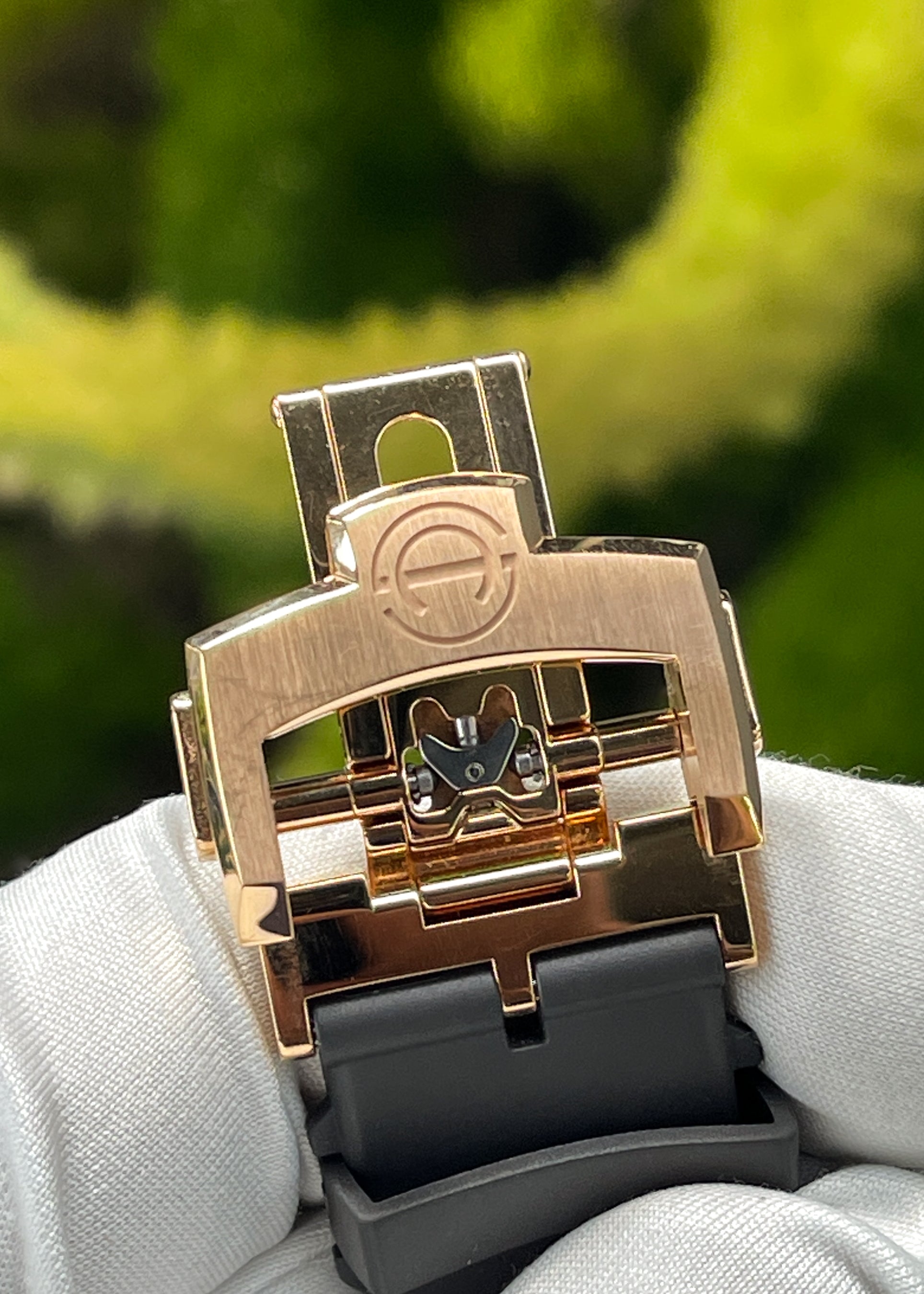 18k Rose Gold case measures 43.4mm x 13mm x 50.95mm lug-to-lug. Please refer to the video in slide 3 for condition of the case. Power reserve is 48 hours spread across two skeletonized barrels.
