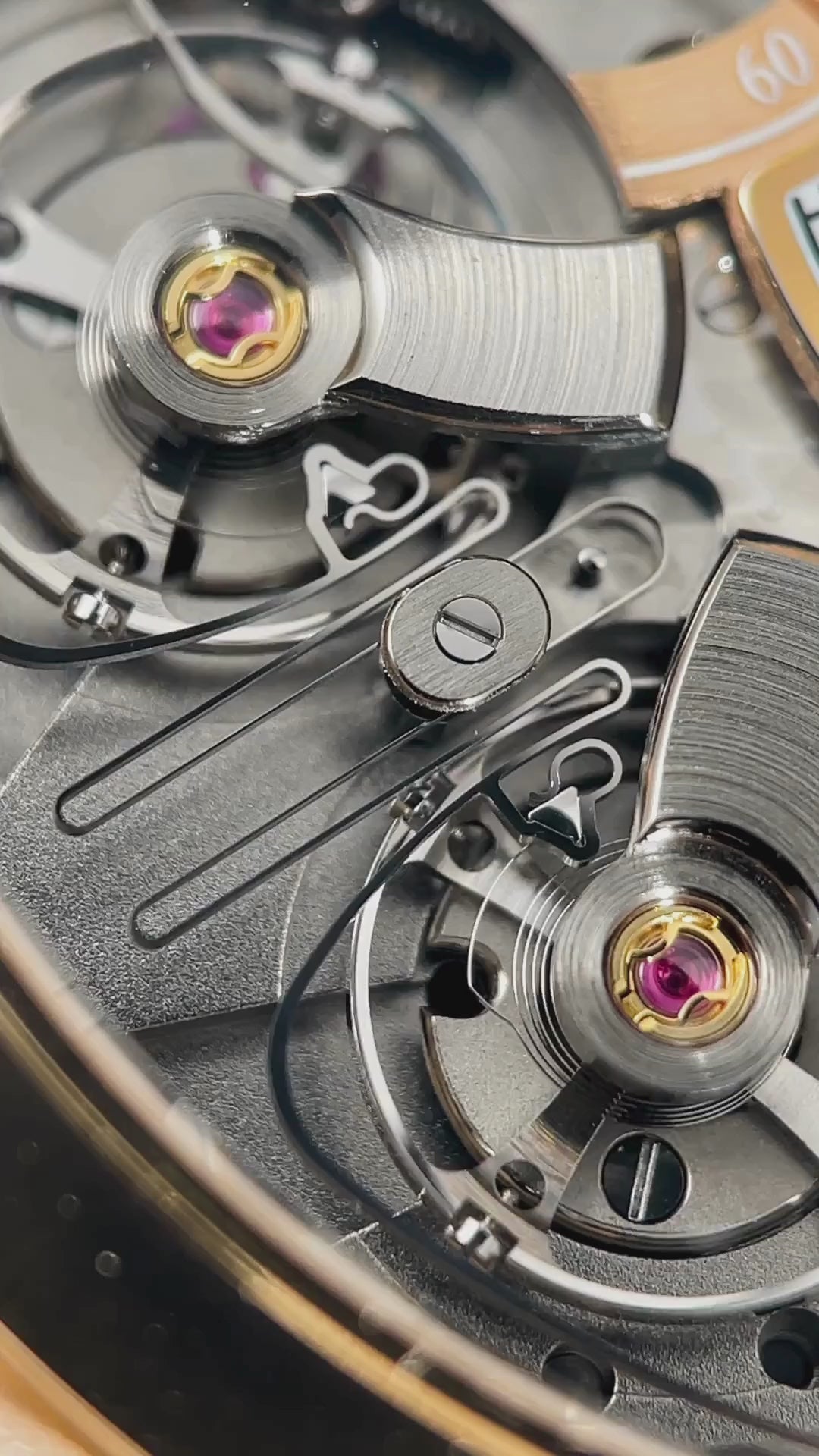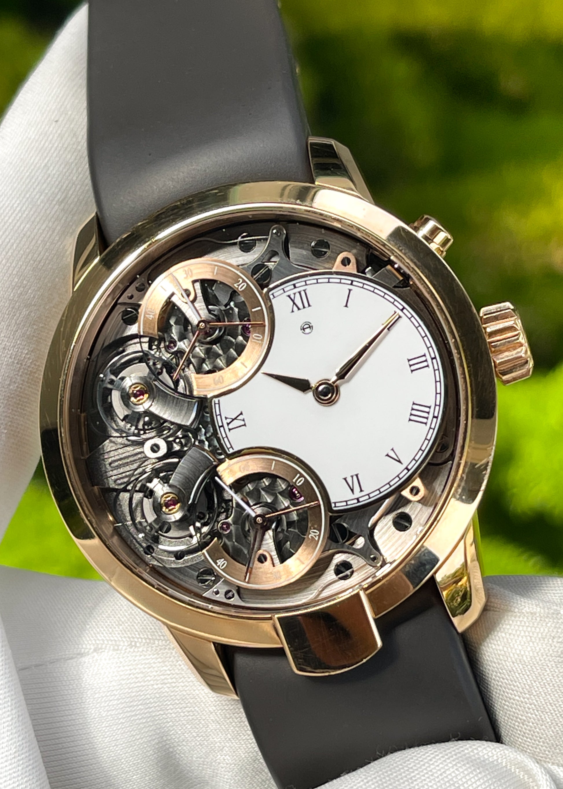 An utterly show-stopping watch from Armin Strom is this Mirrored Force Resonance in rose gold with grand feu enamel dial. Resonance is the phenomenon when two oscillators with the same natural frequency vibrate in synchronization resulting in a stable rate. The few watchmakers today offering Resonance watches each go about it in their own way. Armin Strom achieves this with a clutch spring that provides direct linkage between the two balance springs, allowing energy to transfer efficiently between the two balance wheels. Resonance doesn't happen instantaneously, however Armin Strom's method fosters synchronicity faster than others... sometimes within minutes.