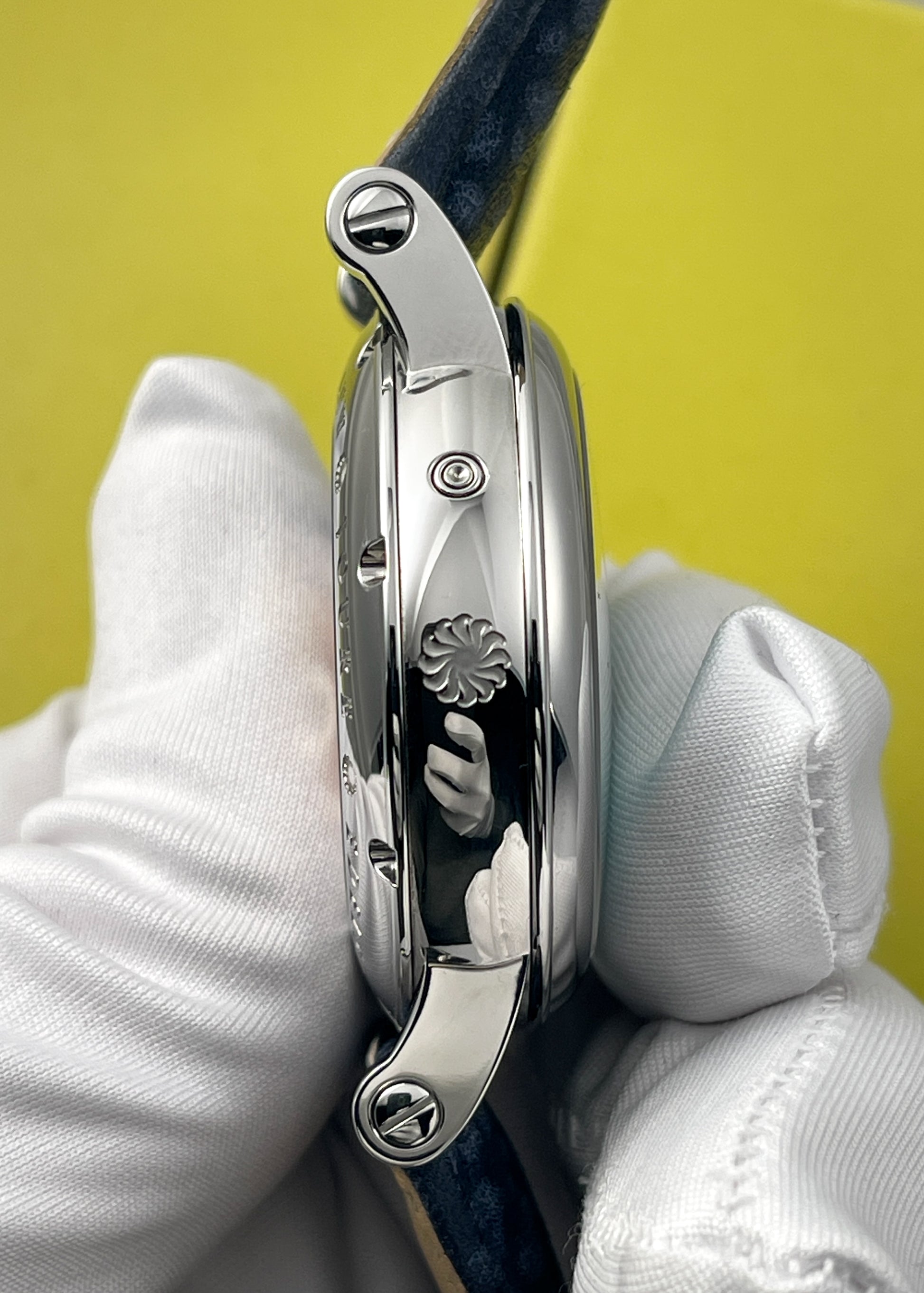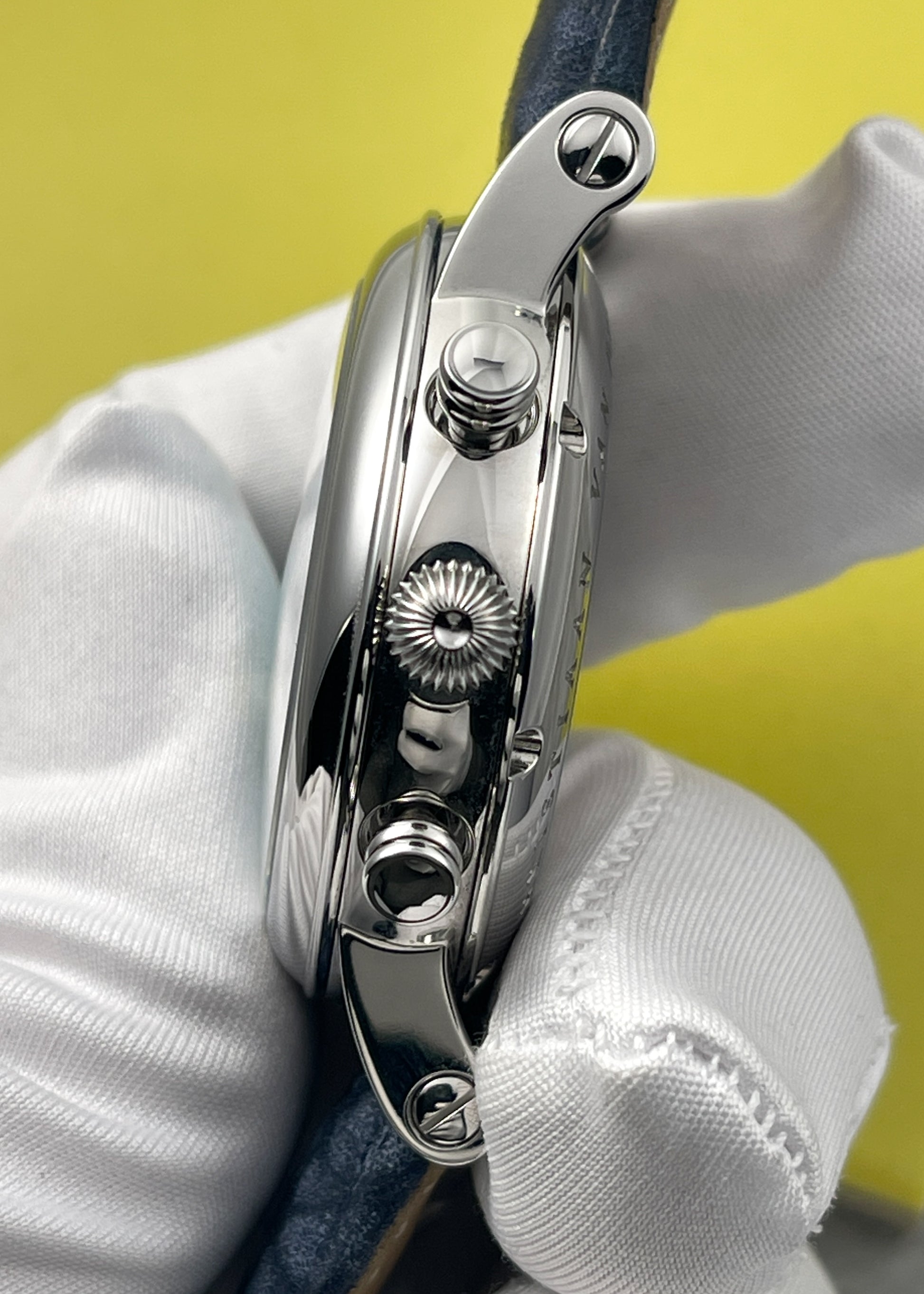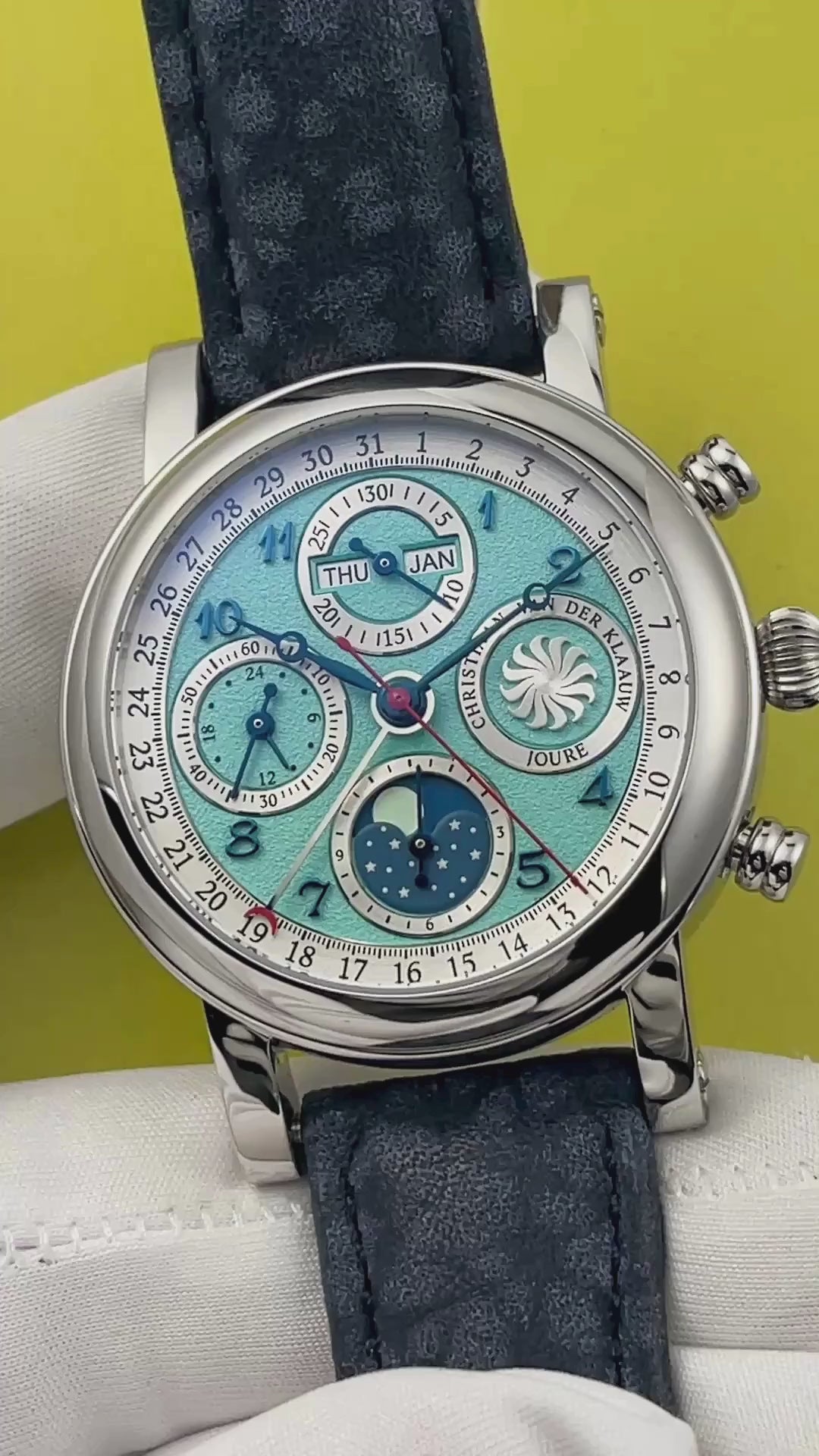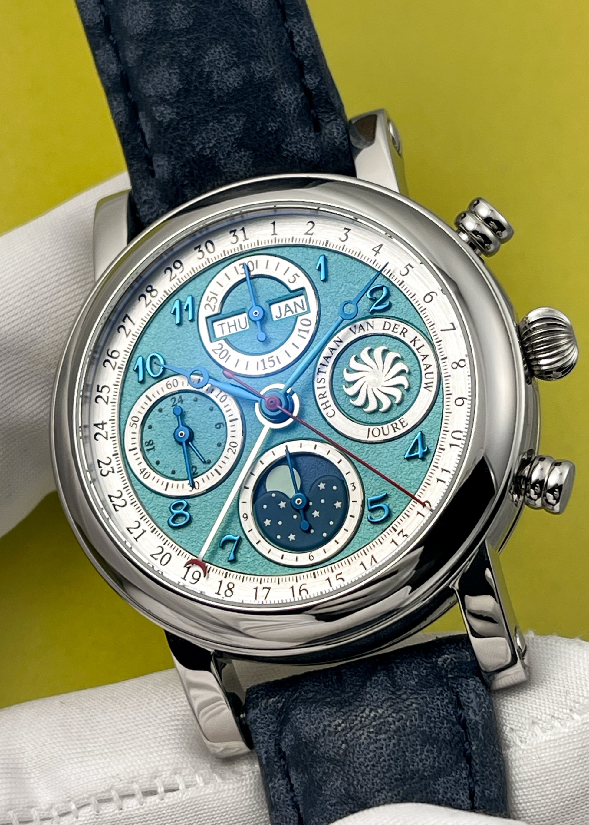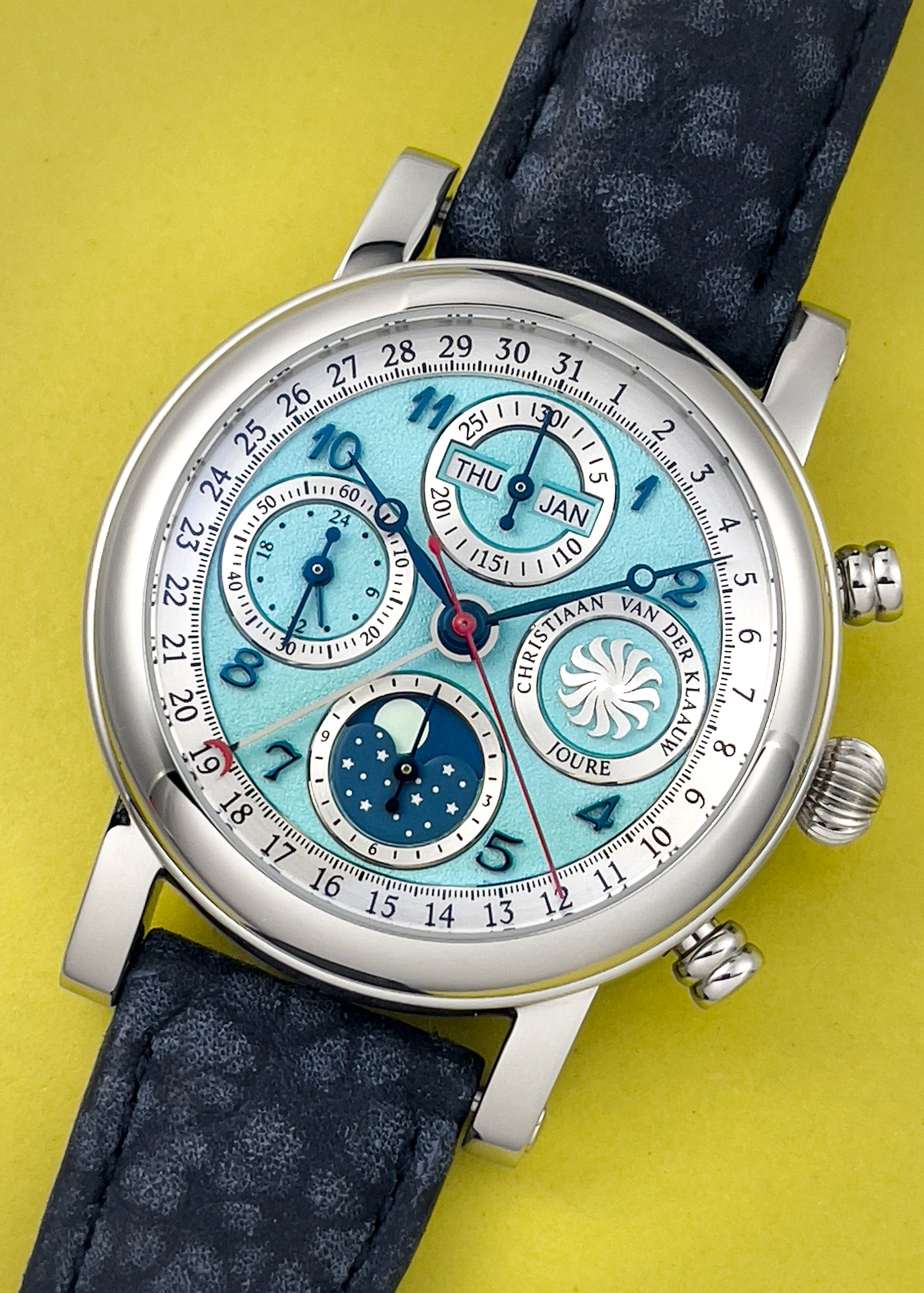 Presenting a stunning Special Edition version of CvdK's Ariadne series of watches for Reijersen. Blued Breguet numerals and blued steel hands sit atop a lovely grained Tiffany blue dial. The watch features day, pointer date, month, chronograph, and moonphase complications. The moonphase and calendar are set through the crown, with exception to the day of the week which is easily adjusted via a dimple depressor on the 10 o'clock side of the case.