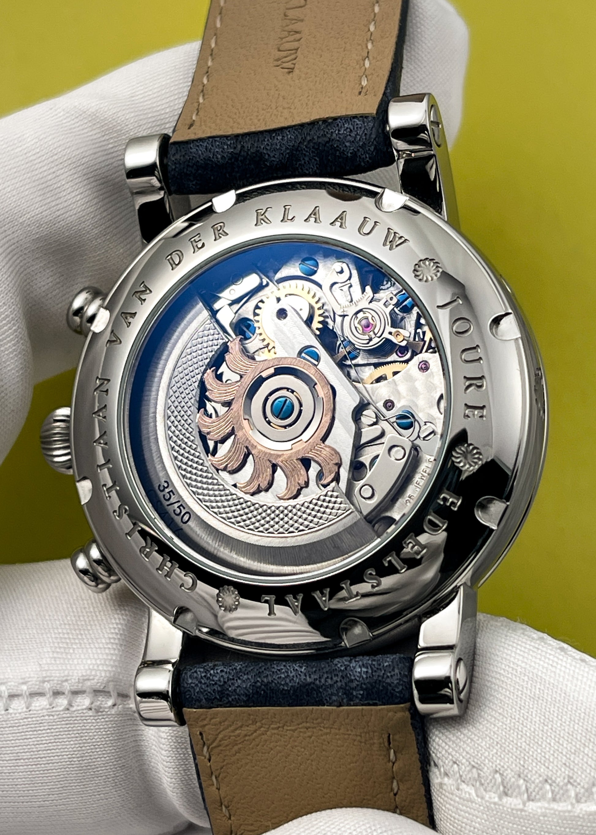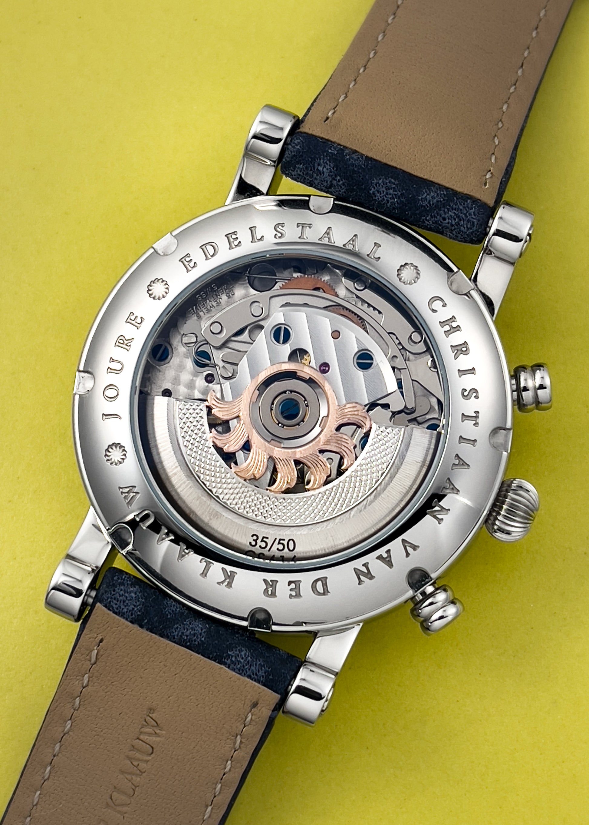 The reverse side reveals views of the Valjoux 7751 caliber underneath a custom engraved rotor by Jochen Benzinger, marked with the Special Edition #35/50. The movement operates at 4 Hz and has 48 hours of Power Reserve.