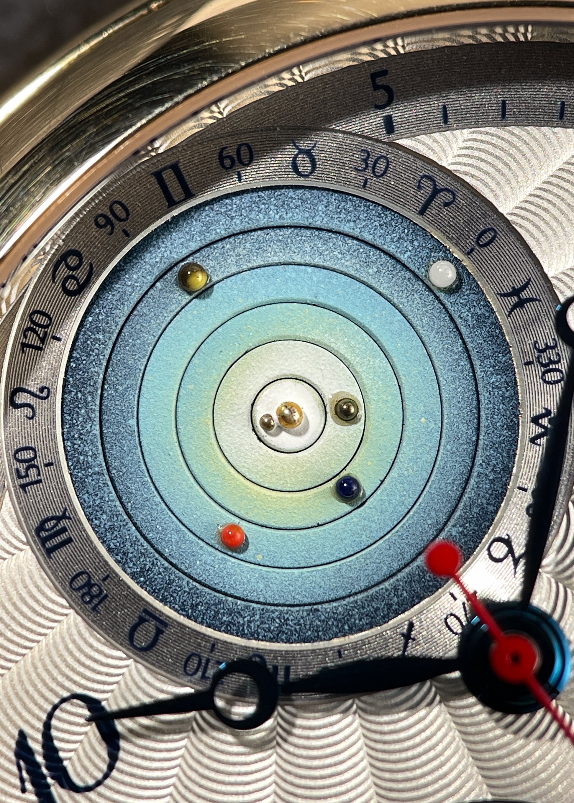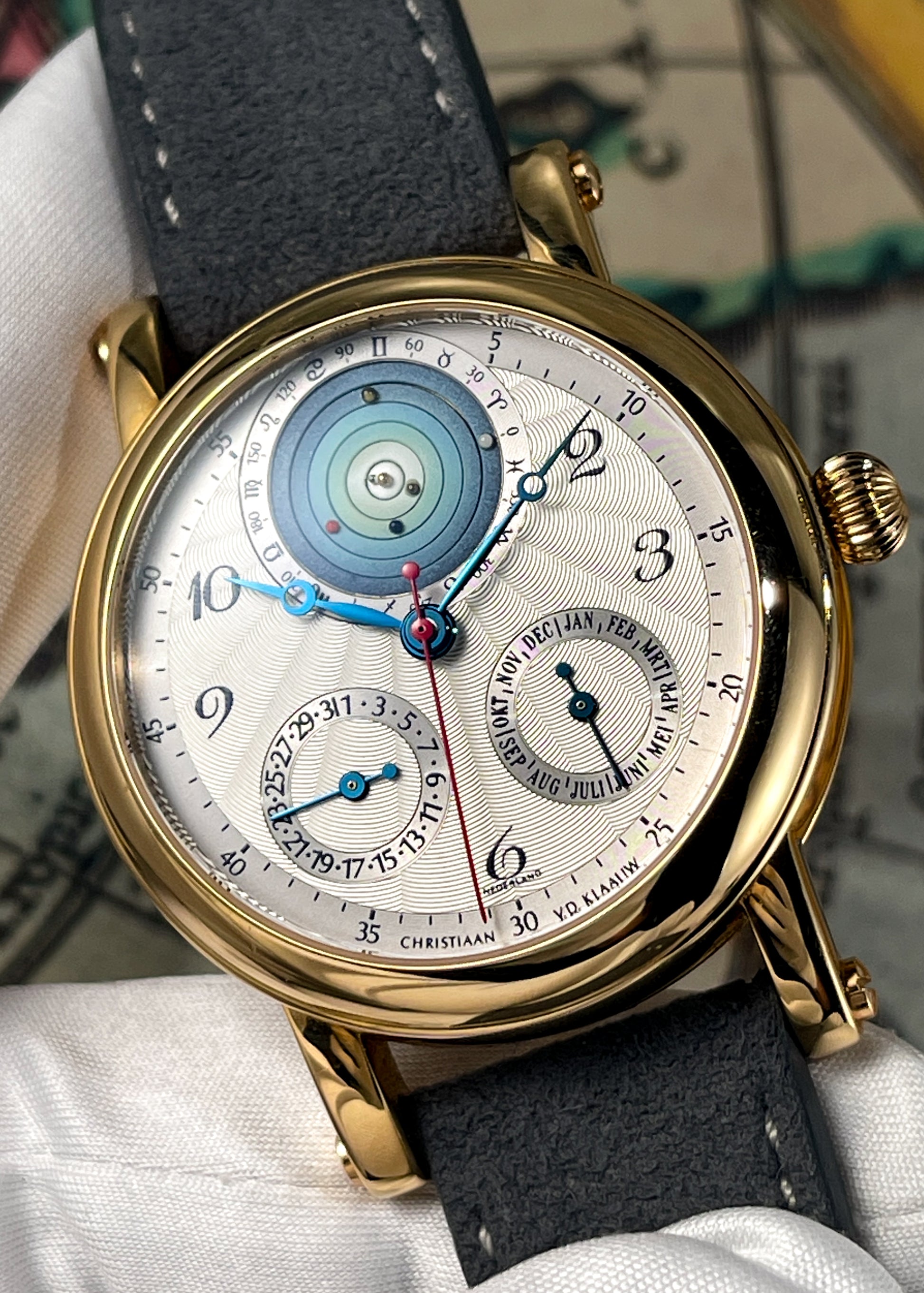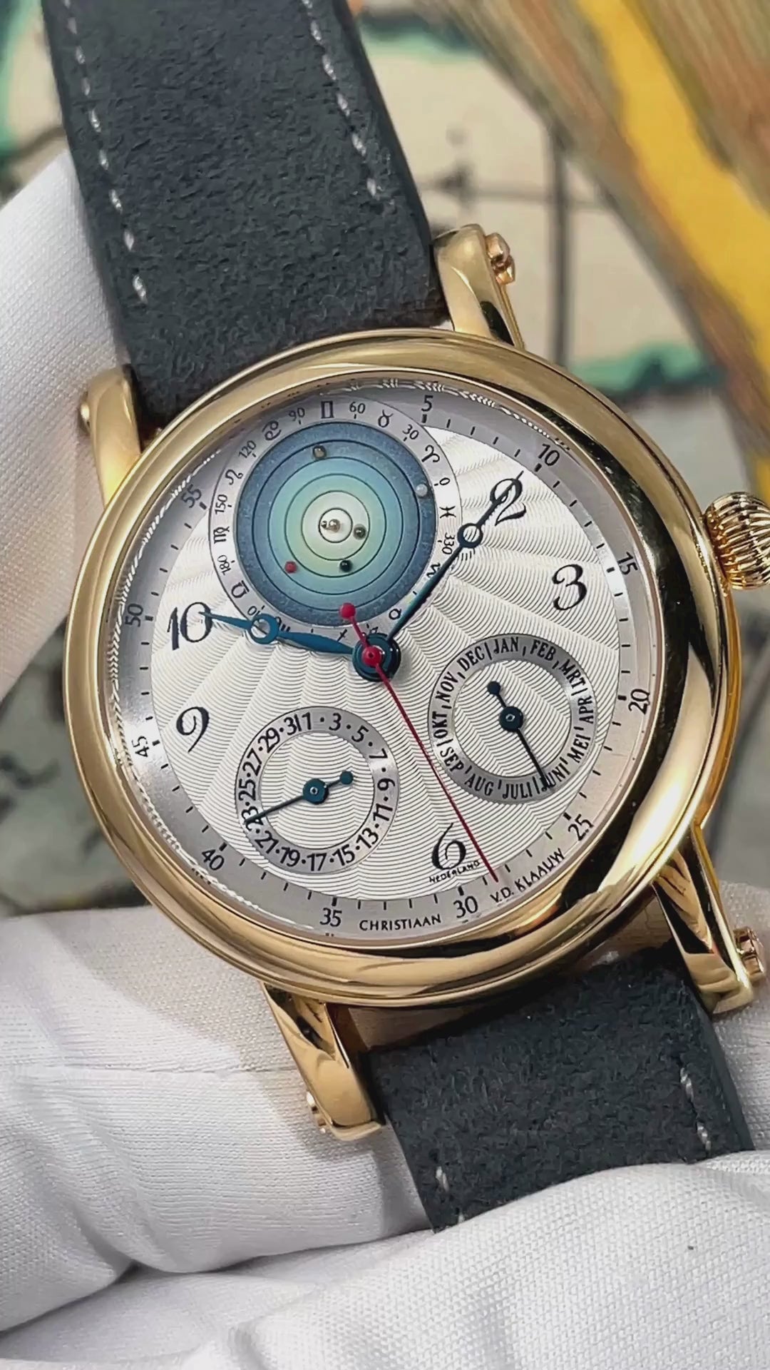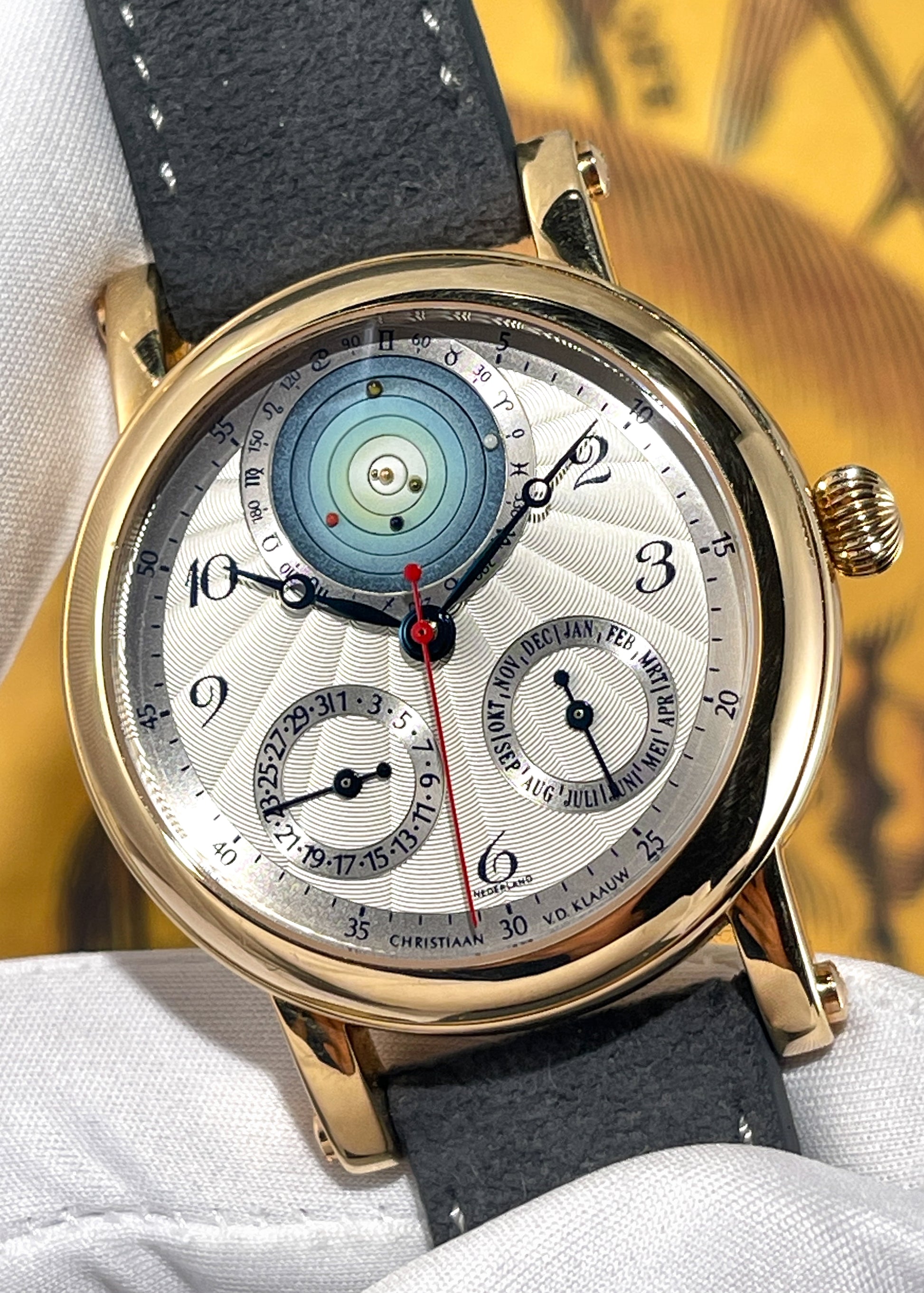 At Horology By The Sea, we are thrilled to present an extraordinary example of the Planetarium Millennium by the revered Dutch Independent Watchmaker, Christiaan van der Klaauw. Found in the upper subdial is the Complication de Résistance... van der Klauuw's incredible heliocentric Planetarium module which brings our solar system to life. Mercury, Venus, Earth, Mars, Jupiter, and Saturn orbit the Sun in real time- their movements meticulously calculated to mirror their cosmic counterparts. Each planet travels at its own natural pace... Mercury orbits around the sun in a speedy 87.97 days, Earth every 365.24, while Saturn is clearly in no rush, encircling the subdial once every 29.46 years.