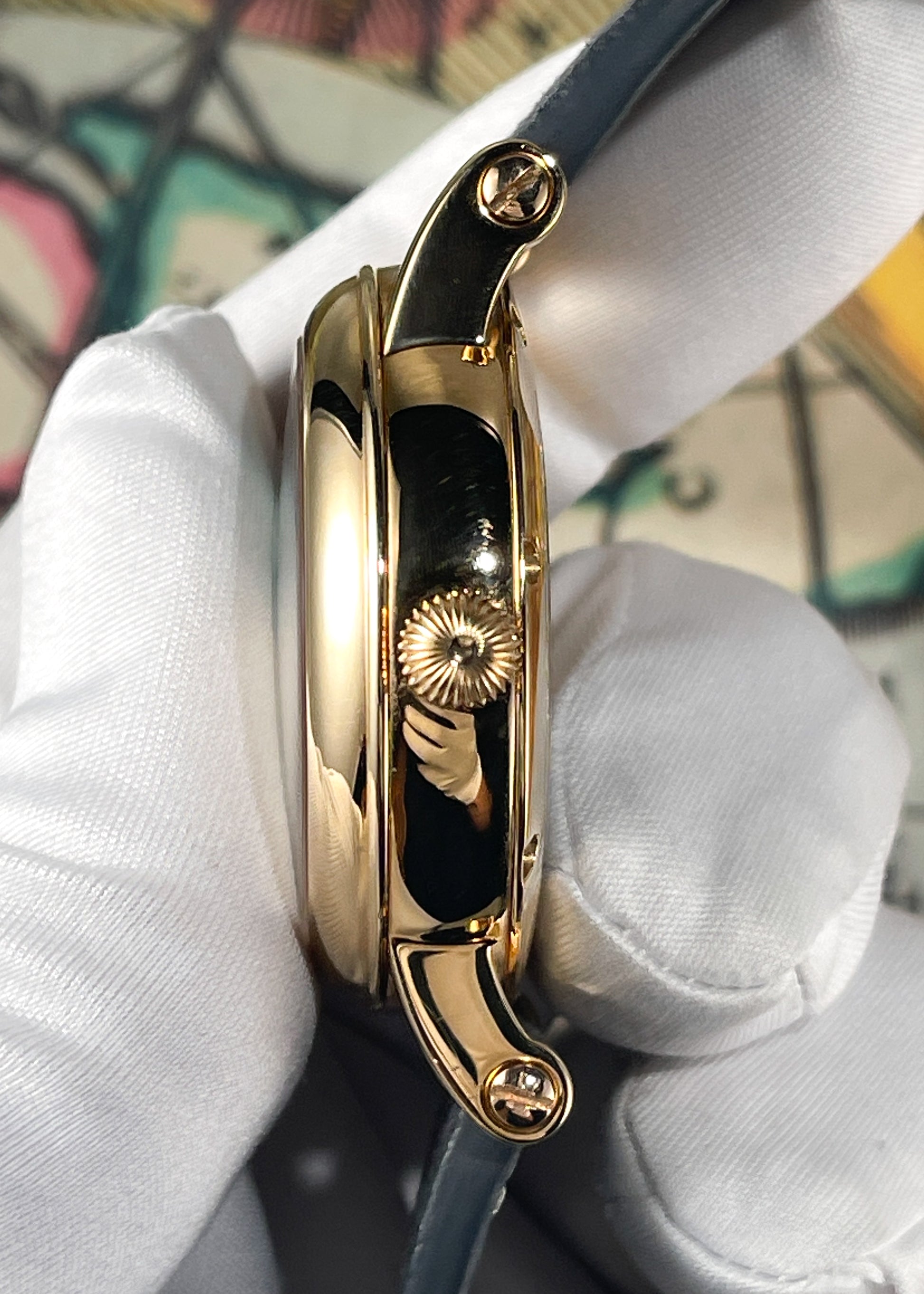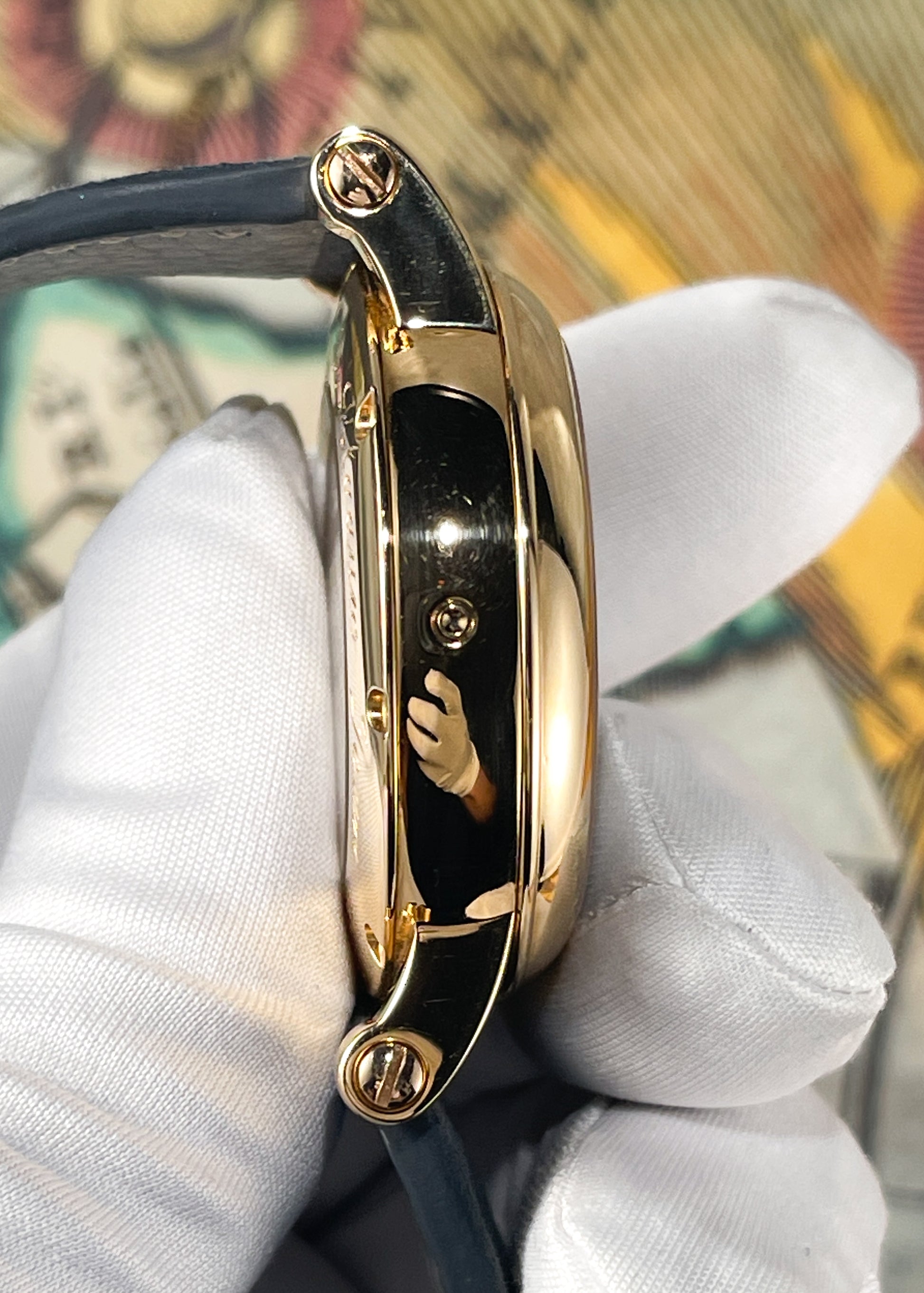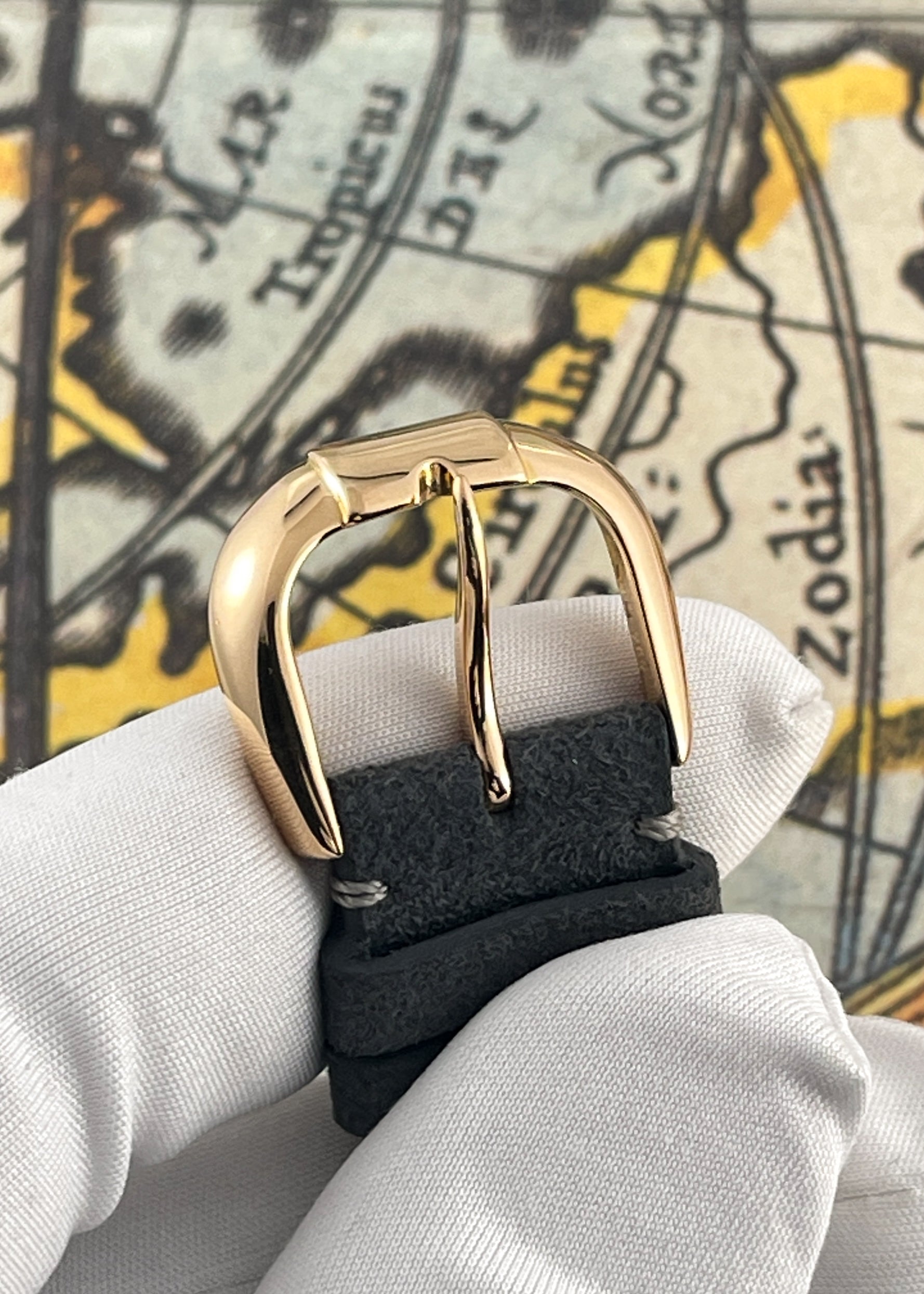 The 18 Karat Rose Gold case measures 40mm x 13.2mm x 50mm lug-to-lug. Complete with Box/Watchwinder (missing power plug) and Papers dated October 16th, 2002. Furnished on a custom made strap by Aaron Bespoke and an original CvdK rose gold pin buckle. This watch underwent a Complete Overhaul at the CvdK atelier in the Netherlands August 2019.