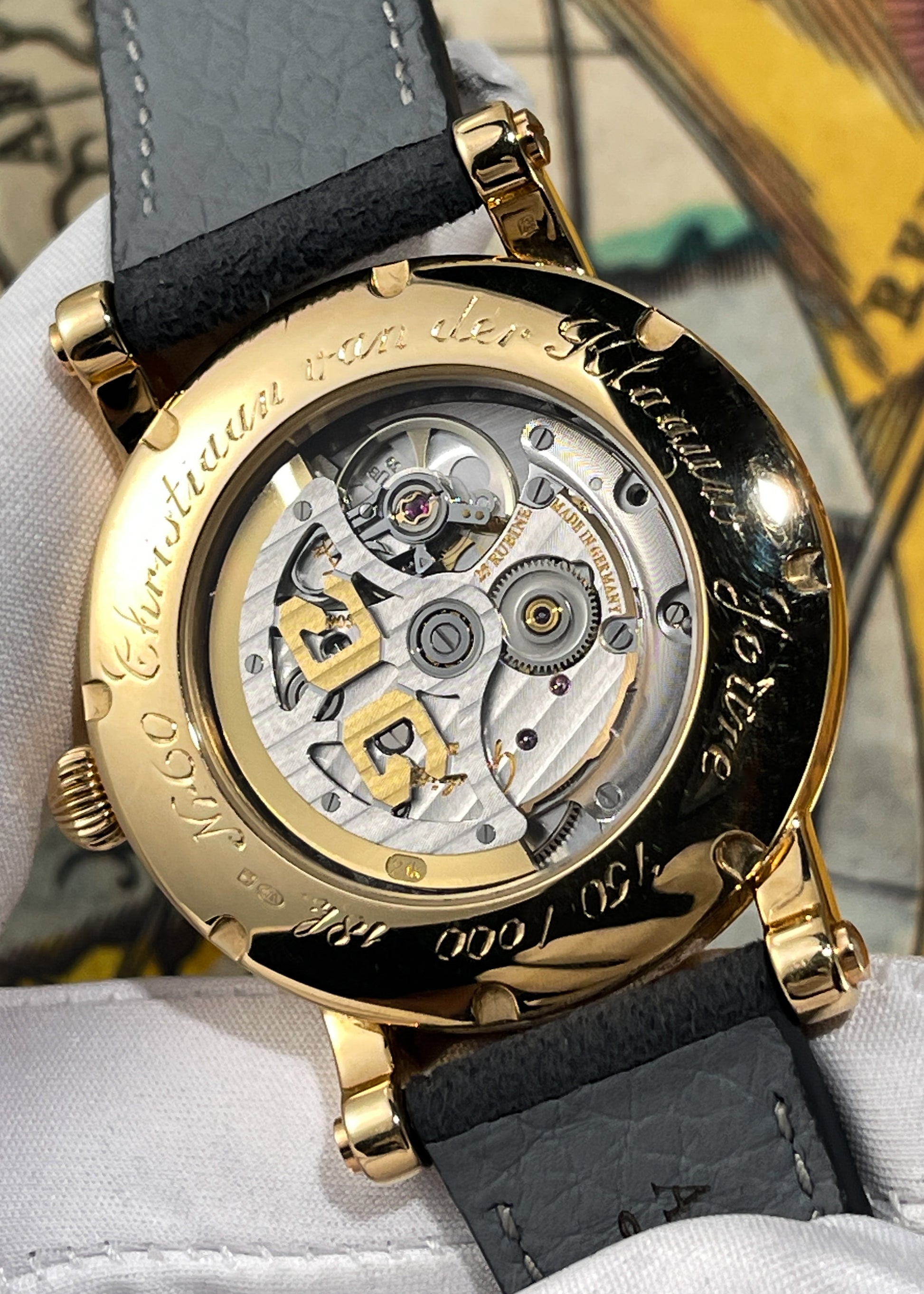 The reverse side serves as a charming time capsule for the earlier days of the CvdK brand. One will immediately notice the use of a Glashütte Original automatic winding caliber, complete with their familiar mirrored G rotor. It is understood that at the time of creating this watch, Mr. van der Klaauw was not quite ready to introduce his own base movement to the project for it couldn't yet achieve adequate power to fuel the Planetarium module. Thus a relationship with Glashütte Original was created whereby they would provide him their Caliber 39 which was well suited for the task.