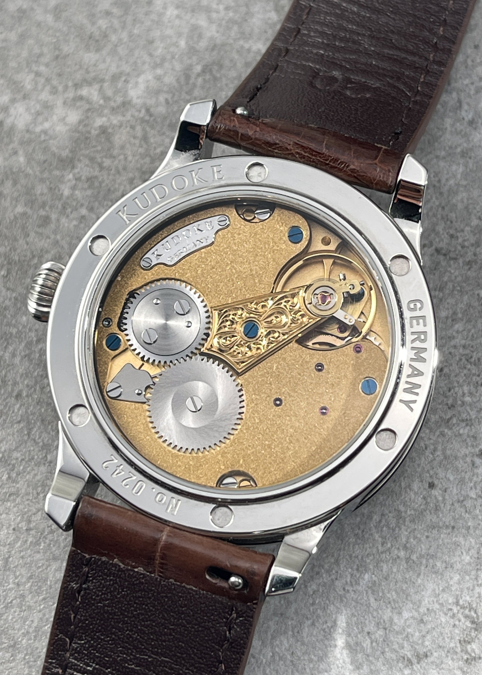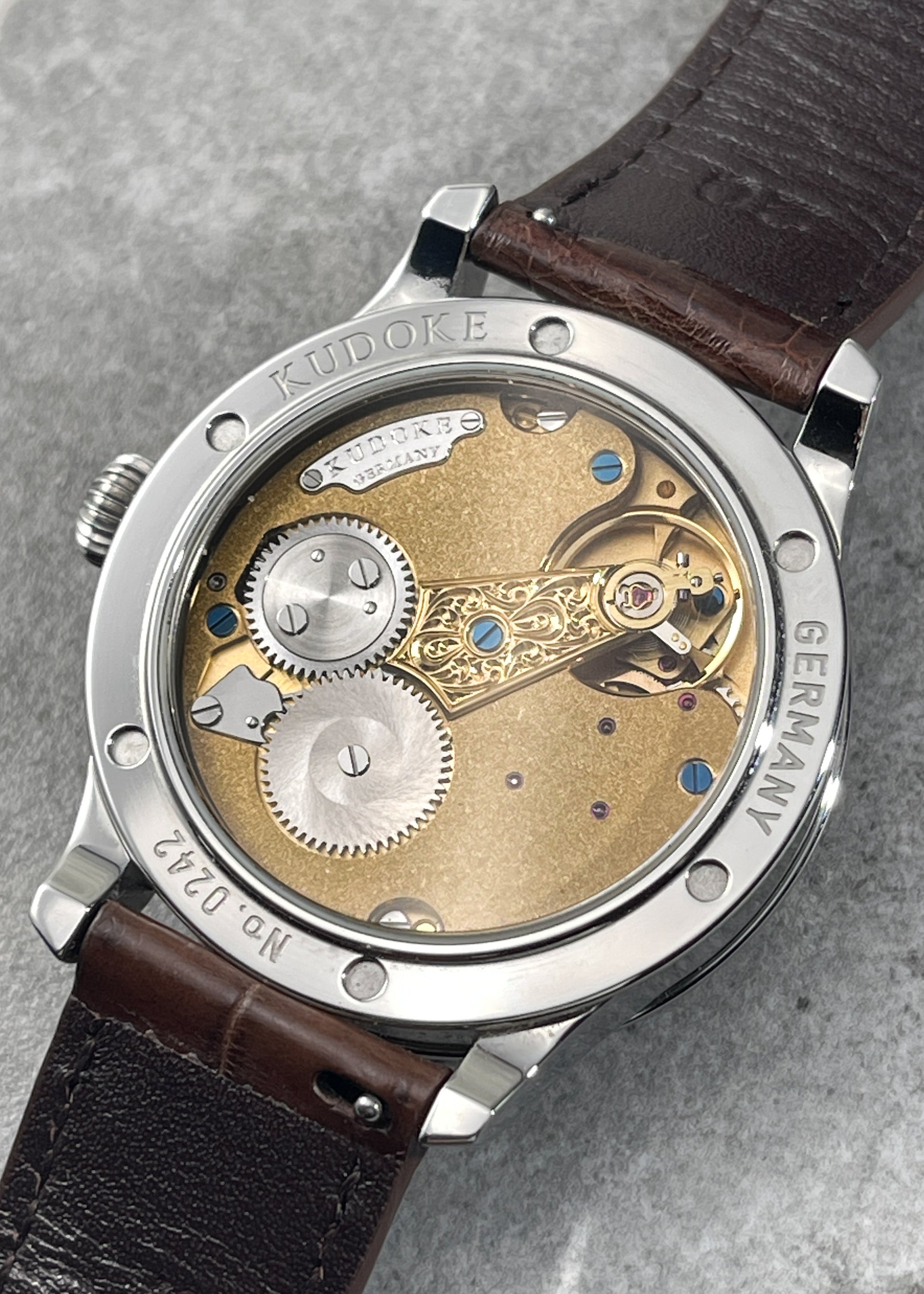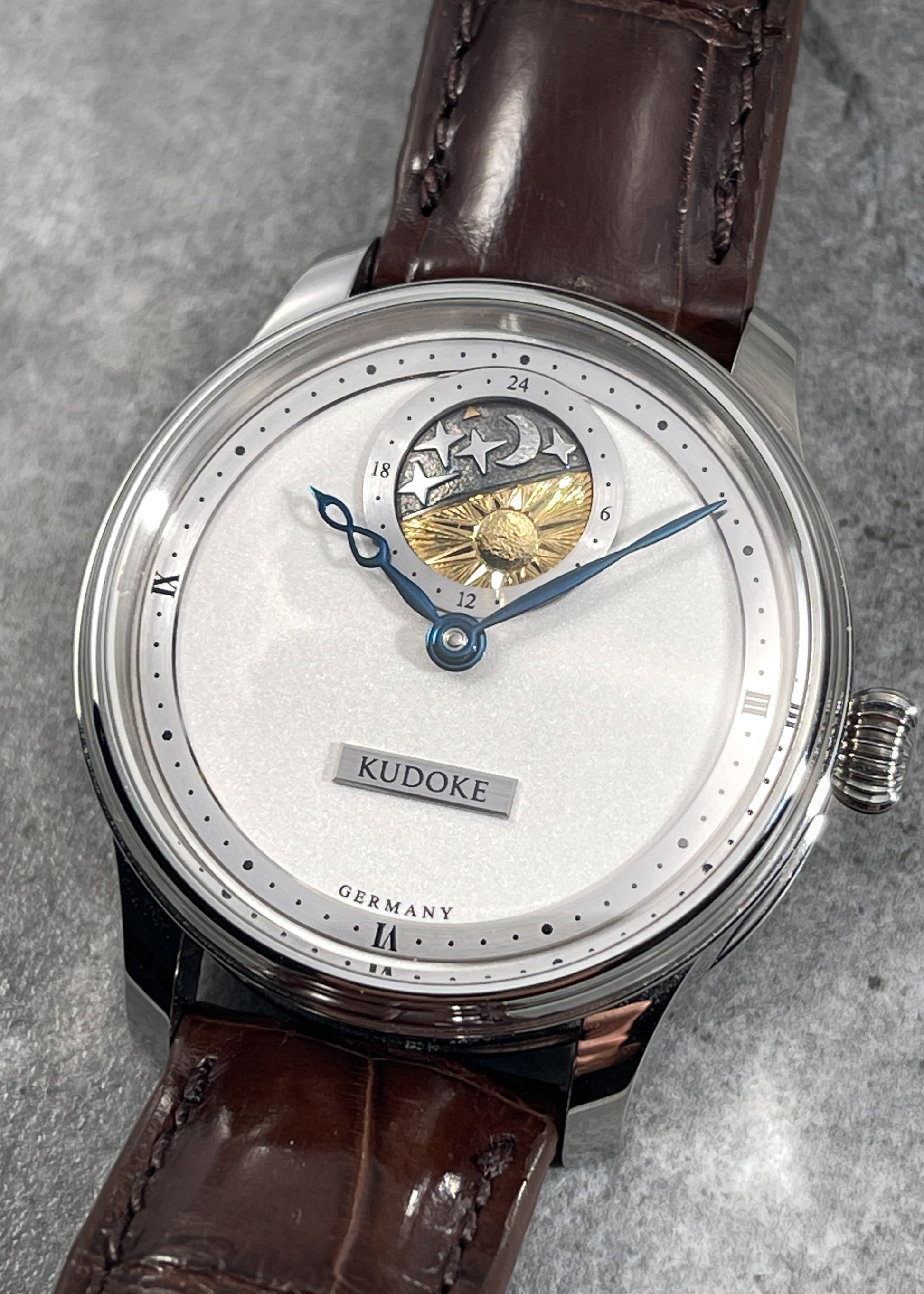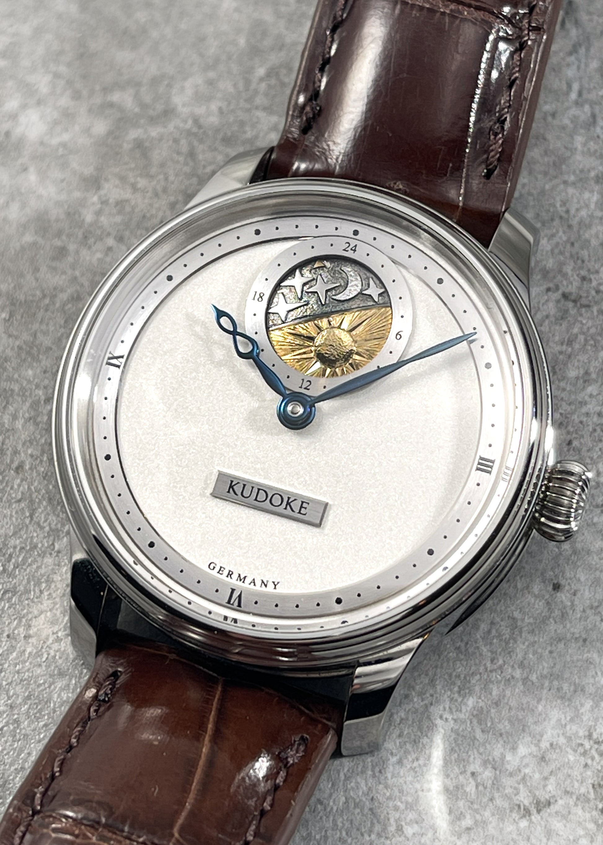 The frosted "bright silver" dial is the perfect choice for legibility against the blued steel infinity shaped hands. The rotating sky disc is hand engraved and makes one full rotation per day. Movement side we see Kudoke's Kaliber 1 lovingly engraved and hand finished.