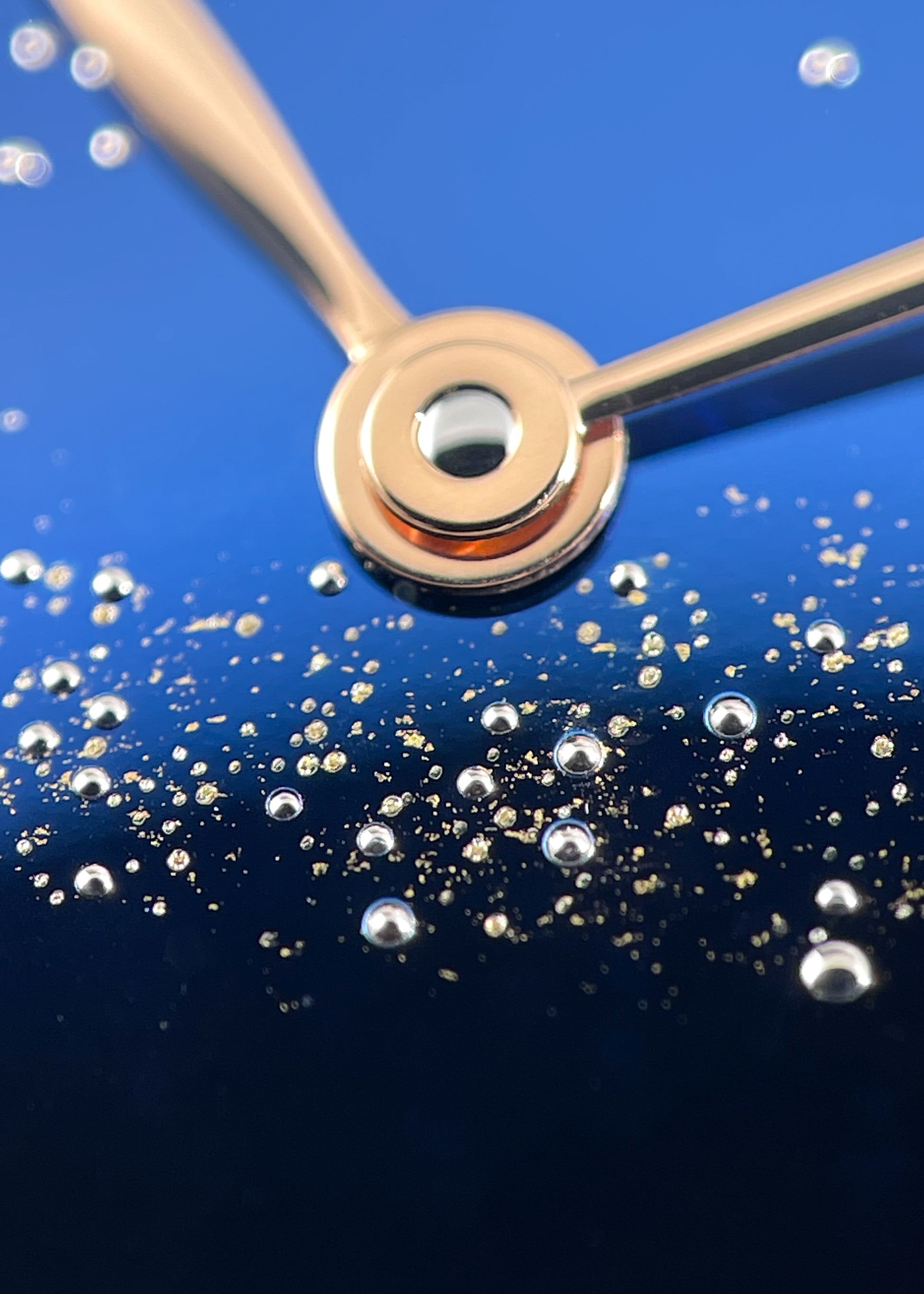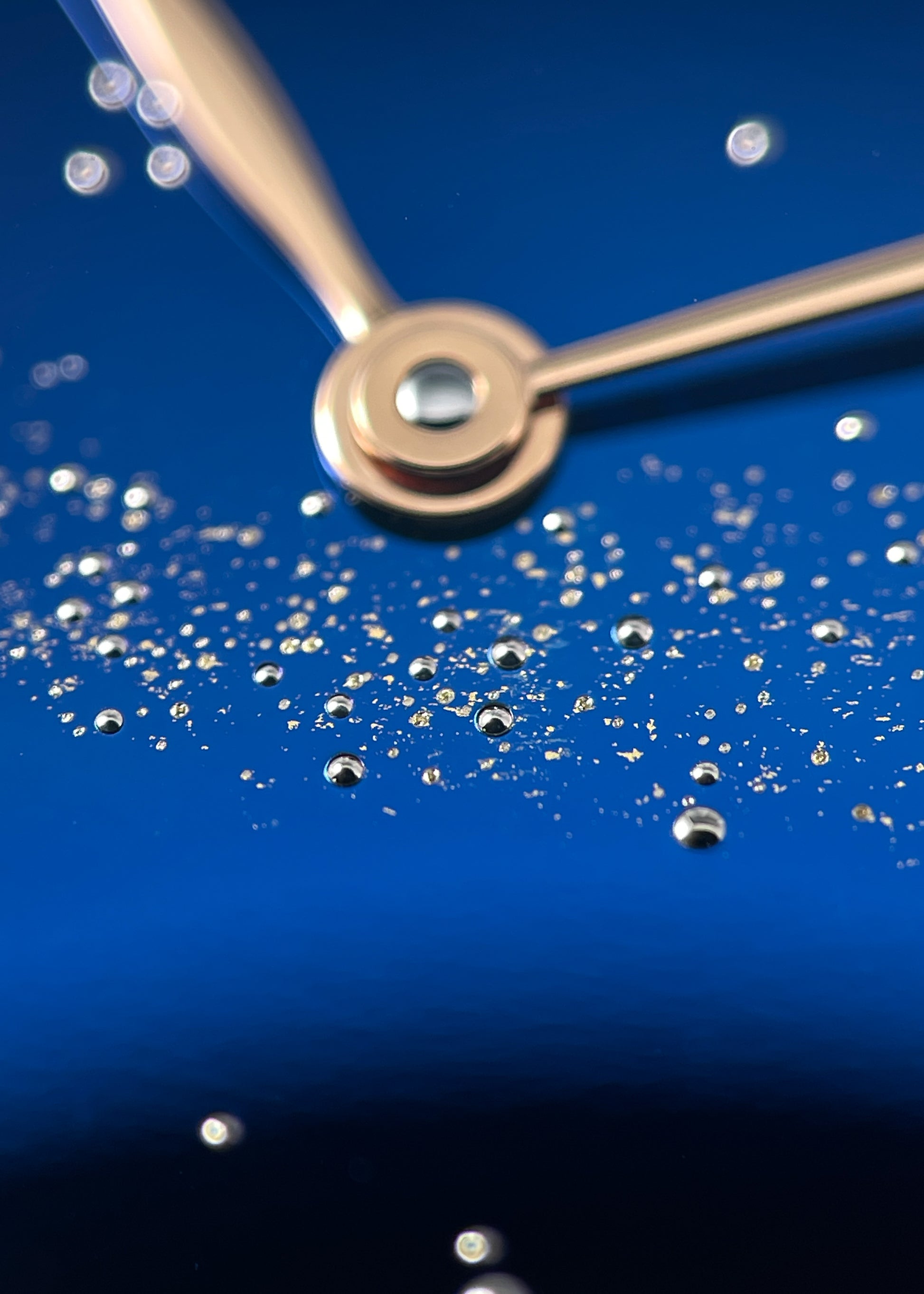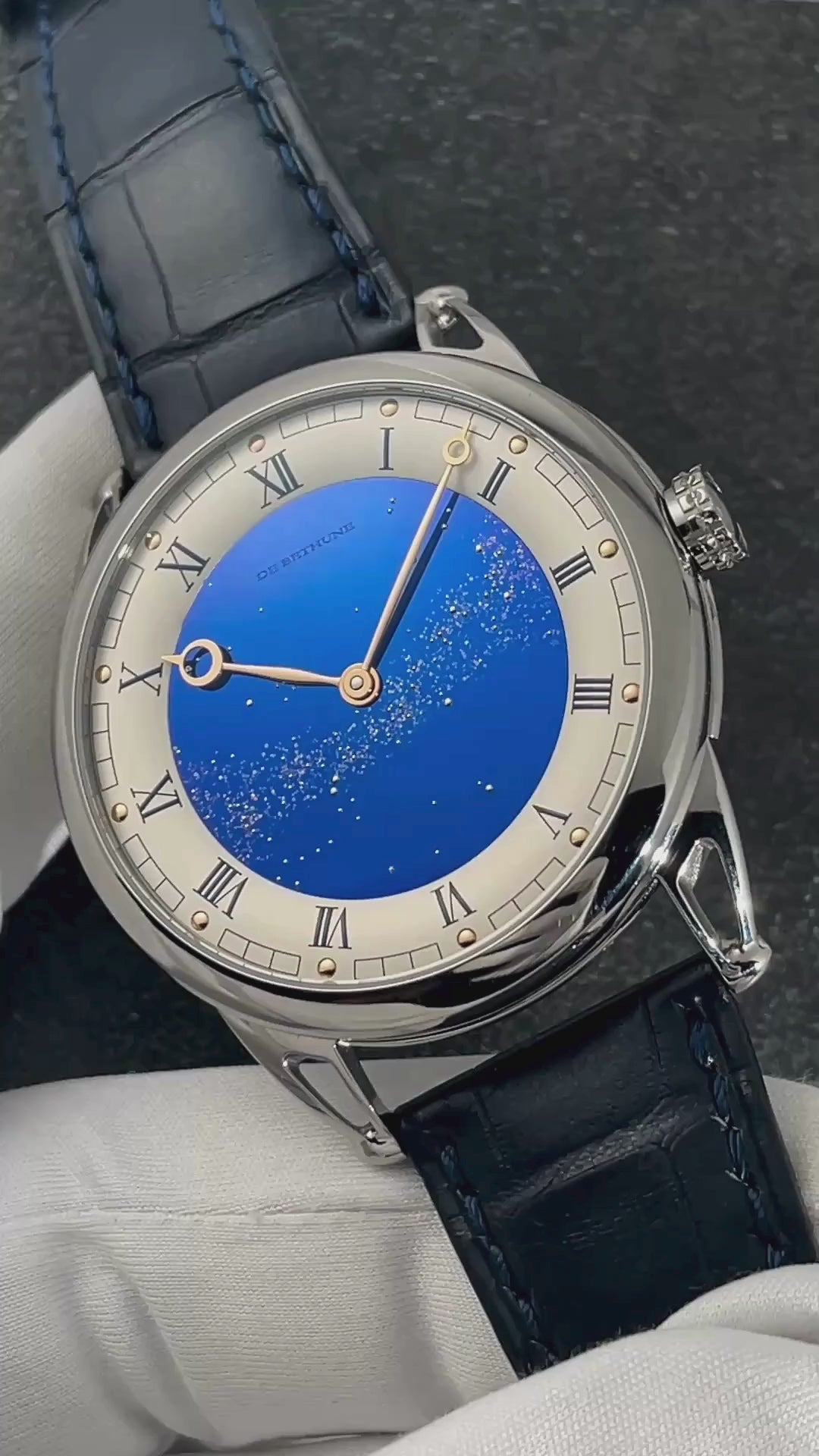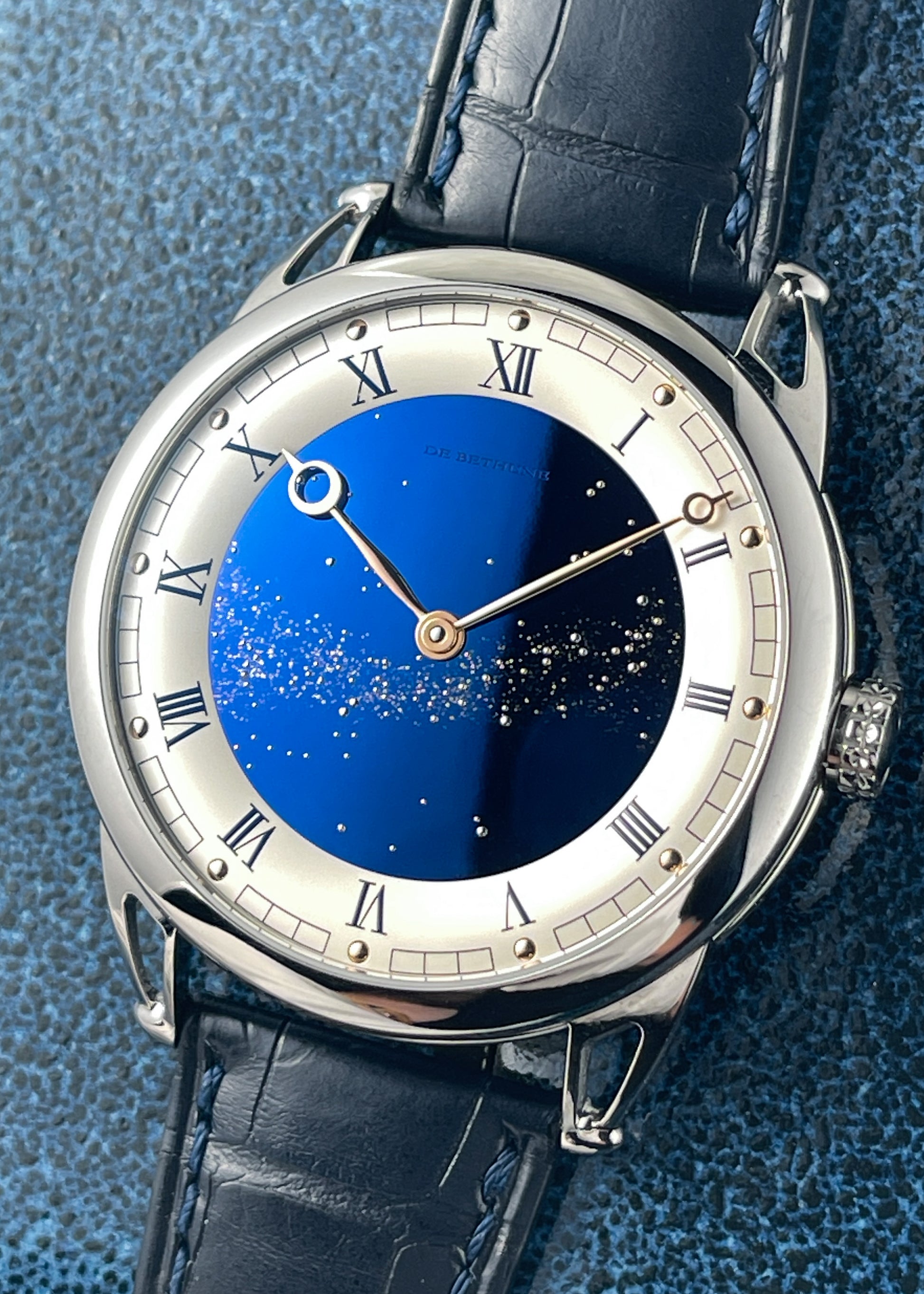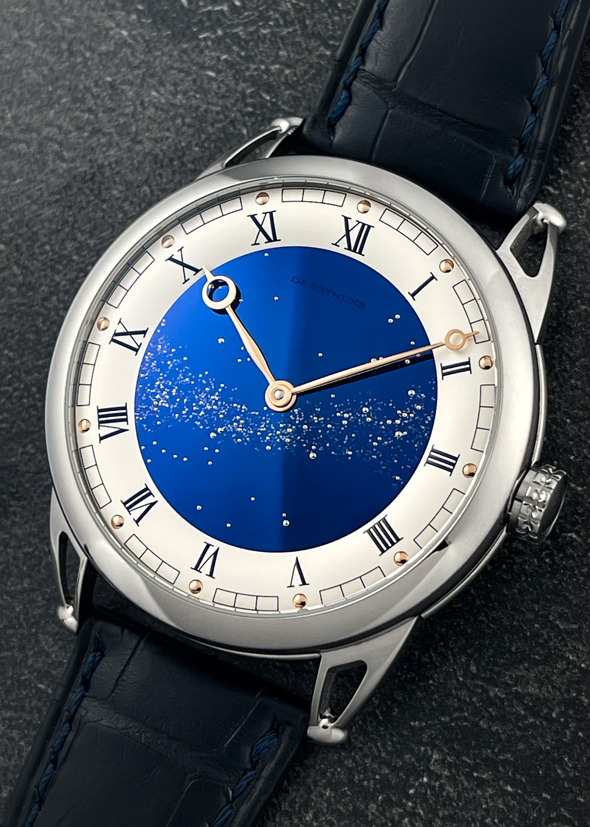 Discover the ethereal beauty of the De Bethune DB25 Starry Varius, a timepiece that captures the wonder of the cosmos with exquisite artistry. Underneath the hand-polished rose gold hands lies a mesmerizing titanium dial that has been heated blued and polished. The dial is then adorned with hand-fitted white gold pins to emulate the largest and nearest stars, while laser-milled Milky Way patterns, gilded with 24-carat gold leaf complete the celestial scene. On the periphery a silver-toned hours and minutes ring with polished rose gold hour-markers.