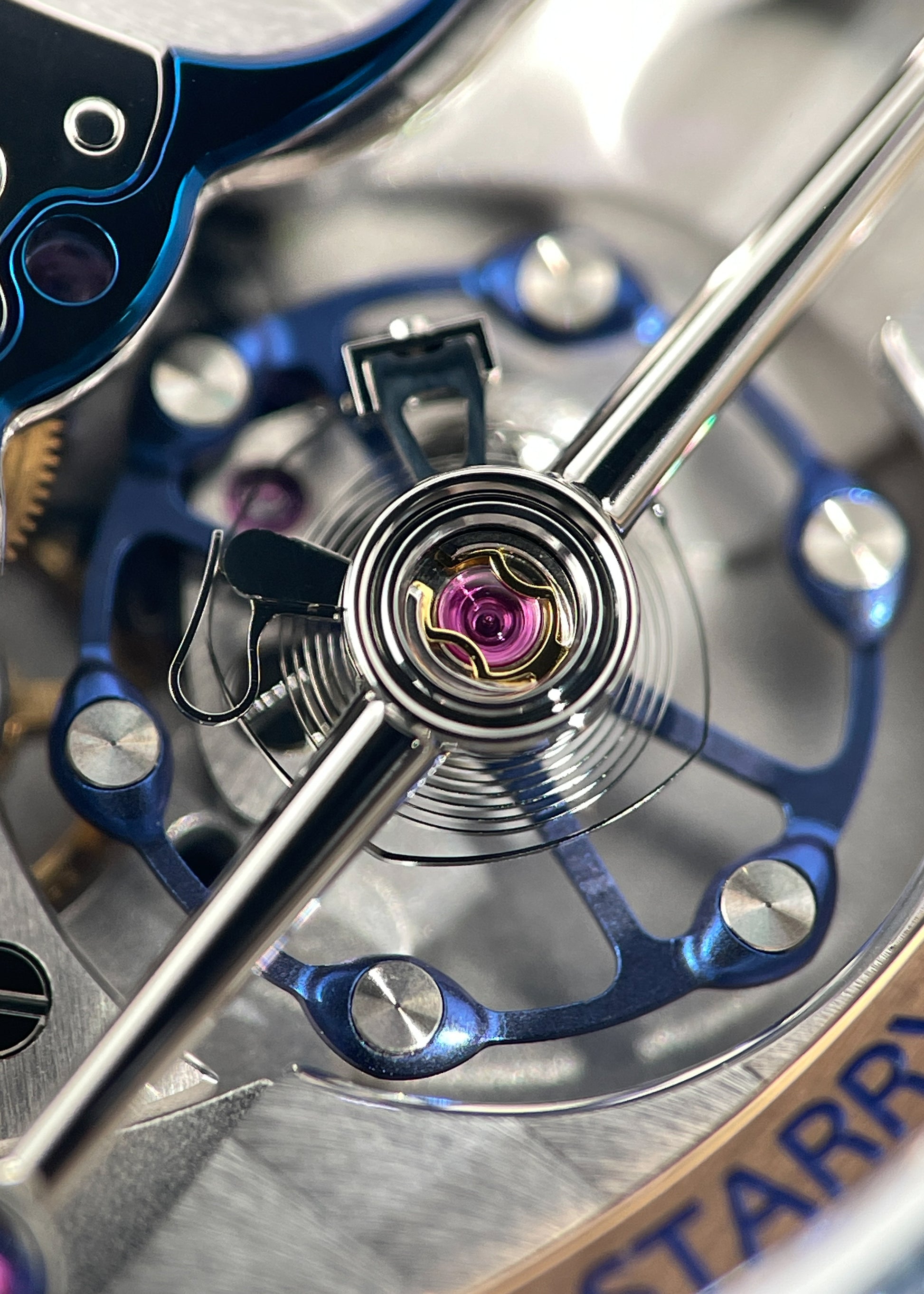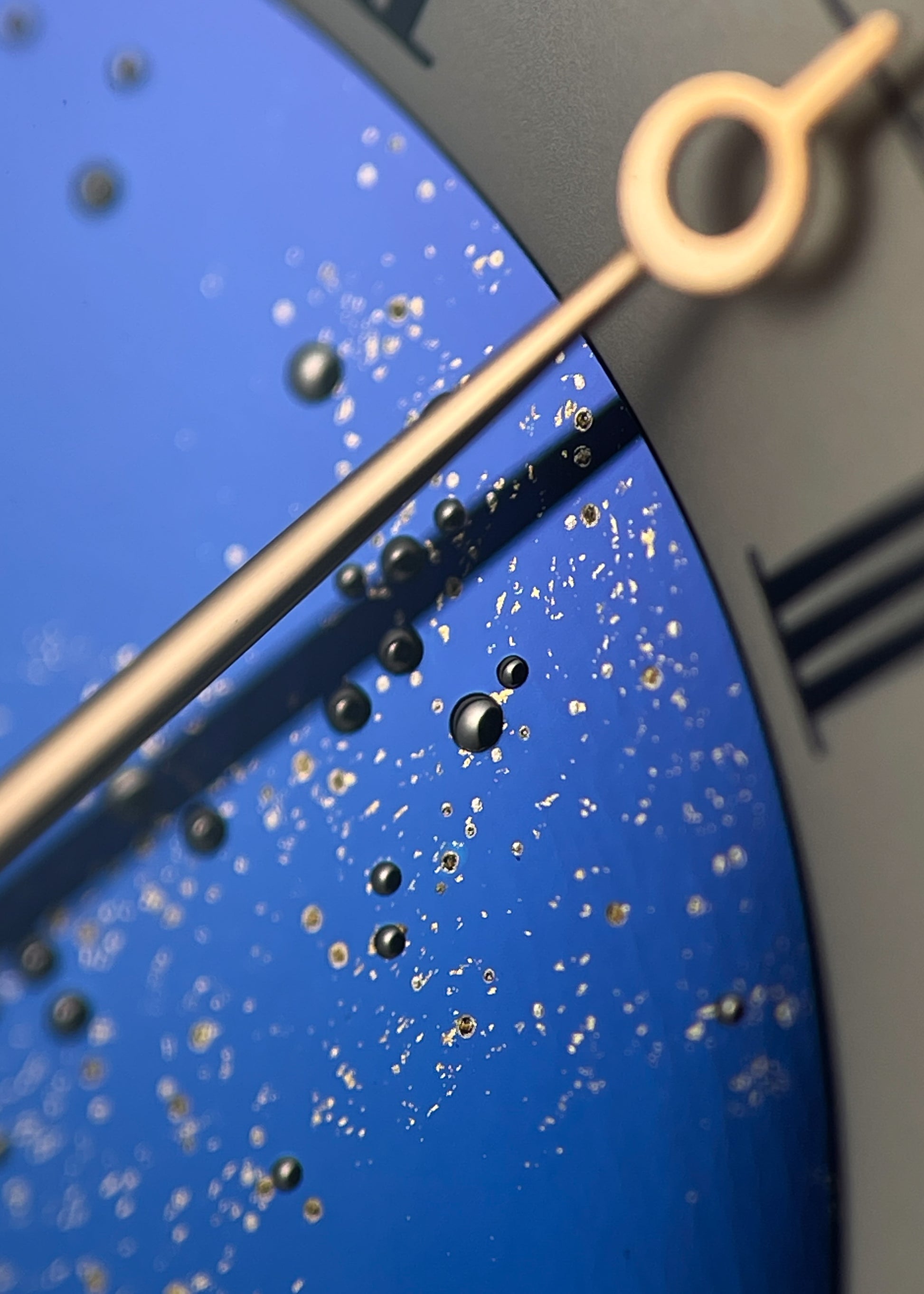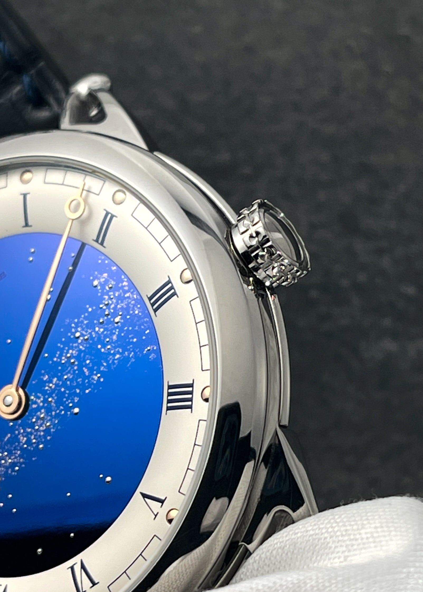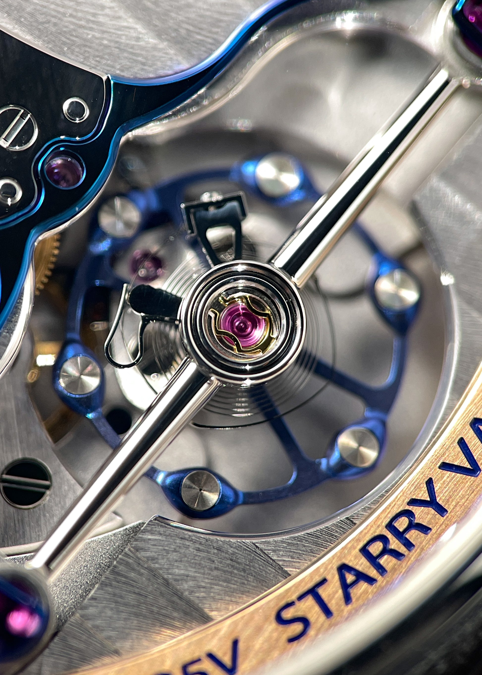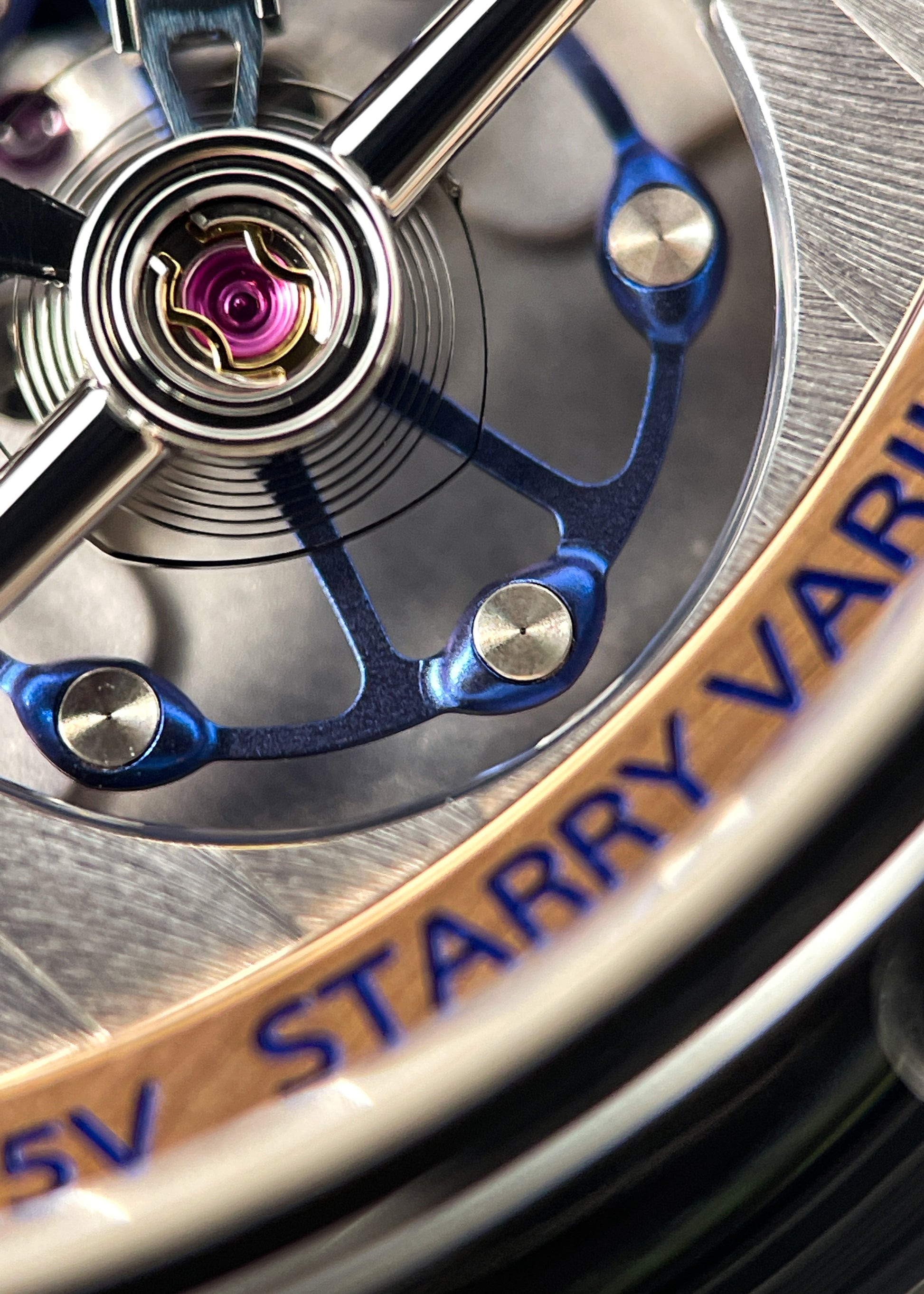 Discover the ethereal beauty of the De Bethune DB25 Starry Varius, a timepiece that captures the wonder of the cosmos with exquisite artistry. Underneath the hand-polished rose gold hands lies a mesmerizing titanium dial that has been heated blued and polished. The dial is then adorned with hand-fitted white gold pins to emulate the largest and nearest stars, while laser-milled Milky Way patterns, gilded with 24-carat gold leaf complete the celestial scene. On the periphery a silver-toned hours and minutes ring with polished rose gold hour-markers.