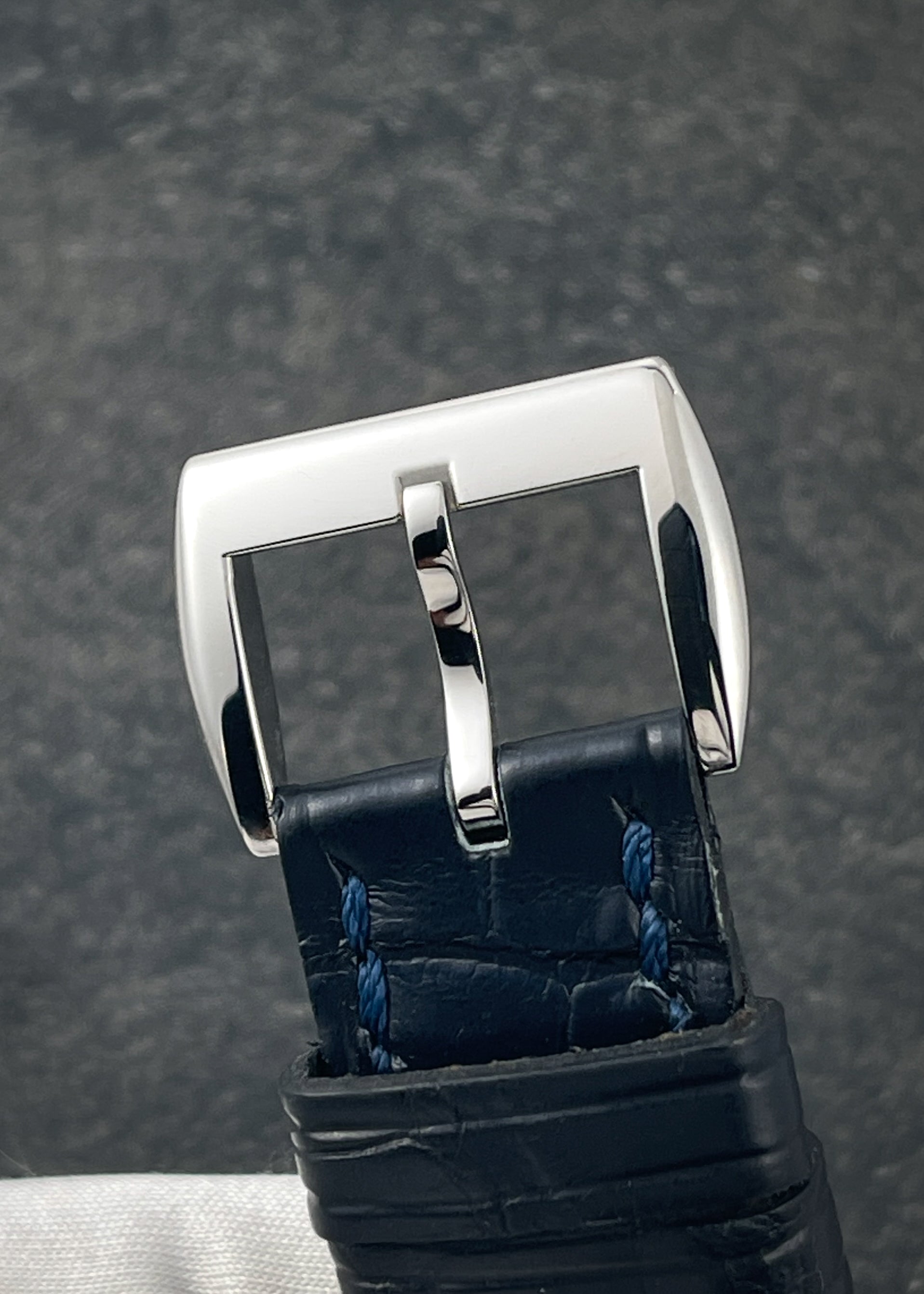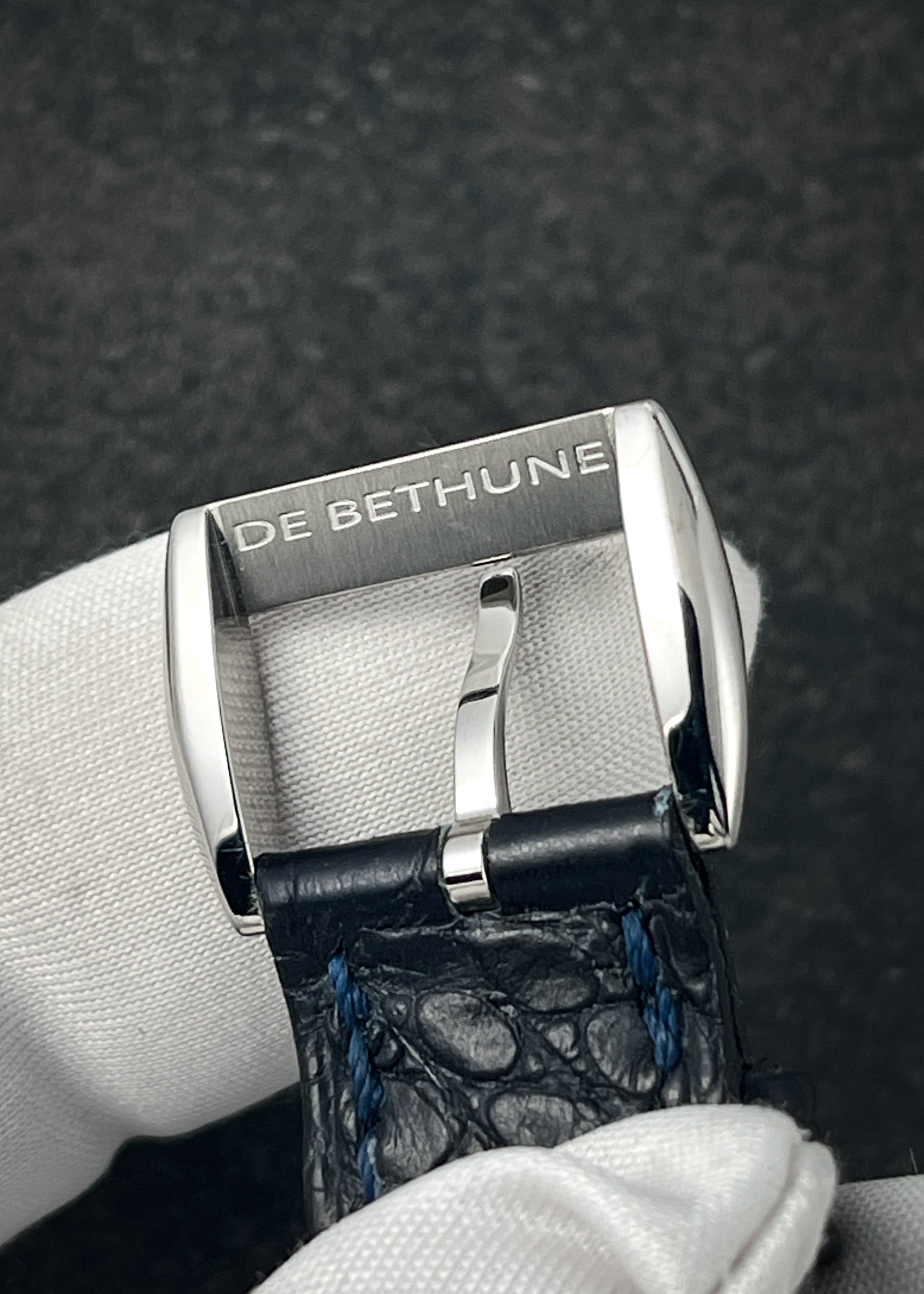 The Grade 5 Titanium case measures 42mm x 10.1mm x 49.6mm lug-to-lug and is excellent condition. Furnished on an OEM navy alligator strap with titanium De Bethune pin buckle. De Bethune Reference DB25VTIS3. Complete with Box and Papers dated May 2022.