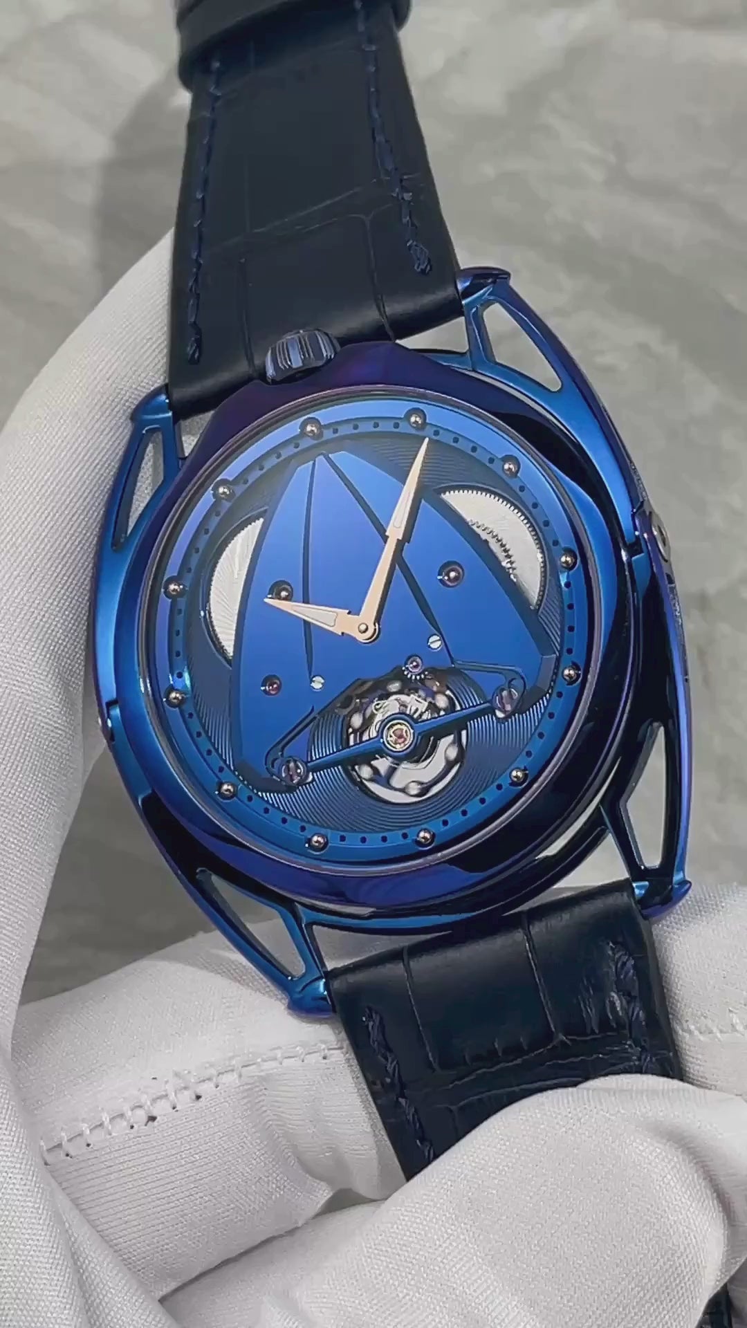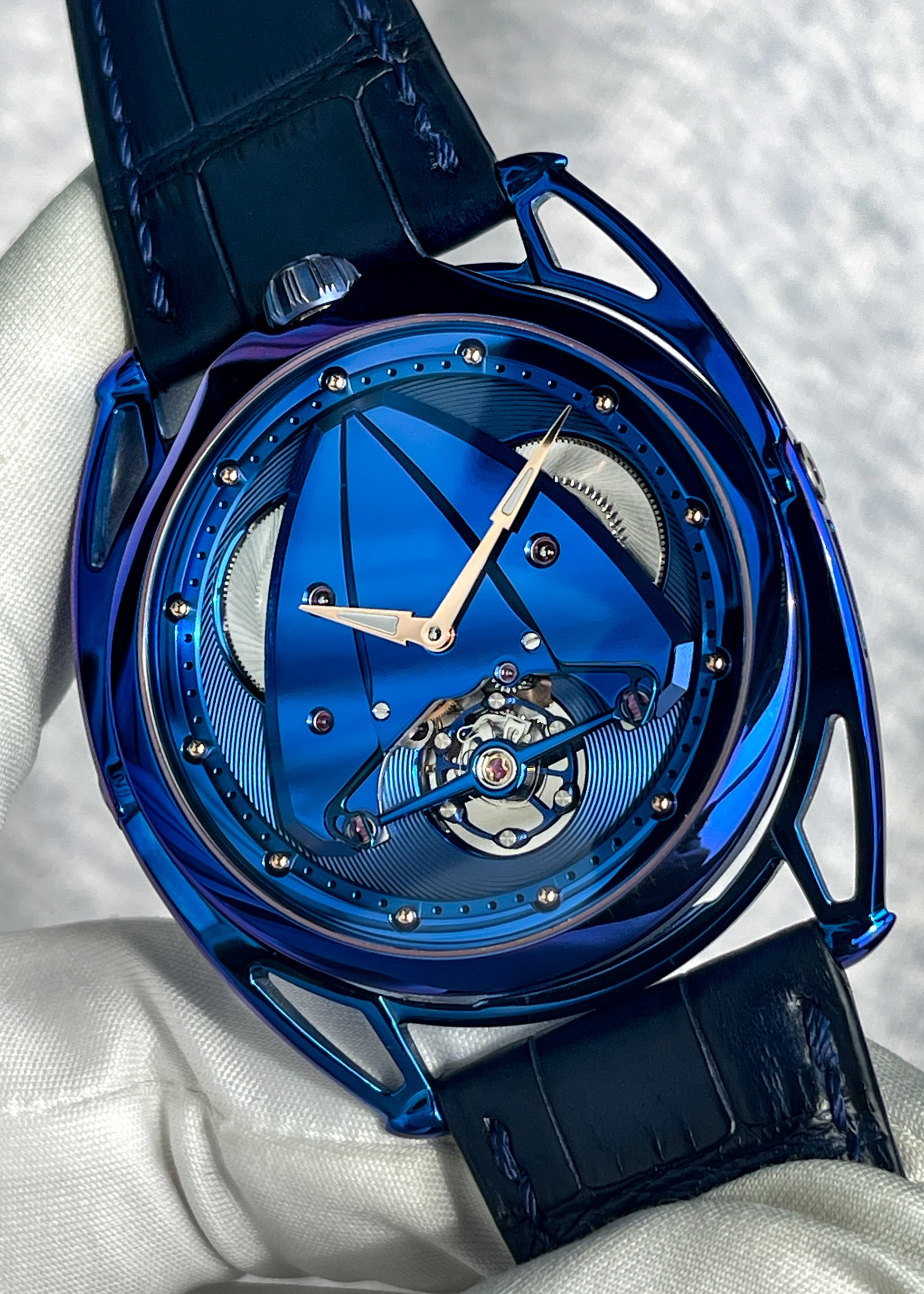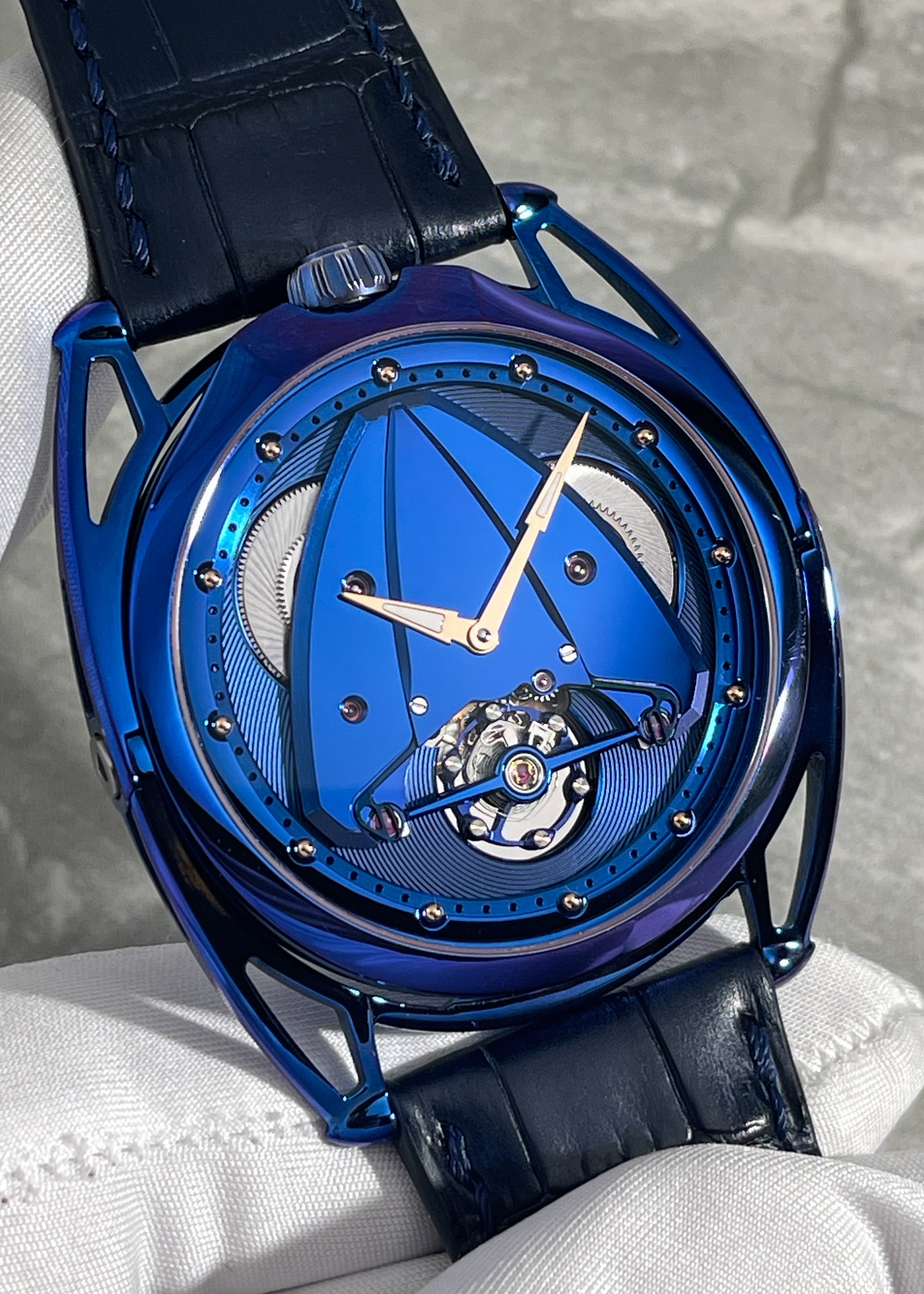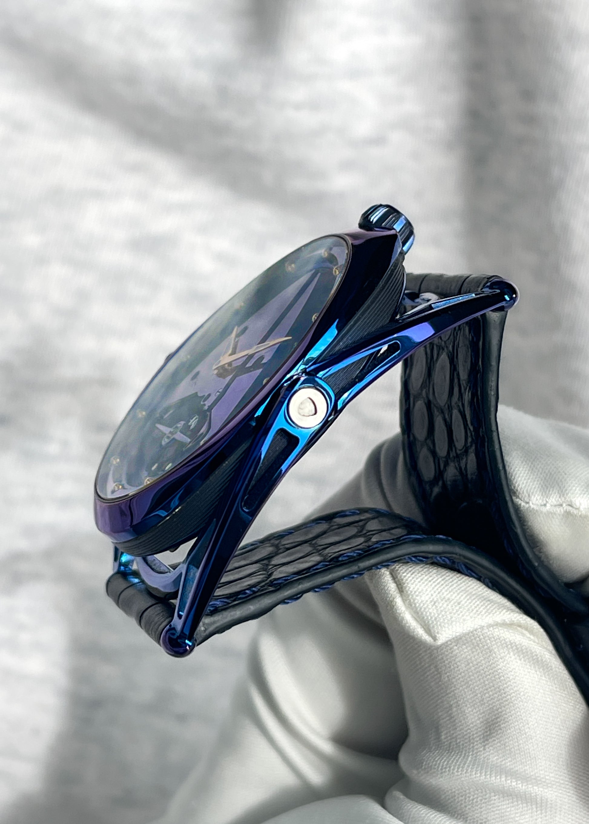 The dial is a triumph of craftsmanship, and just as the case is crafted from blued titanium... so too is the dial.