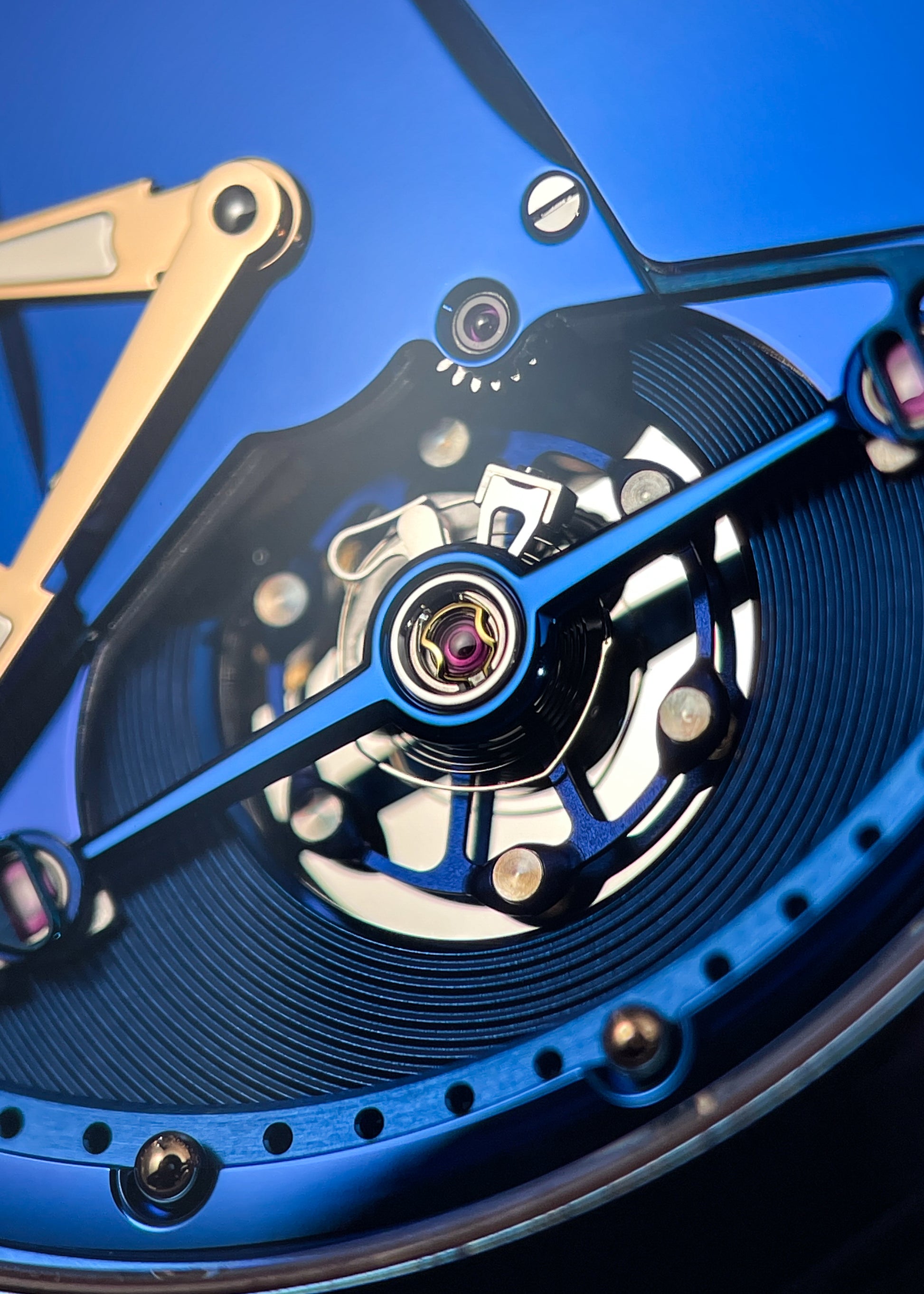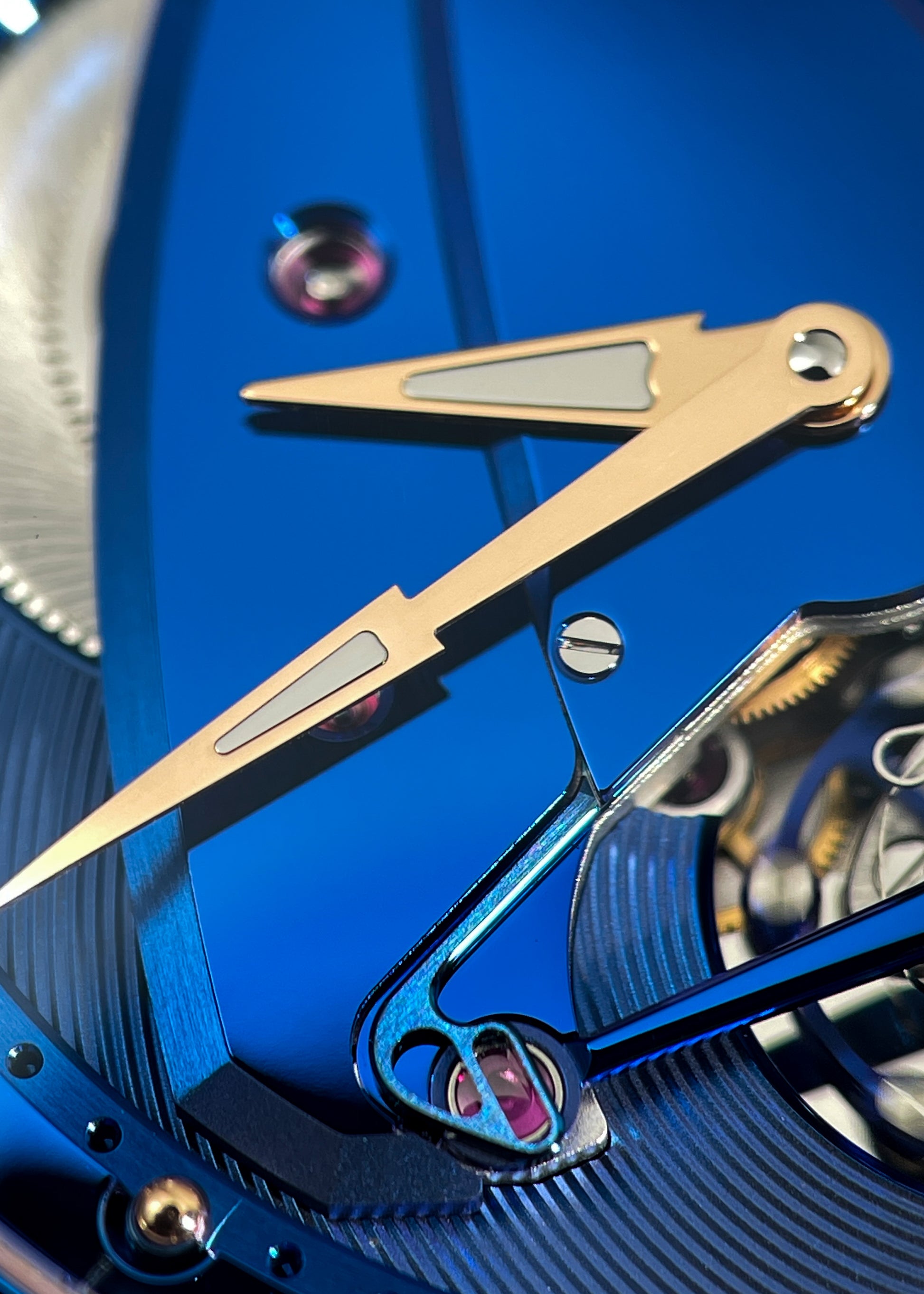 The satin-brushed minute track and delta-shaped bridge, reminiscent of a starship’s command, anchor the design with futuristic elegance. The Rose gold spherical hour markers tie in nicely with the gold hour and minute hands. At the 6 o'clock position exists the blued titanium balance wheel set with white gold inserts, a patented flat-terminal-curve balance spring, and a silicon escape wheel.