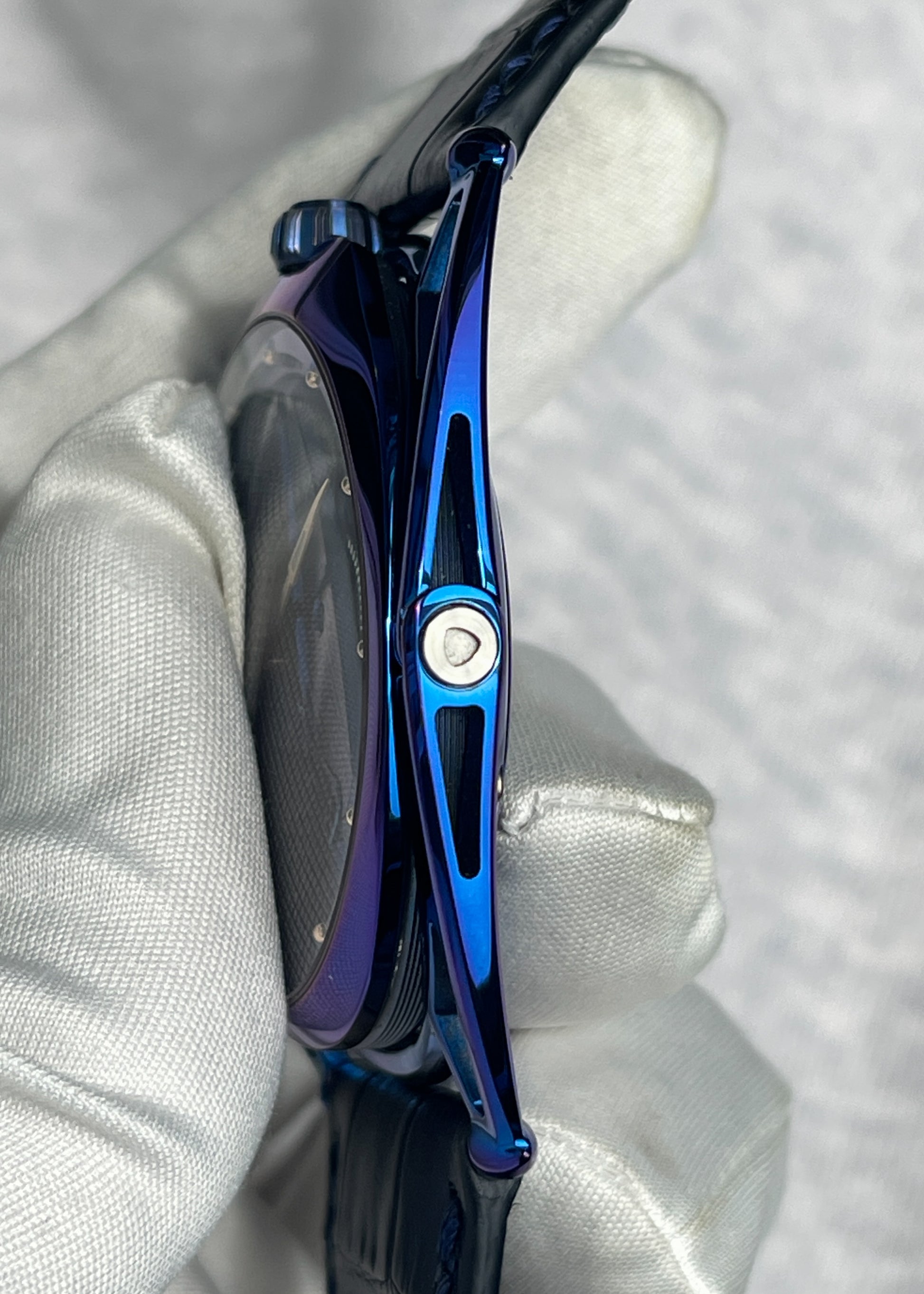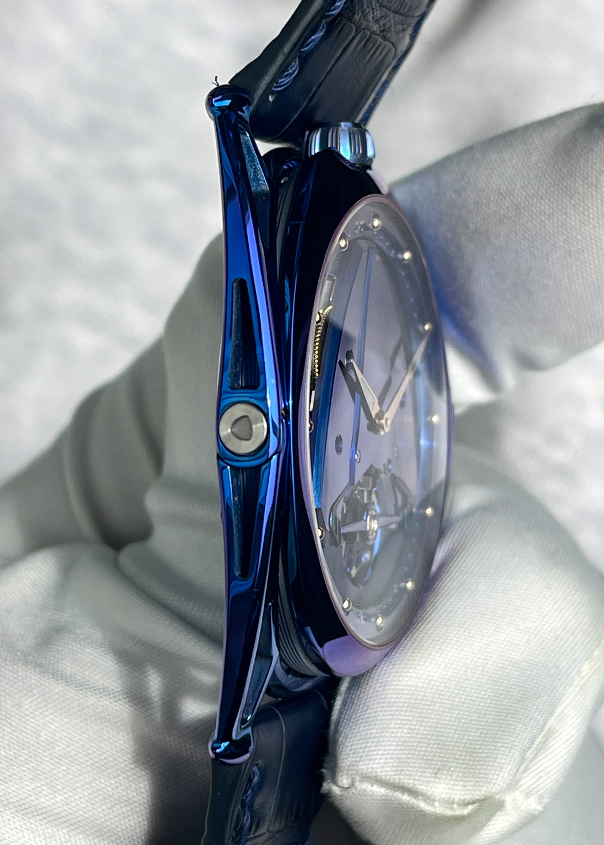 Horology By The Sea is proud to present this extraordinary Special Edition from De Bethune, the DB28XP "Kind of Blue". The futuristic polished Grade 5 titanium case radiates a deep, luminous blue which is achieved through thermally heating the material at approximately 700° celcius.  Maximal comfort is achieved through use of De Bethune's patented floating lugs which gracefully adapt to the wrist’s contours.