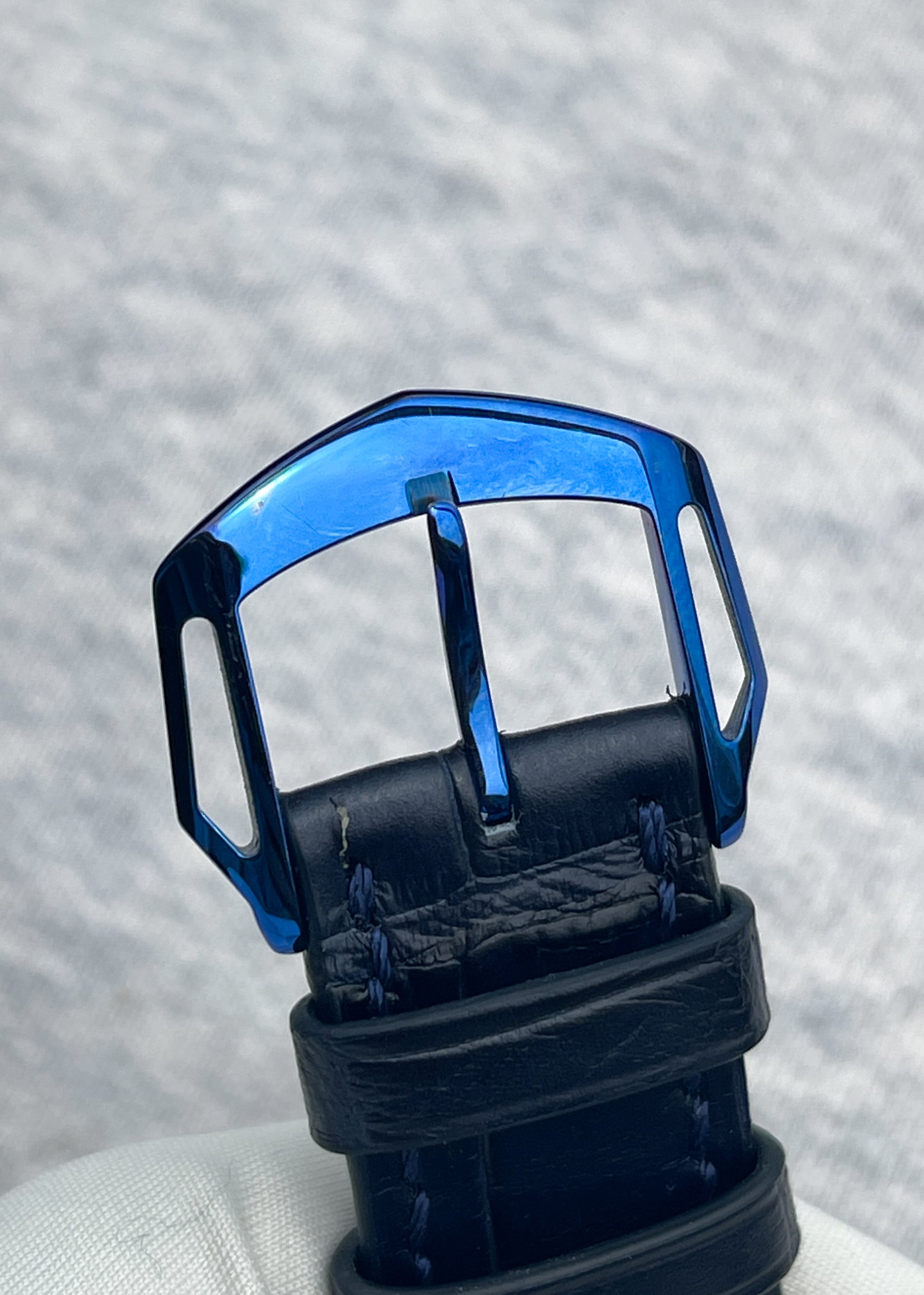 The polished blued Grade 5 titanium case measures 43mm x 8.5mm x 54mm lug-to-lug and is in excellent condition. Furnished on an OEM Navy alligator strap and blued titanium buckle. Complete with Box and Papers.