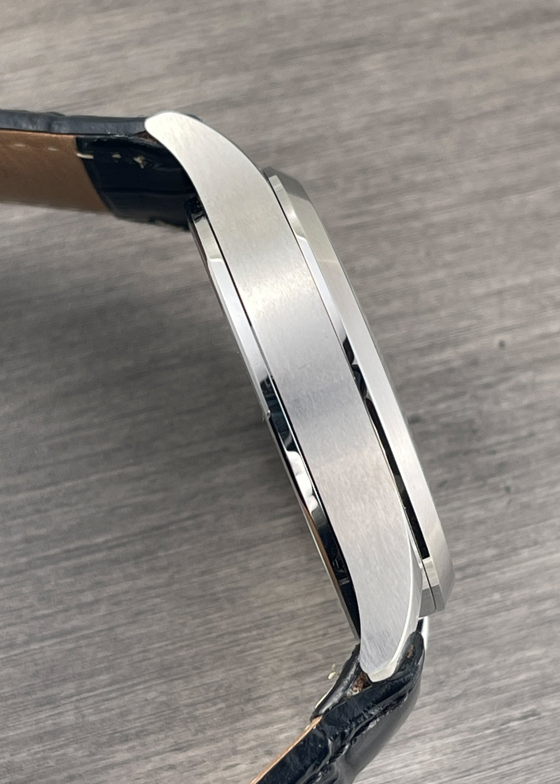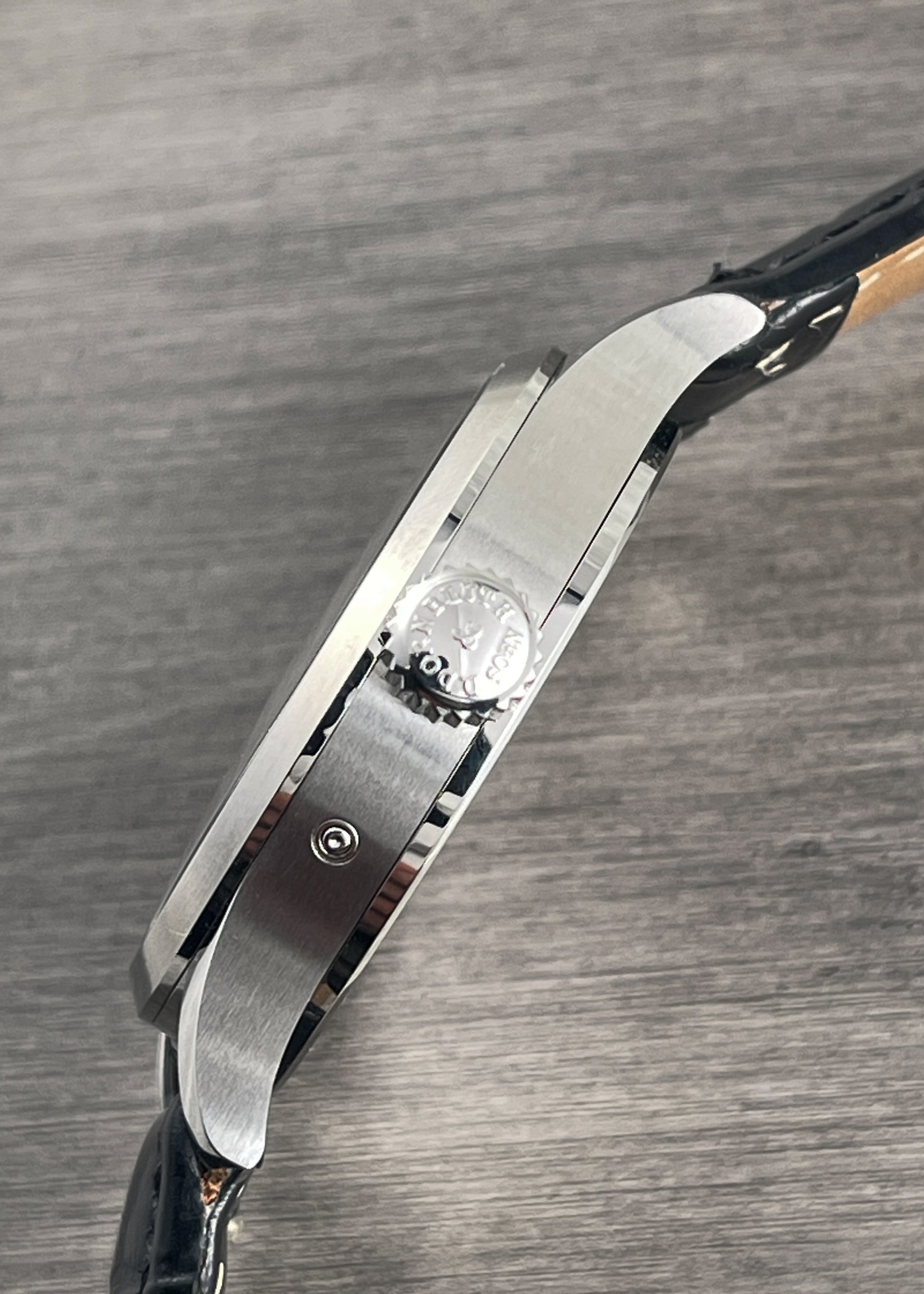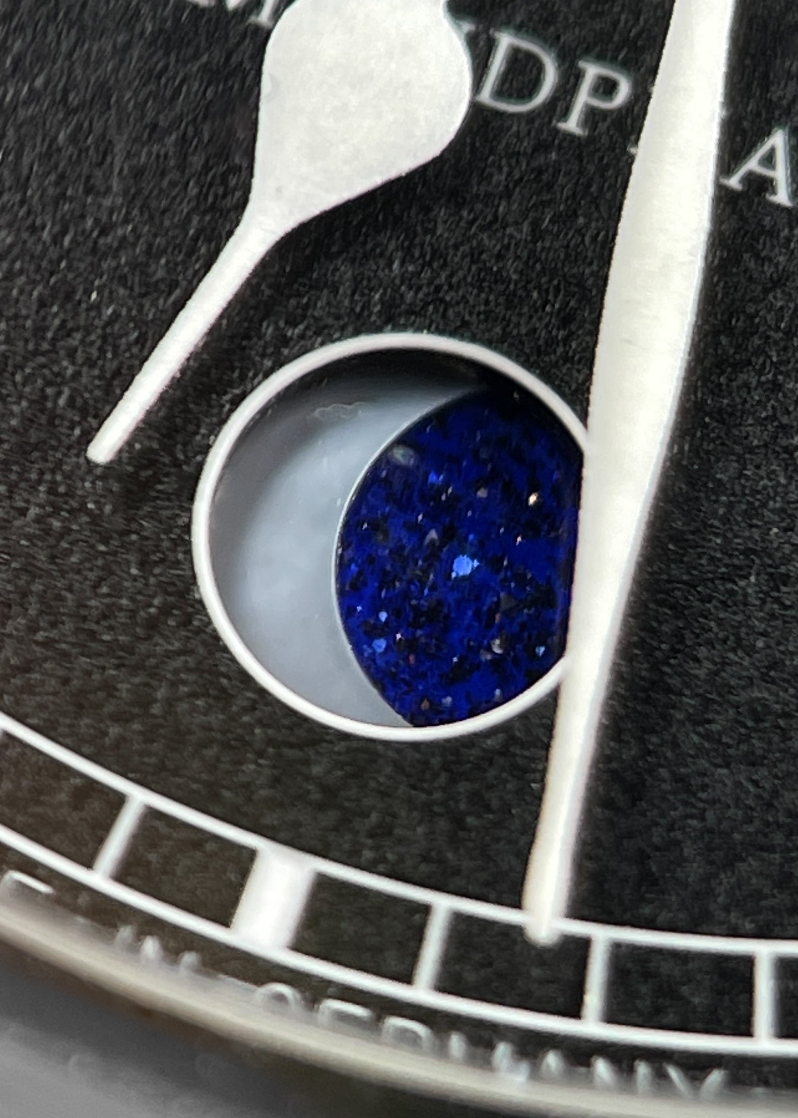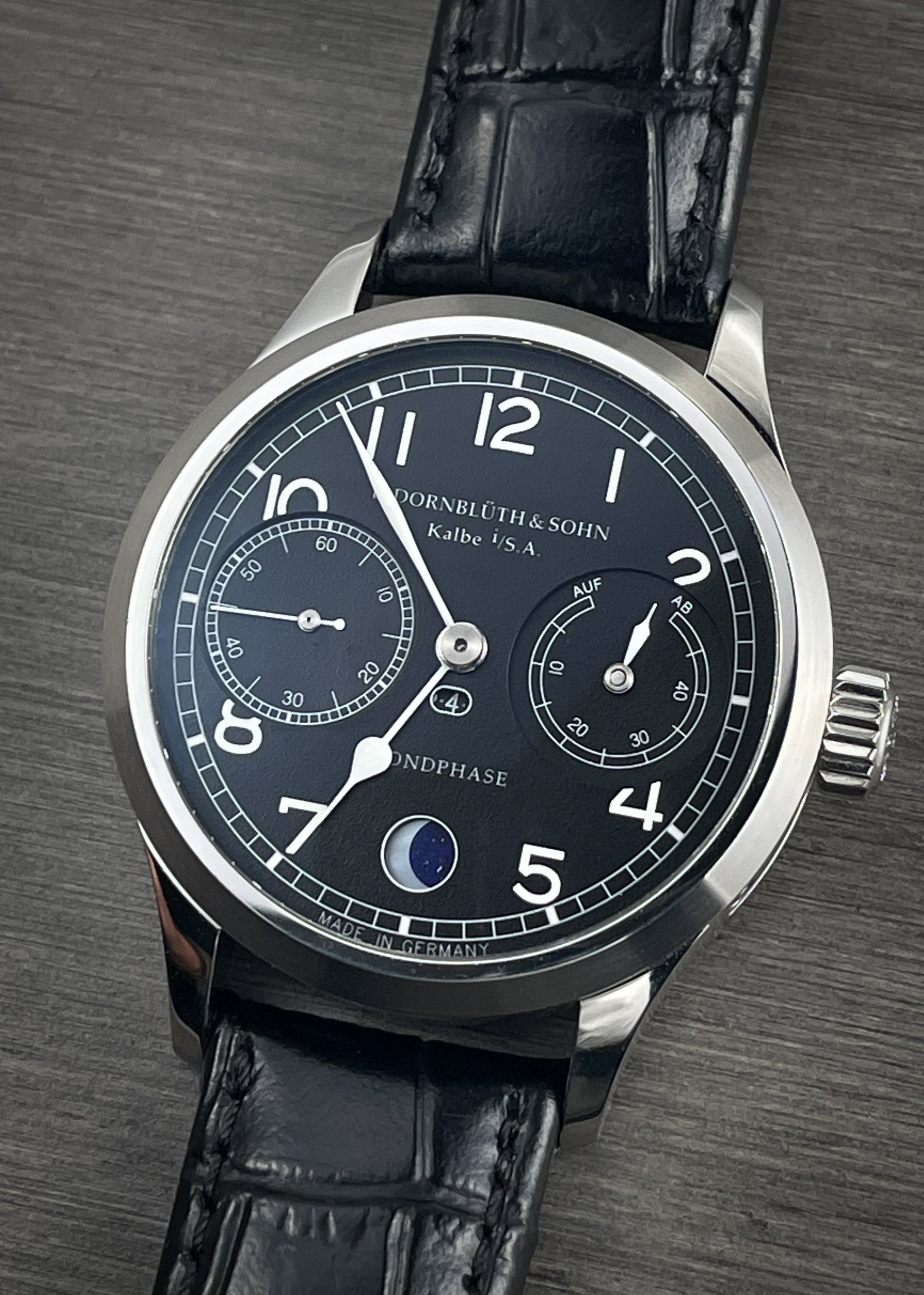 The moment Mr. FedEx man delivered this watch to Horology By The Sea World Headquarters, I threw it on my wrist and exclaimed, "'Tis the perfect Dornblüth". The stainless steel case - at least for this guy - is a goldilocks size of 40mm and 10mm thick, with a dial that is super legible dial and nicely lumed to boot. A Moonphase indicator sits at the 6 o'clock position with a complimentary numeric indication for the eight phases of the moon in the aperture just below the cannon pinion.