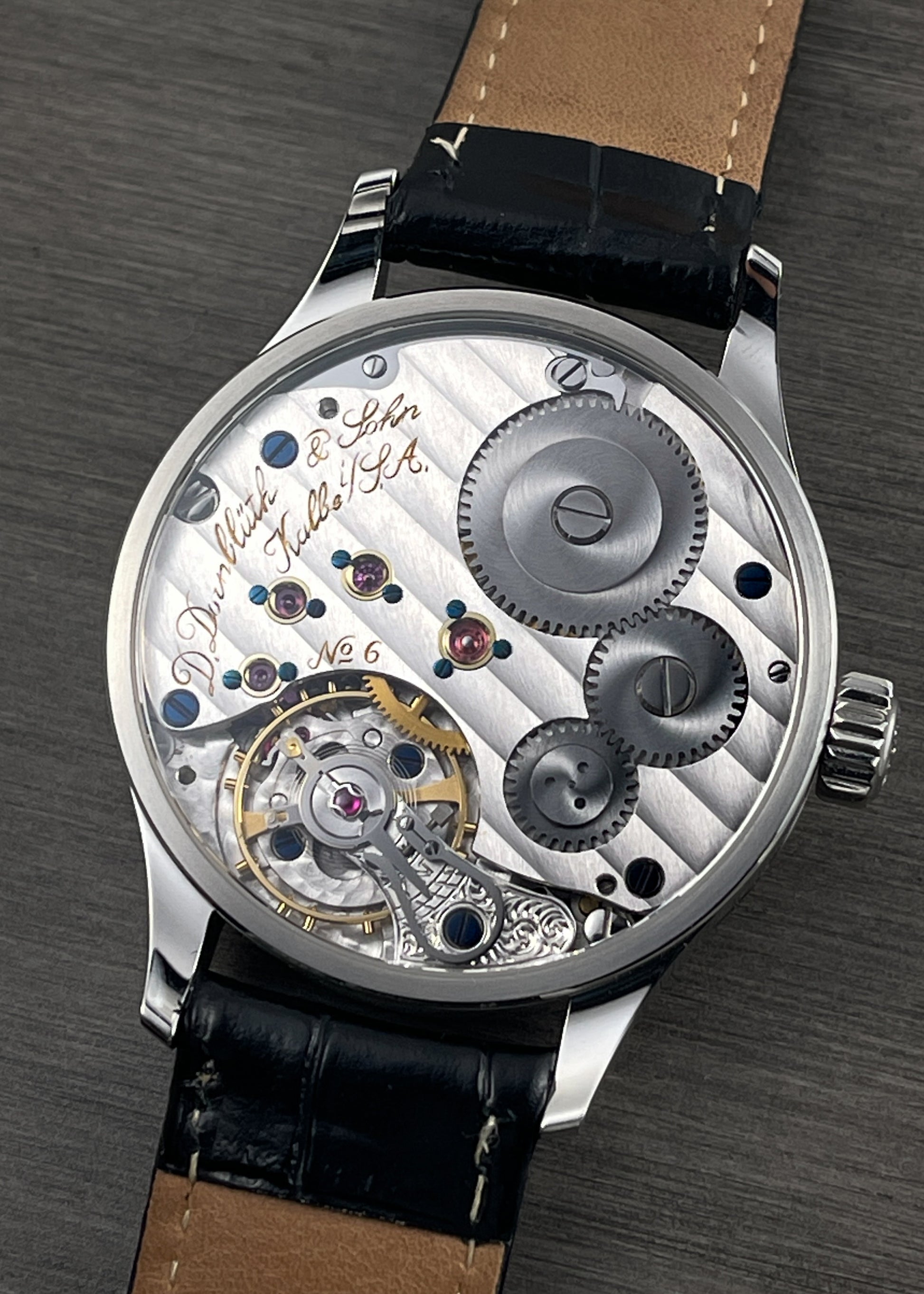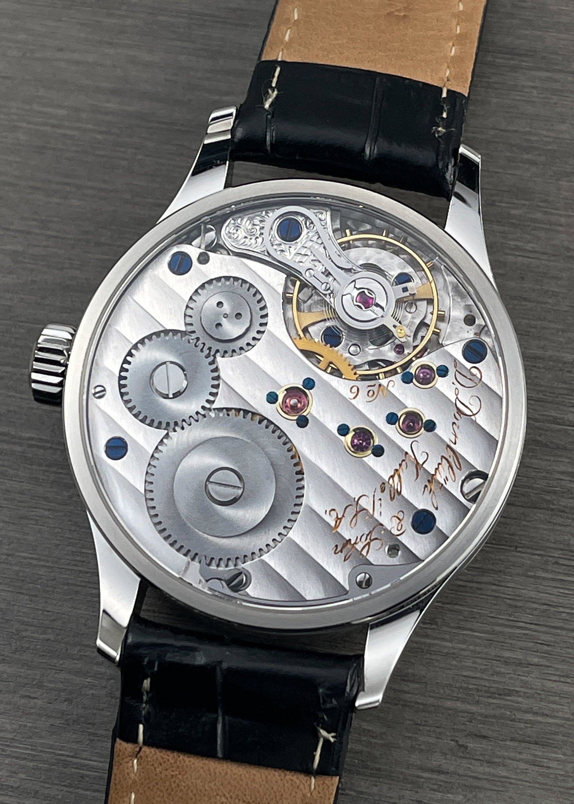 The reverse side reveals a nicely decorated movement with rhodium plated bridges. The watch beats at 18,000 BPH with a 50 hour power reserve.