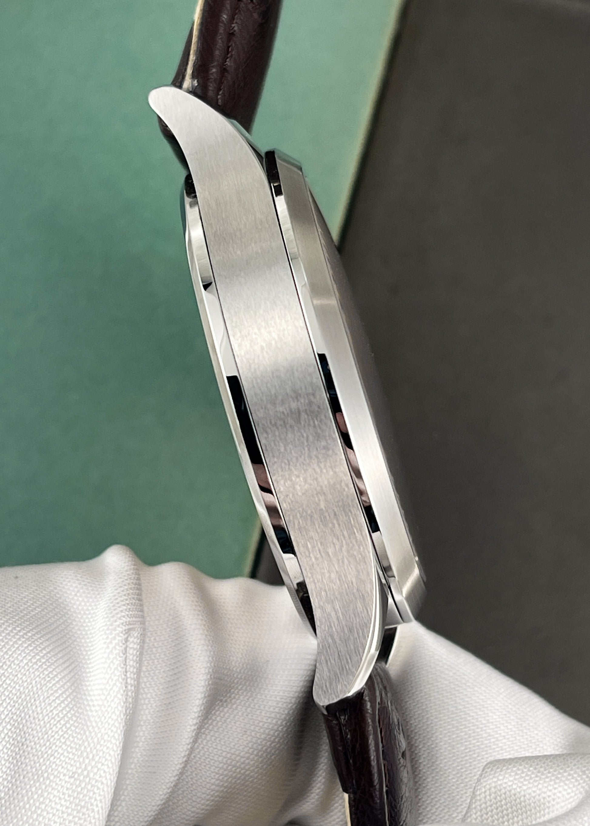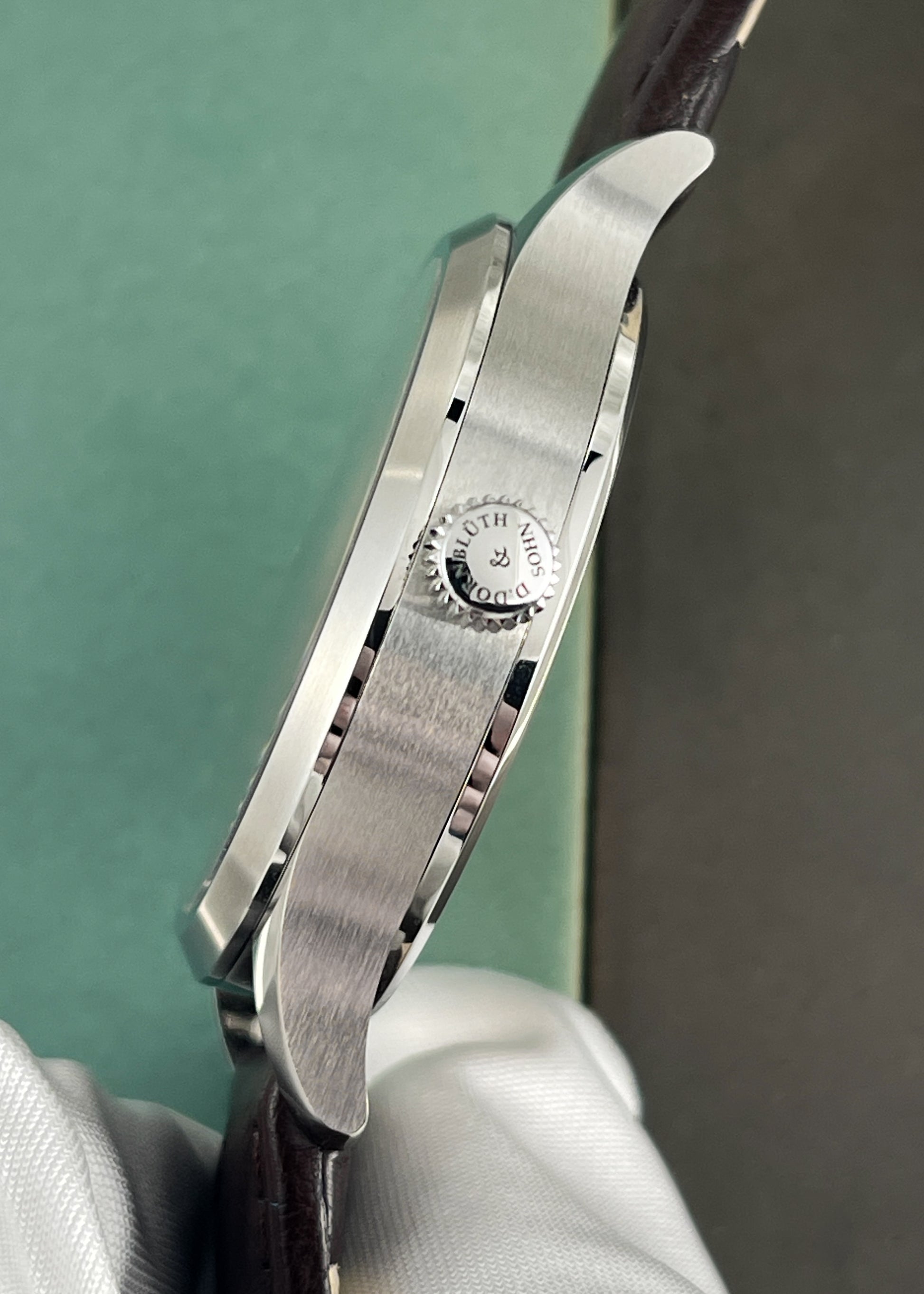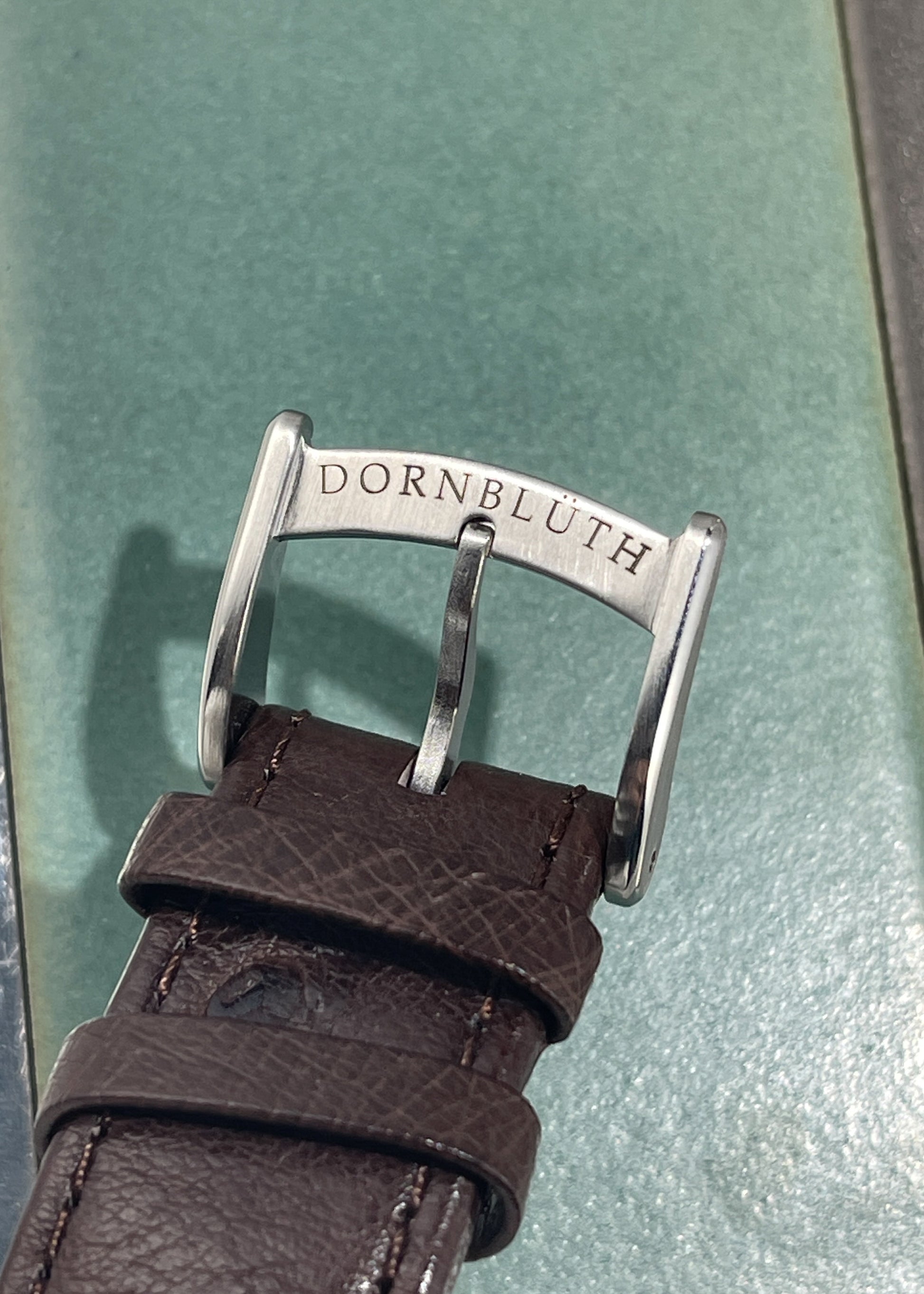 The stainless steel case in mint condition and measures 40mm x 11mm x 50mm lug-to-lug and is in excellent condition. Caseback is engraved "Unique Piece". Furnished on an OEM dark brown ostrich leather strap with signed Dornblüth pin buckle. Complete with Box & Warranty Certificate dated March 6th, 2024.