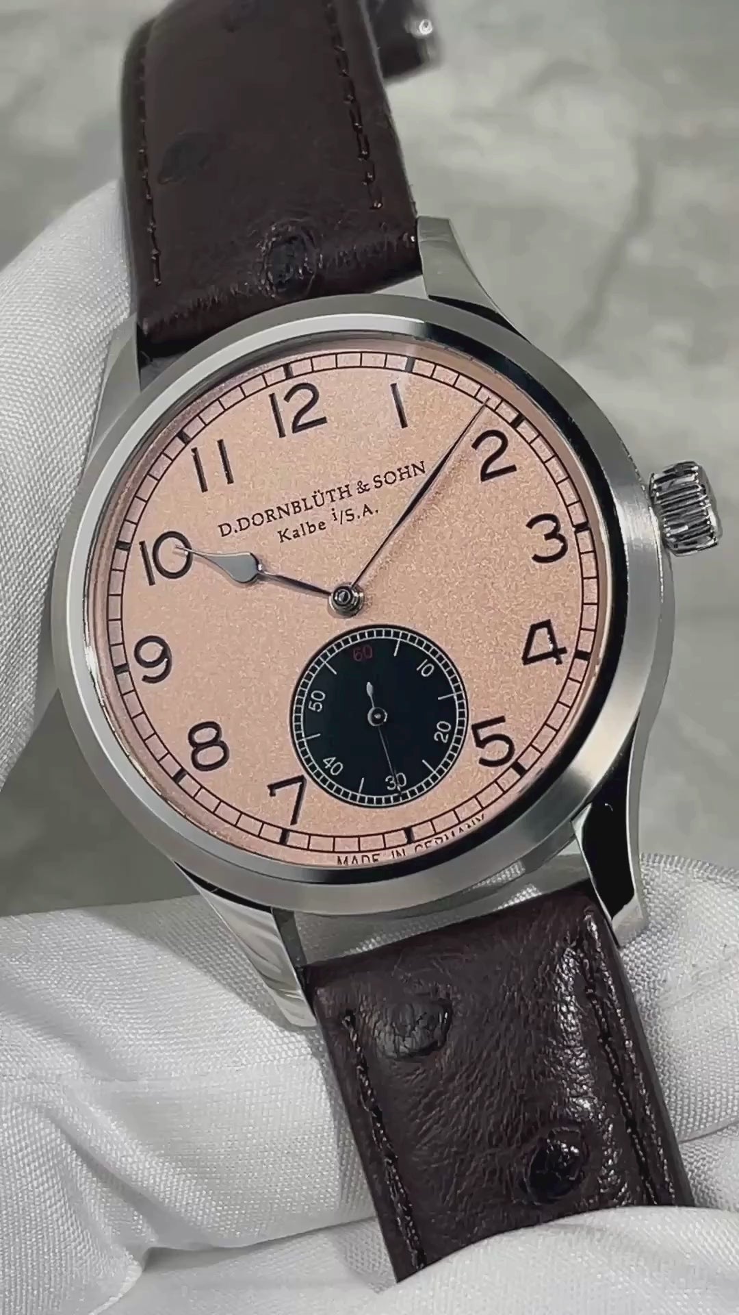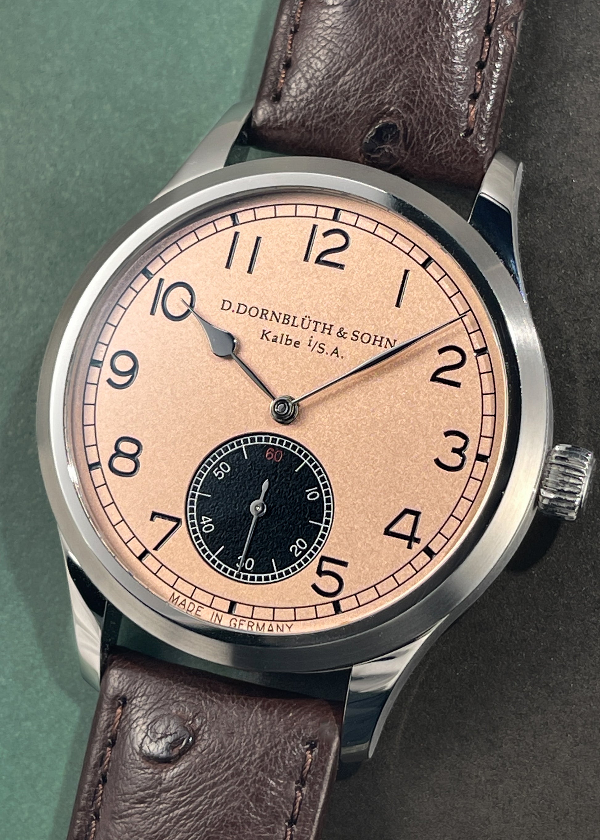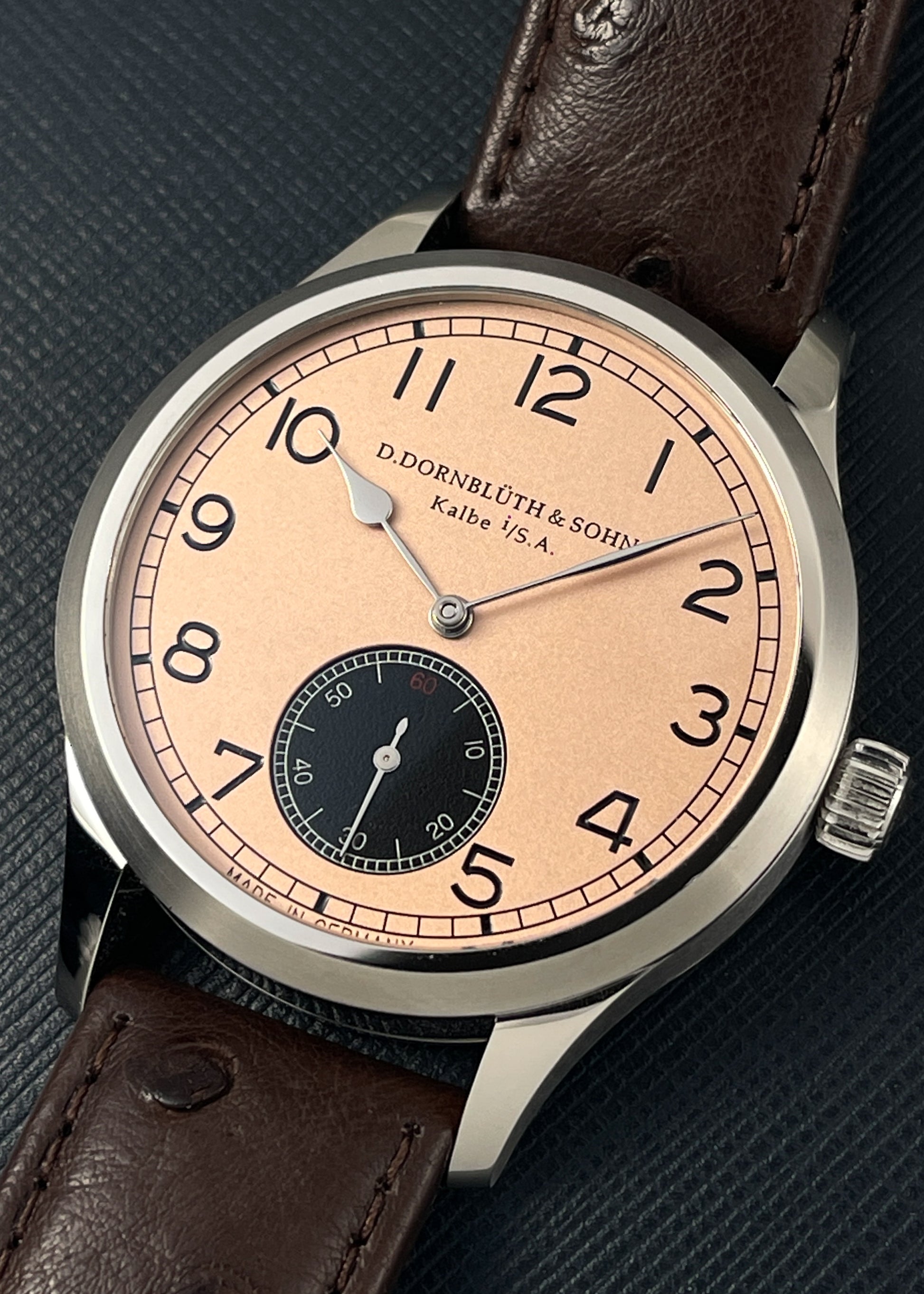 Horology By The Sea is thrilled to present a true masterpiece of German watchmaking: the Dornblüth & Sohn Quintus 40.0 Klassik with a bespoke salmon dial. This exquisite timepiece, crafted by the renowned father-and-son duo in Kalbe, Germany, is a testament to the artistry and precision that define independent horology.