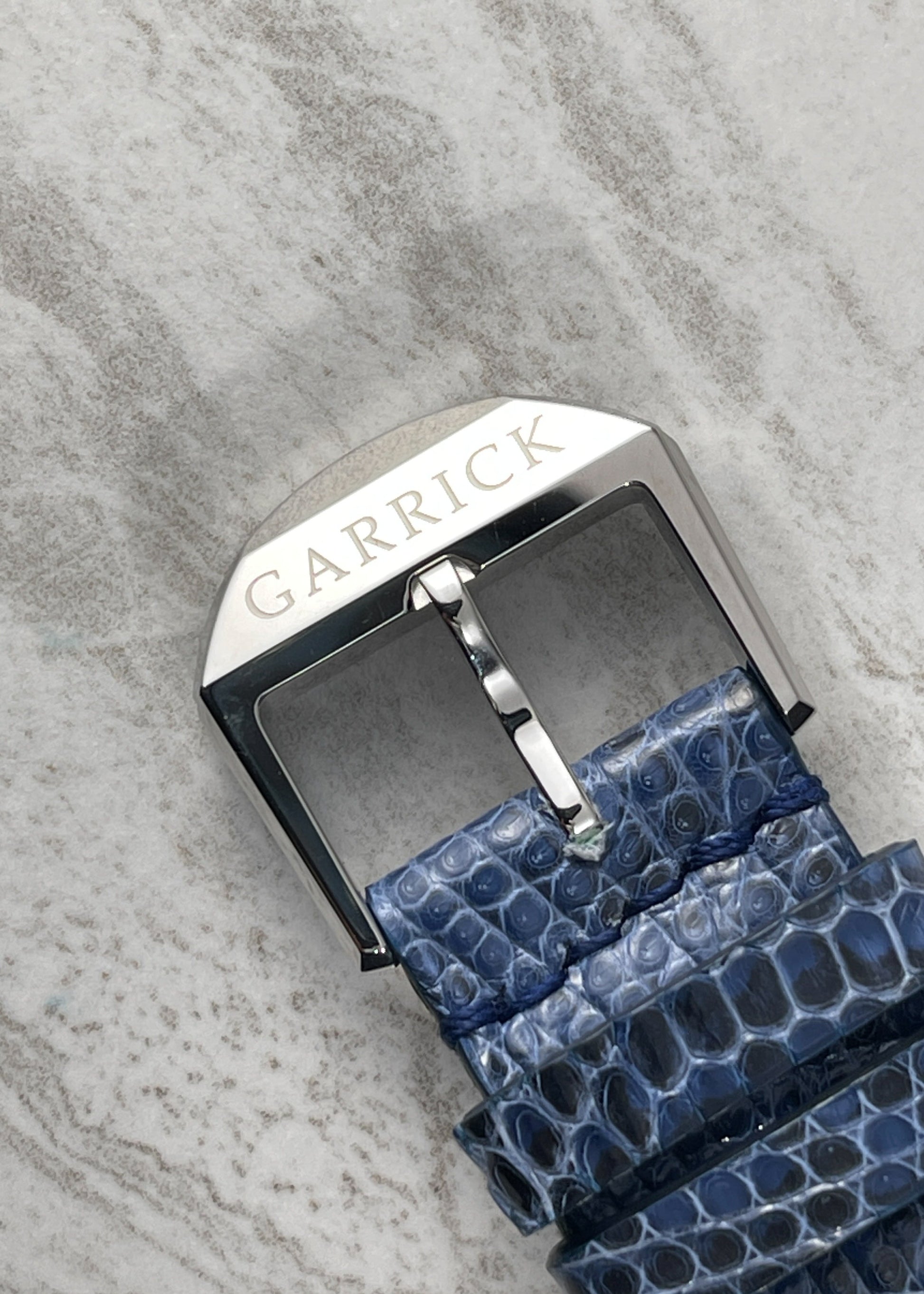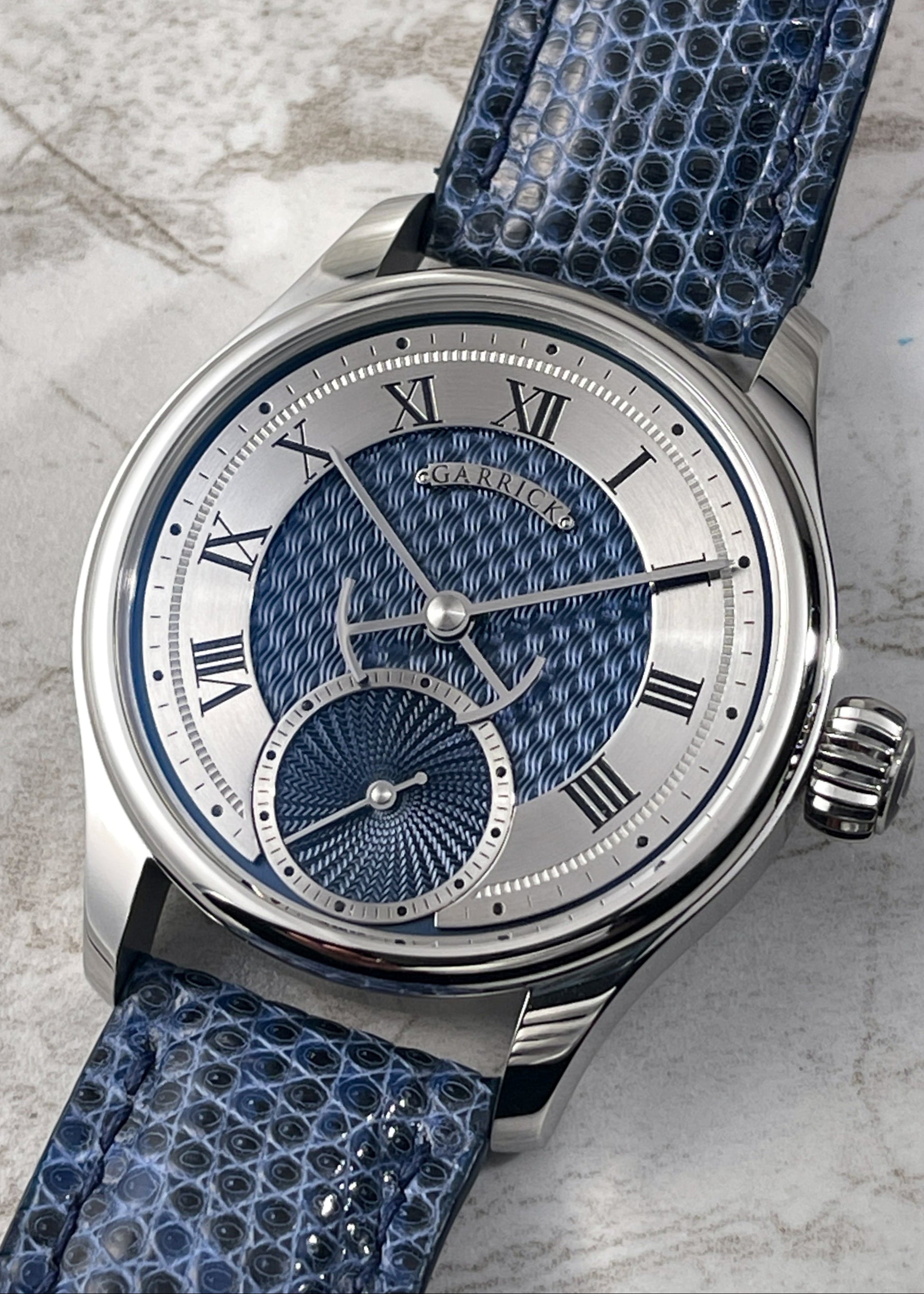Just arrived is this Garrick S4 with a rose engine-turned electric blue guilloche dial with Garrick's characteristic hands. The watch is a reimagined 6498 presented with traditional English styling including a screwed balance wheel and a swan neck regulator.