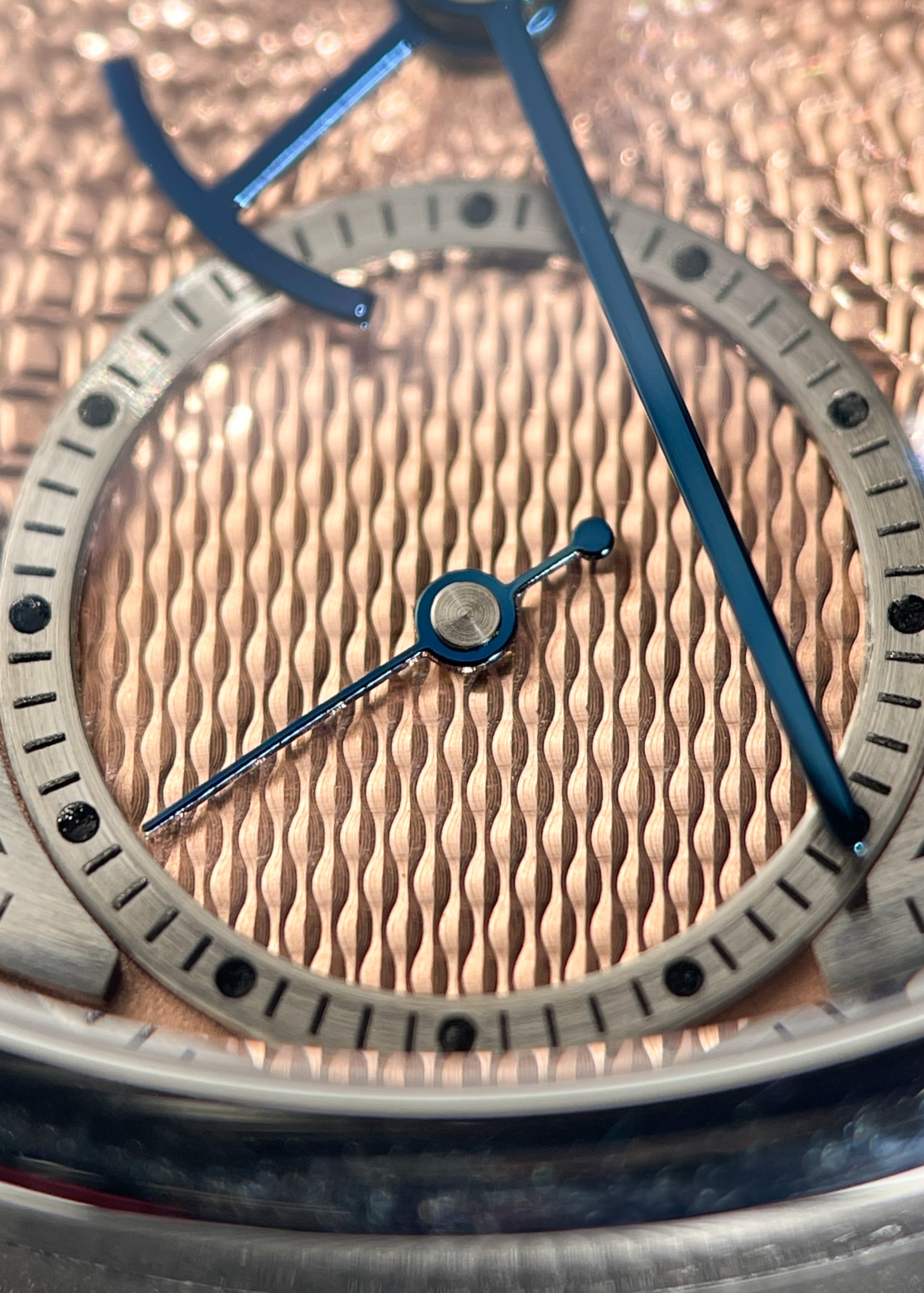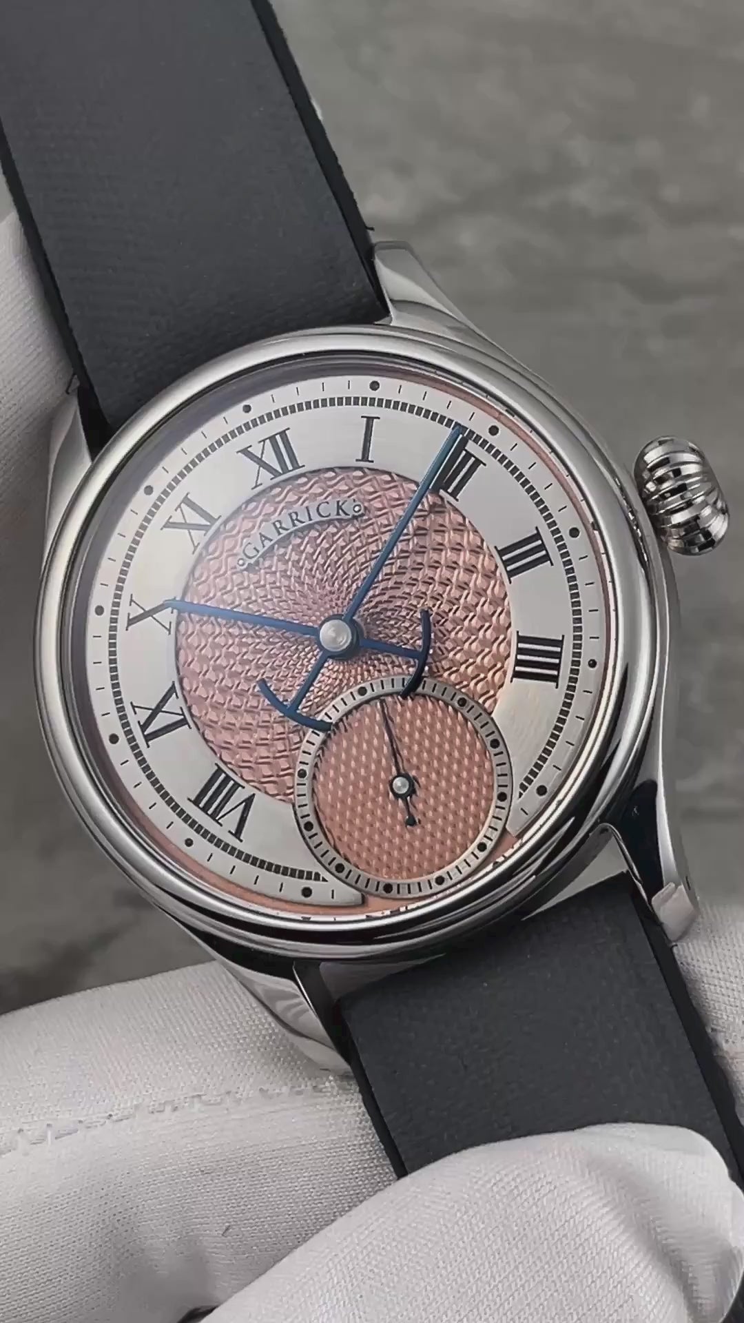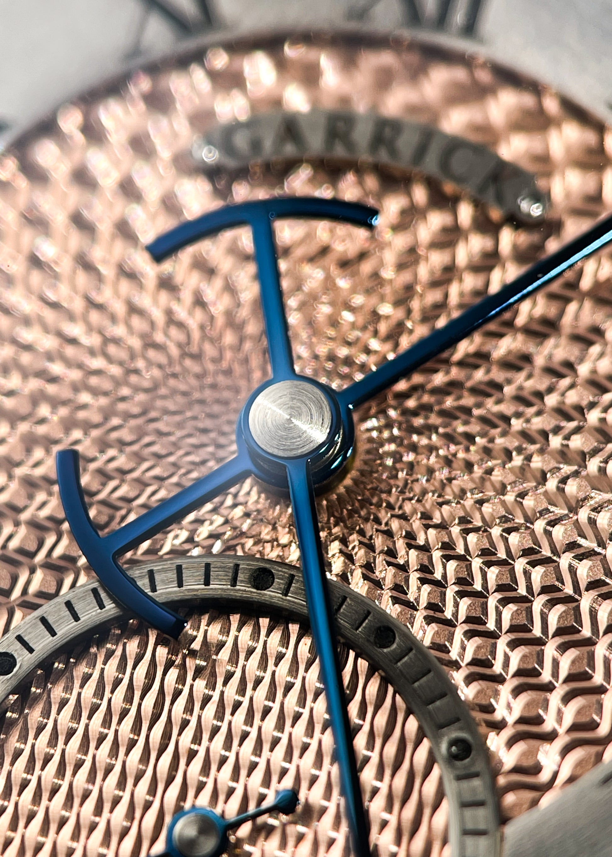 Just arrived is this Garrick S4 with a lovely rose gold colored guilloché dial underneath Garrick's characteristic anchor-shaped hour and minute hands. The hours of the chapter ring are first engraved then later meticulously filled by hand with black ink.