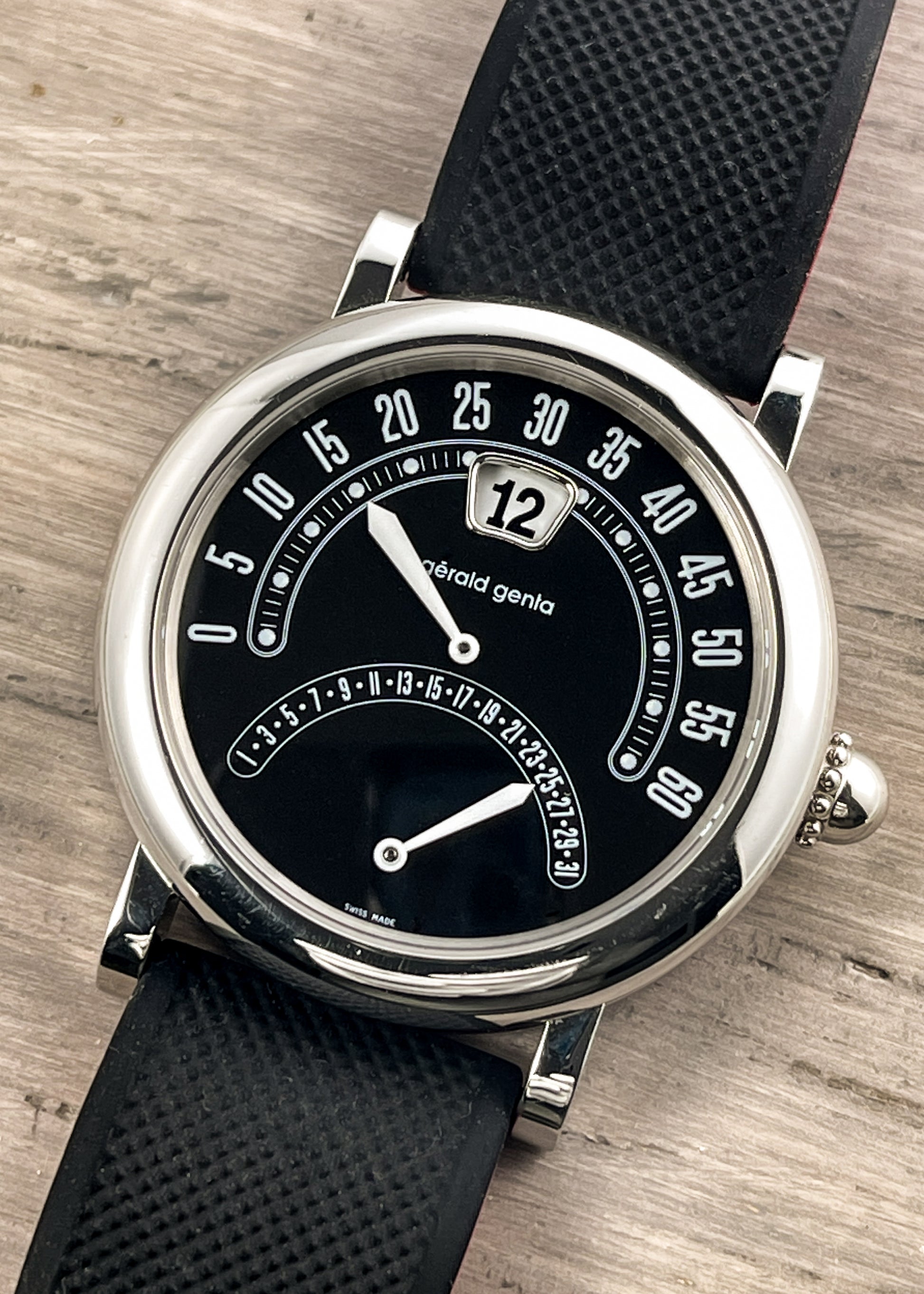 Reference G.3754, Serial 91163. Stainless Steel case measures 38mm x 10.3mm x 44mm lug-to-lug. Complete w/ original Box, Instruction Manual and blank Warranty Card. Watch is fit to a rubber strap w/ aftermarket buckle. Original Genta steel buckle is also included.