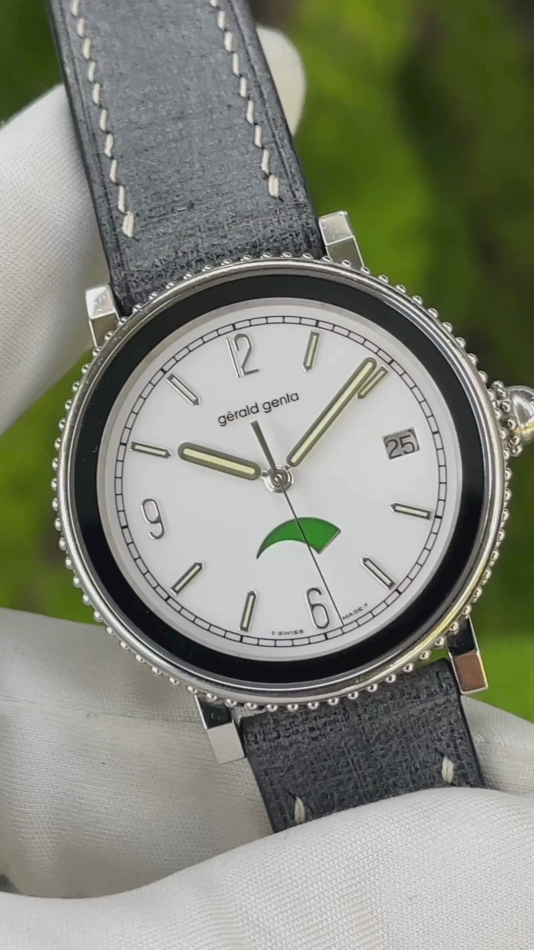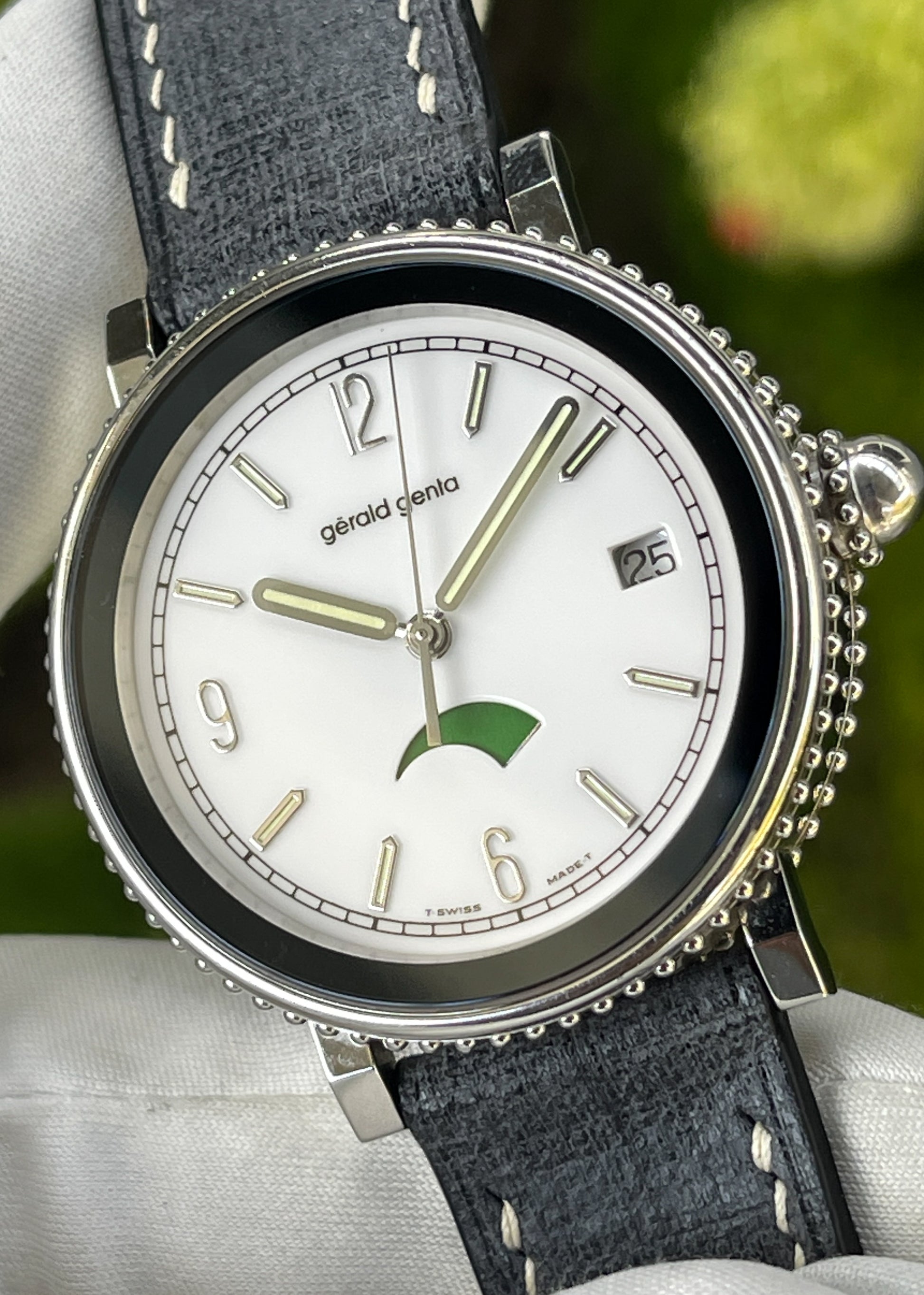 Furnished with original Gerald Genta steel pin buckle, Gerald Genta Box & Warranty Card dated 6/30/2006. Complete Overhaul by my Watchmaker August 2024.