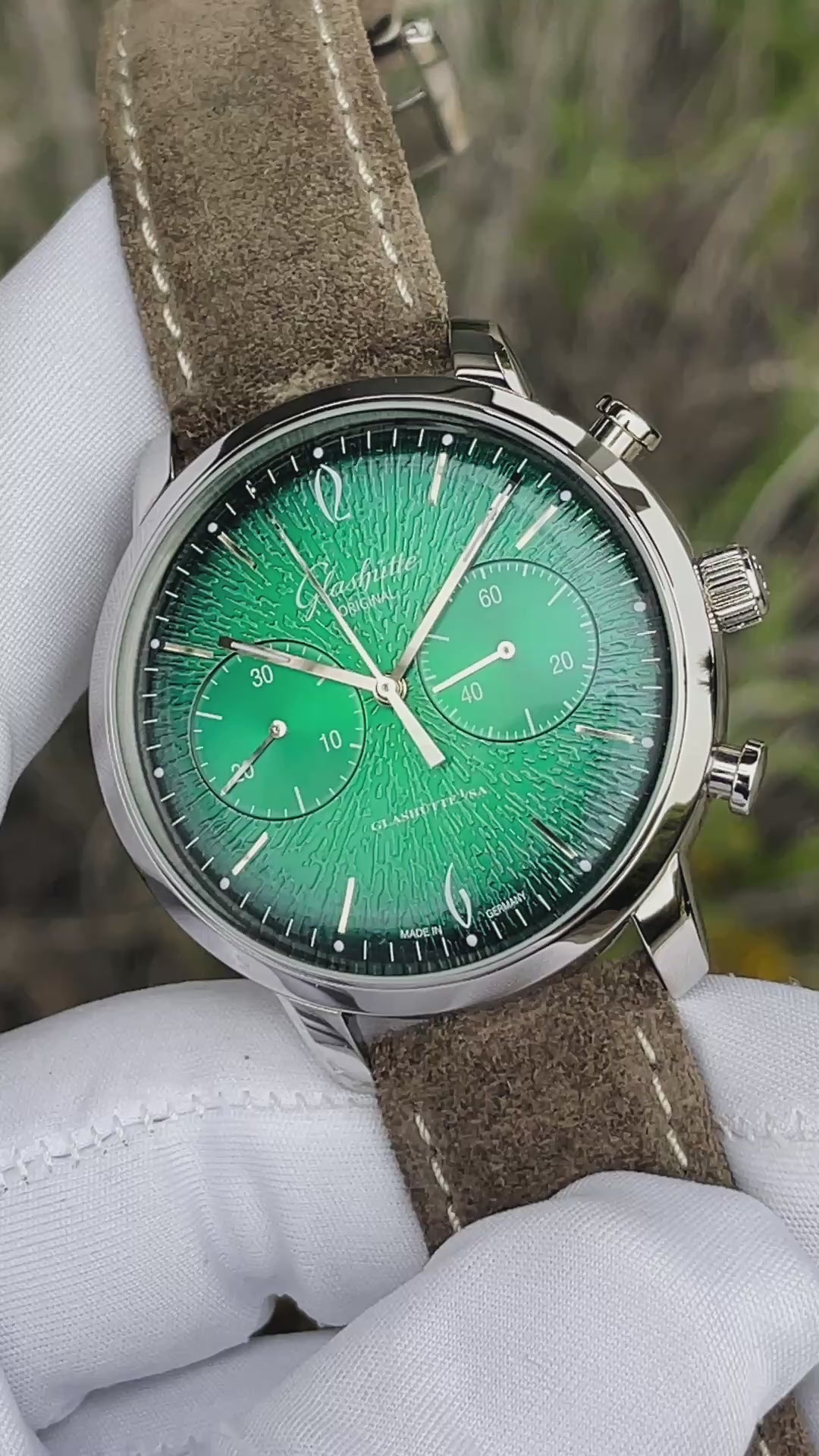 If the Sixties was anything like this I clearly missed out! Here we have the Glashütte Original Sixties Chronograph with a lovely domed green dial with dégradé effect. Running seconds are found in the 9 o'clock subdial while the chronograph seconds are centrally located working in concert with the 30 minute totalizer at the 3 o'clock subdial.