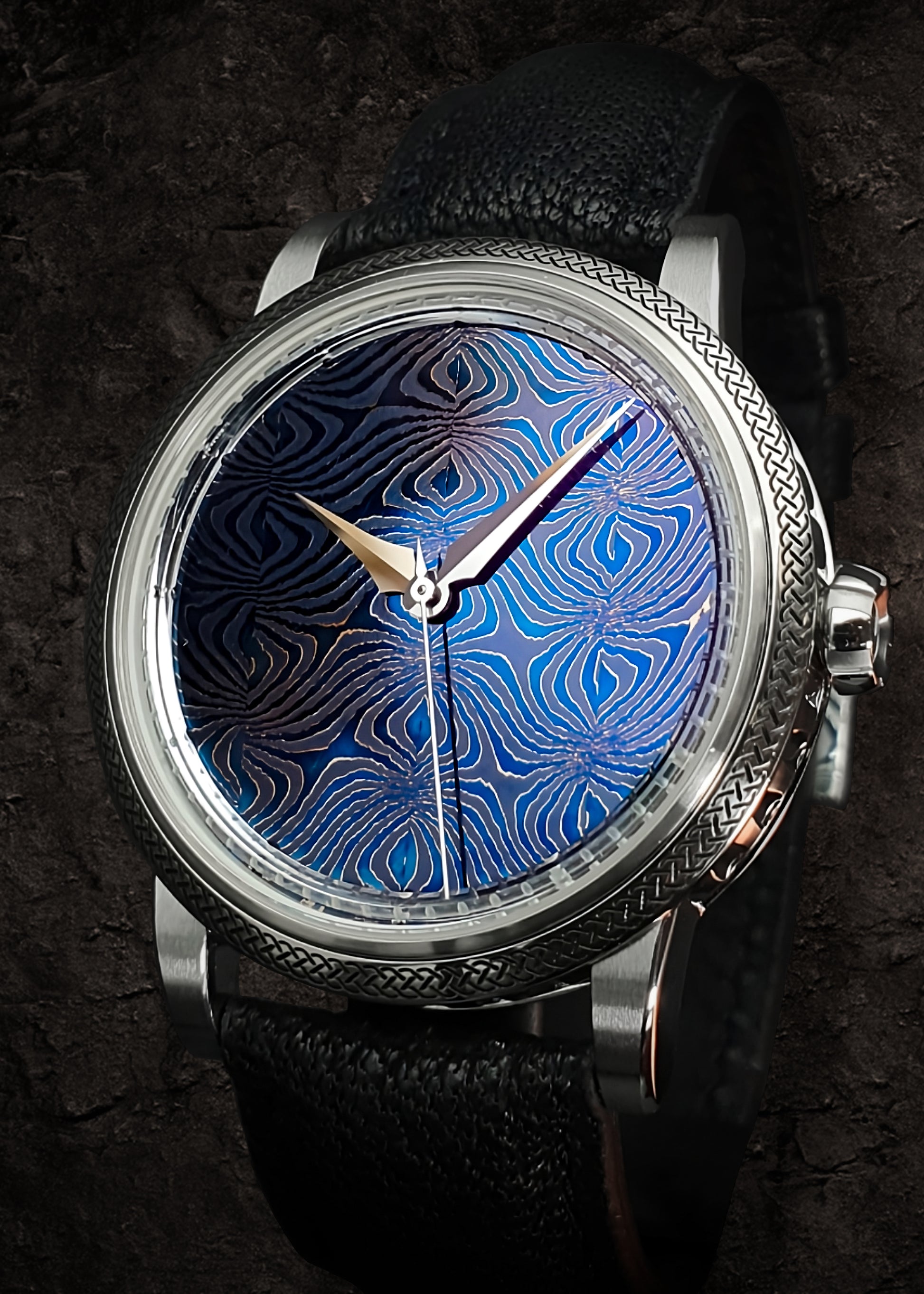 Inspired by the ancient Viking swords unearthed in Fullerö, Sweden, this newest GoS release is endowed with a Damascus steel dial hand-forged by master bladesmith, Conny Persson. For this project, Conny created the dial in the traditional way of its era with a few modern twists. To create the dial, two types of forged steel rods comprising of 17 layers are twisted around their axis. Unlike the swords of the past, a thin layer of nickel is added between each layer to improve the aesthetics.