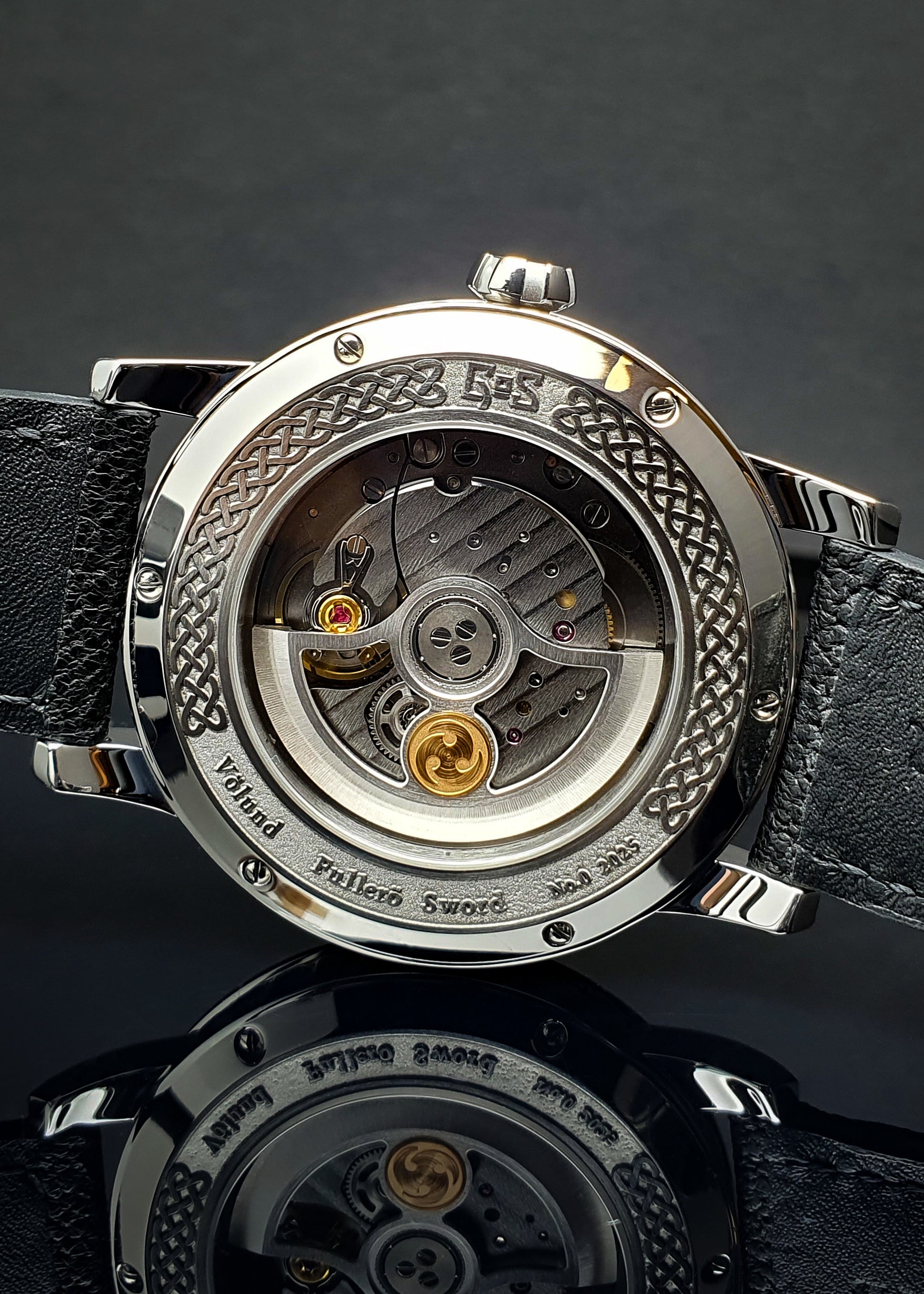 Inspired by the ancient Viking swords unearthed in Fullerö, Sweden, this newest GoS release is endowed with a Damascus steel dial hand-forged by master bladesmith, Conny Persson. For this project, Conny created the dial in the traditional way of its era with a few modern twists. To create the dial, two types of forged steel rods comprising of 17 layers are twisted around their axis. Unlike the swords of the past, a thin layer of nickel is added between each layer to improve the aesthetics.