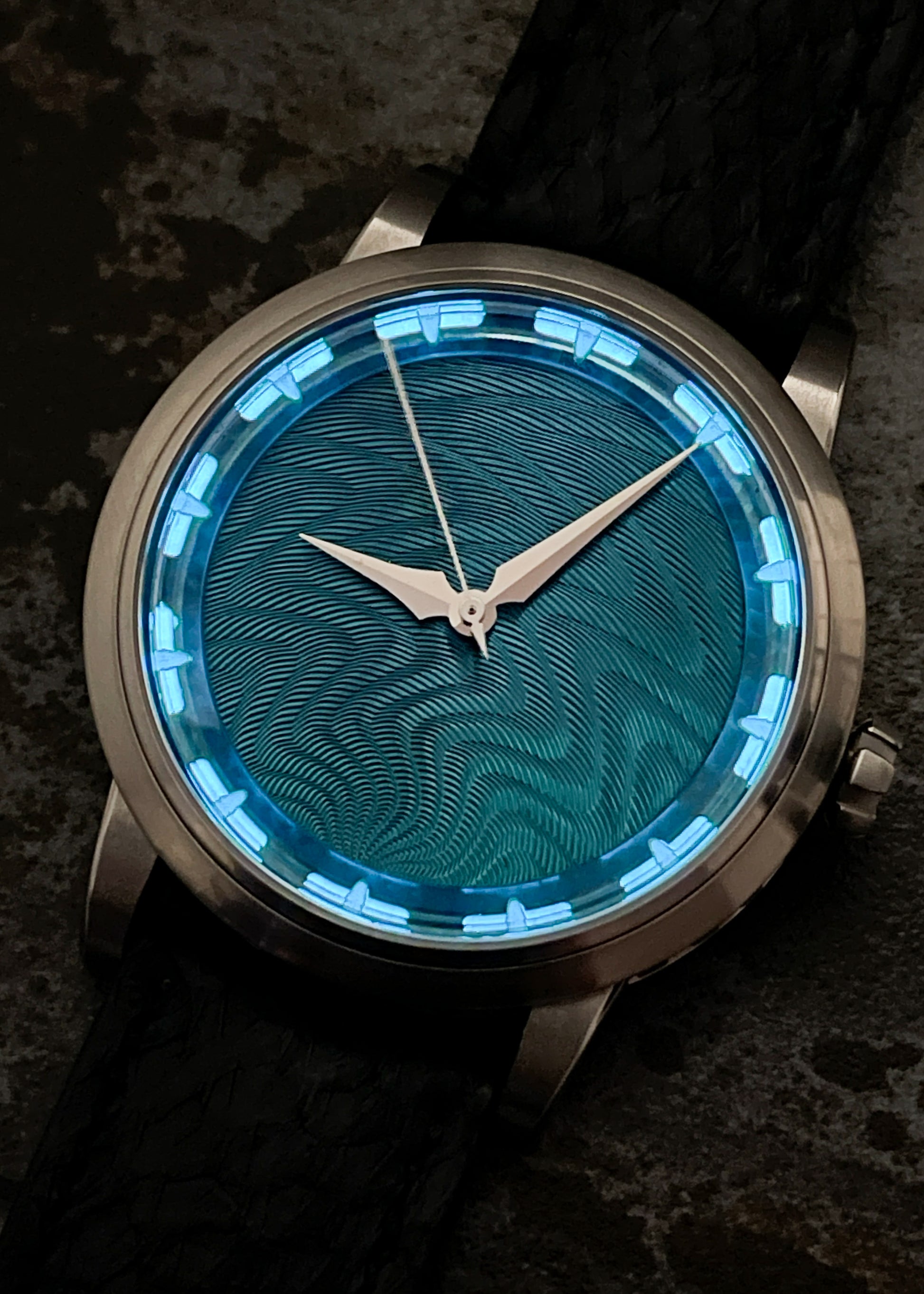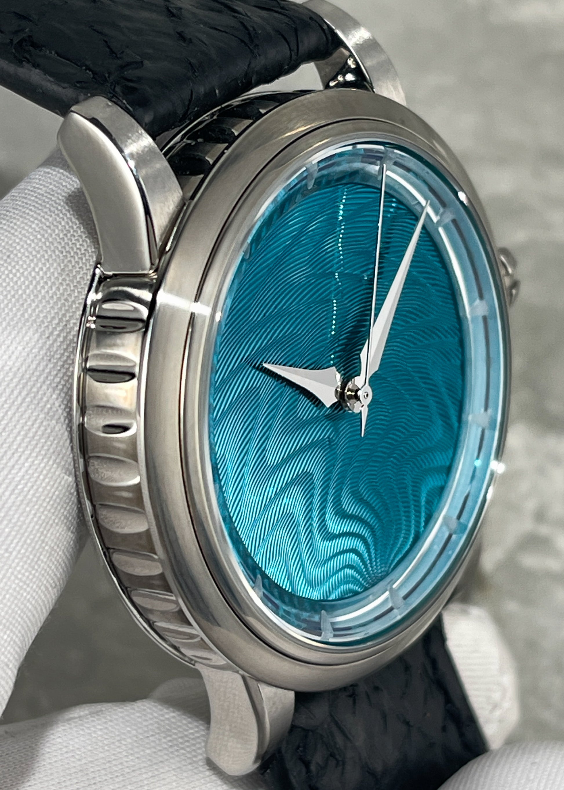 One of the most arresting colors witnessed on a dial exists on this magnificent "Sarek Rissa" from GoS of Sweden. Limited to just five pieces per year, the Sarek Rissa features a handcrafted guilloché dial by Jochen Benzinger with vivid color reminiscent of Caribbean waters. Above the dial is an index ring made of hand-blown Swedish crystal with enamel work underneath to color match the dial.
