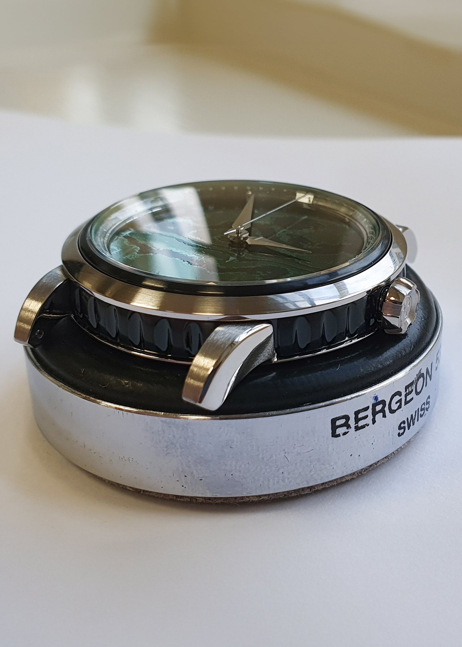 The intense green Damascus dial differs from the norm featuring fewer, but more defined patterns. Patrik of GoS is able to achieve the electric green color seen on the Damascus through a special semi-transparent Nano-Ceramic coating process. Patrik relies on his experience to apply the treatment correctly in the early stages, then administer perfect timing and voltage to create the desired effect. On the periphery exists a tastefully executed chapter ring crafted of sapphire crystal with markings for the minutes and quarters.