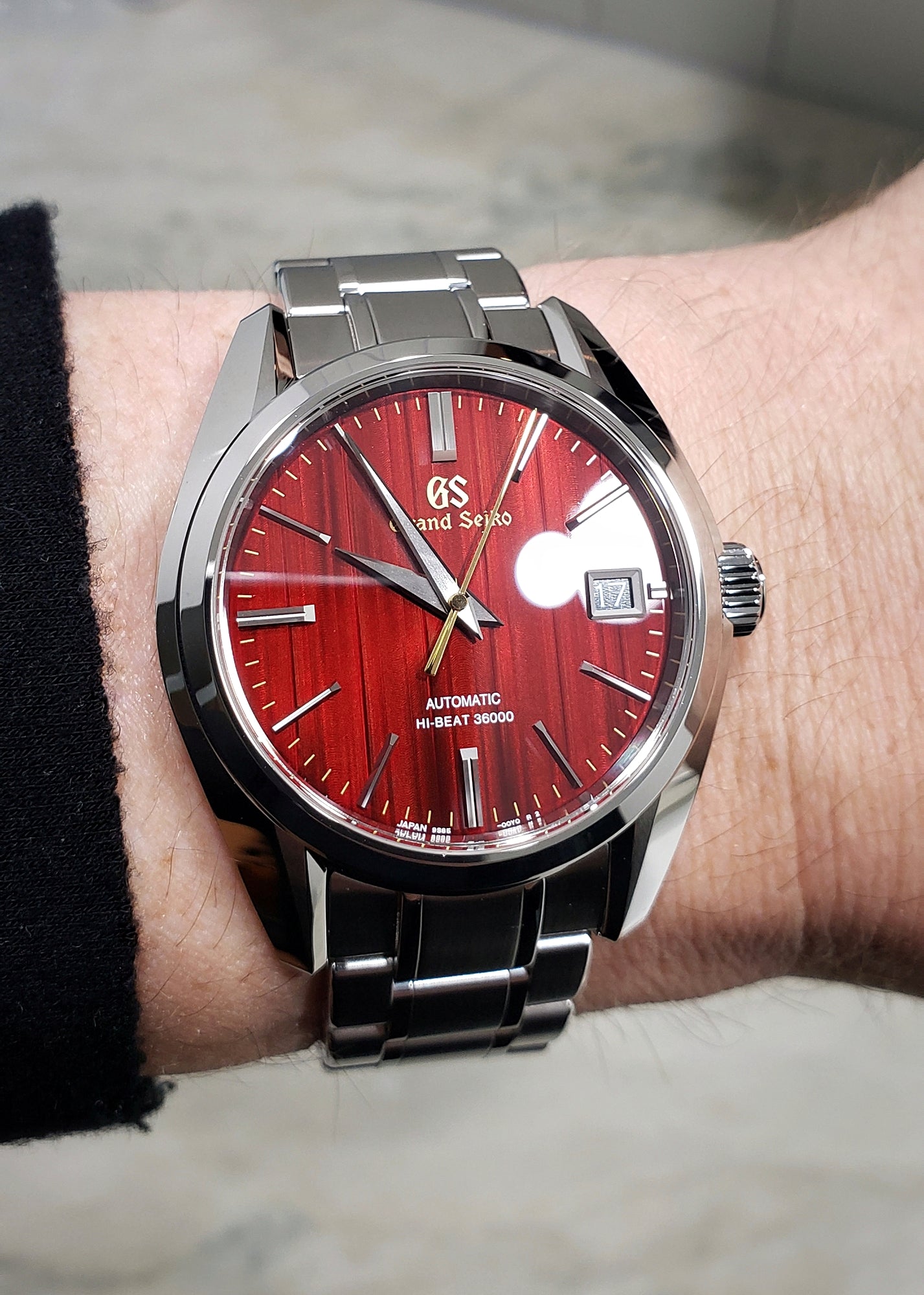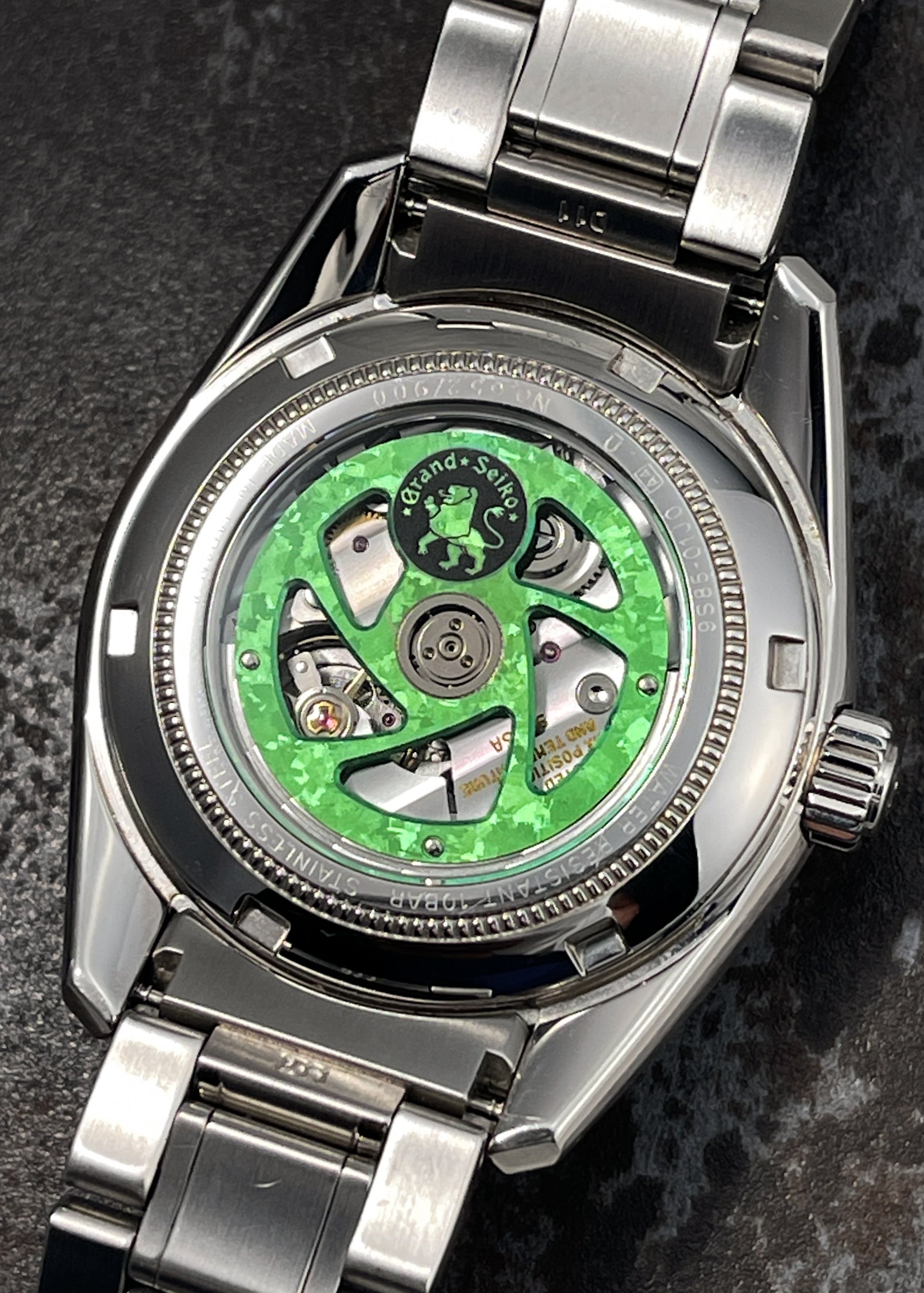 The movement is Grand Seiko's high beat 36000 9S85 caliber with an anodized green titanium rotor and 55 hour power reserve.