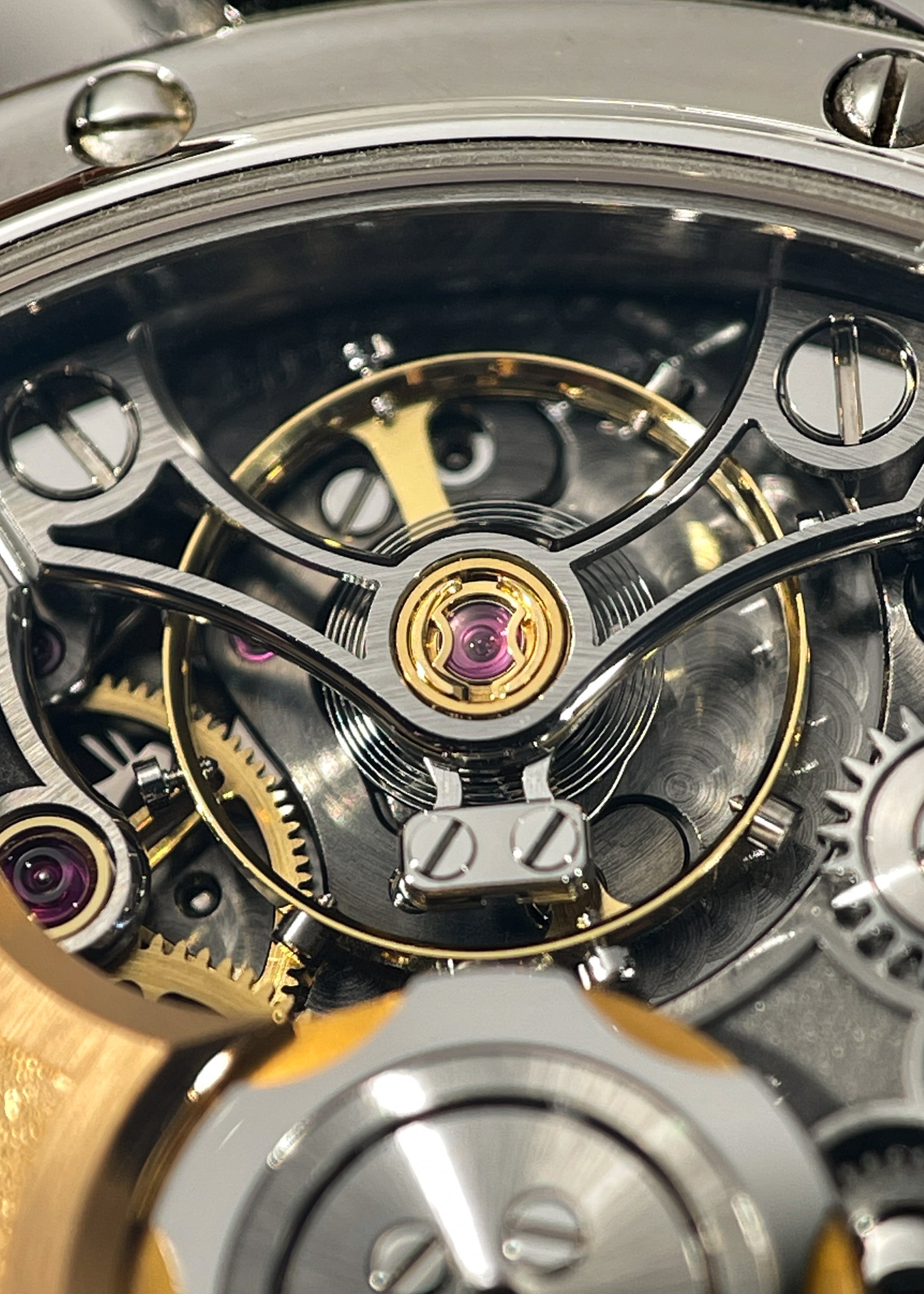 Movement side is a total delight. Dark frosting covering the steel "bell gable" shaped bridges offer an incredible contrast to the golden wheels and high polished steel elements. The 22k rotor itself is an object of beauty which only adds to the appeal and functionality of the watch.