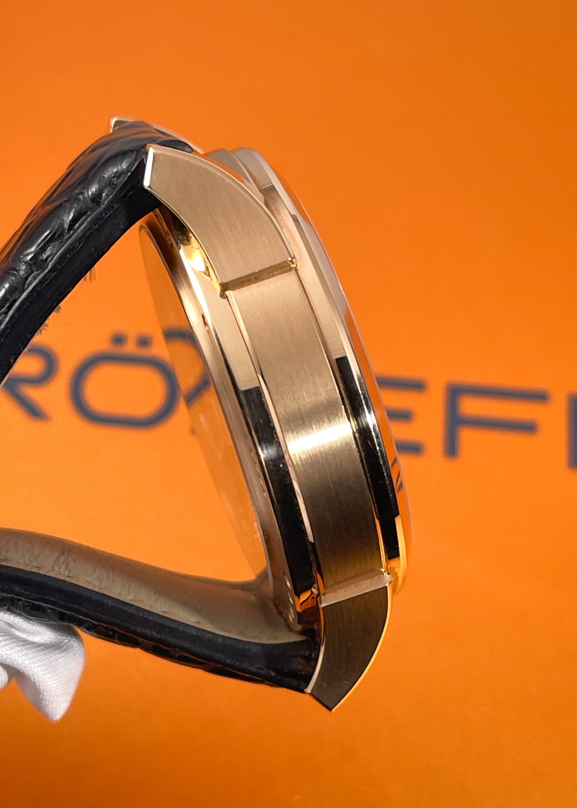 The 18 karat red gold case measures 43mm x 12.5mm x 50mm lug-to-lug. Complete with Box & Papers dated August 2nd, 2019. Furnished on the OEM black alligator strap with red gold Grönefeld pin buckle.