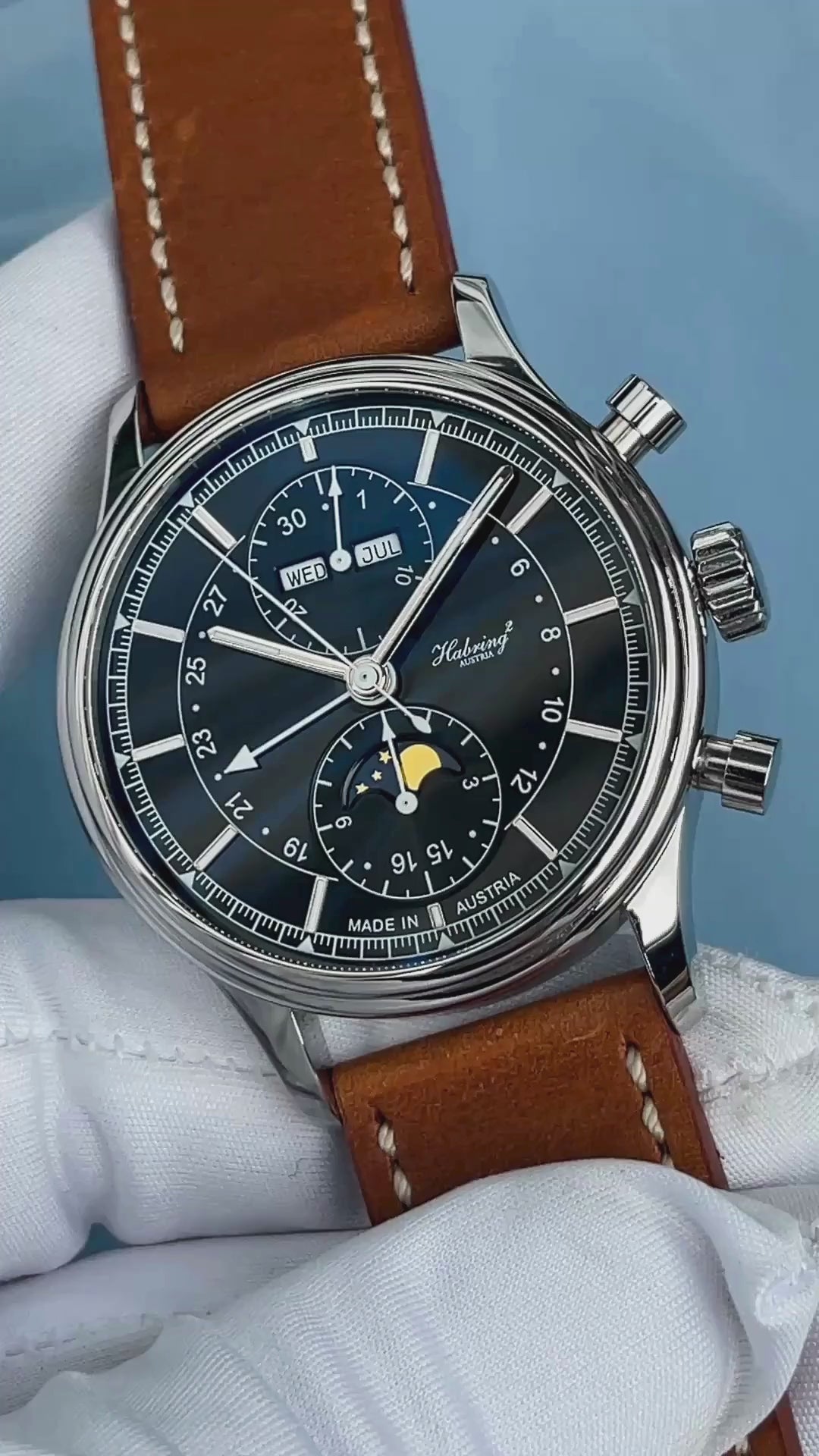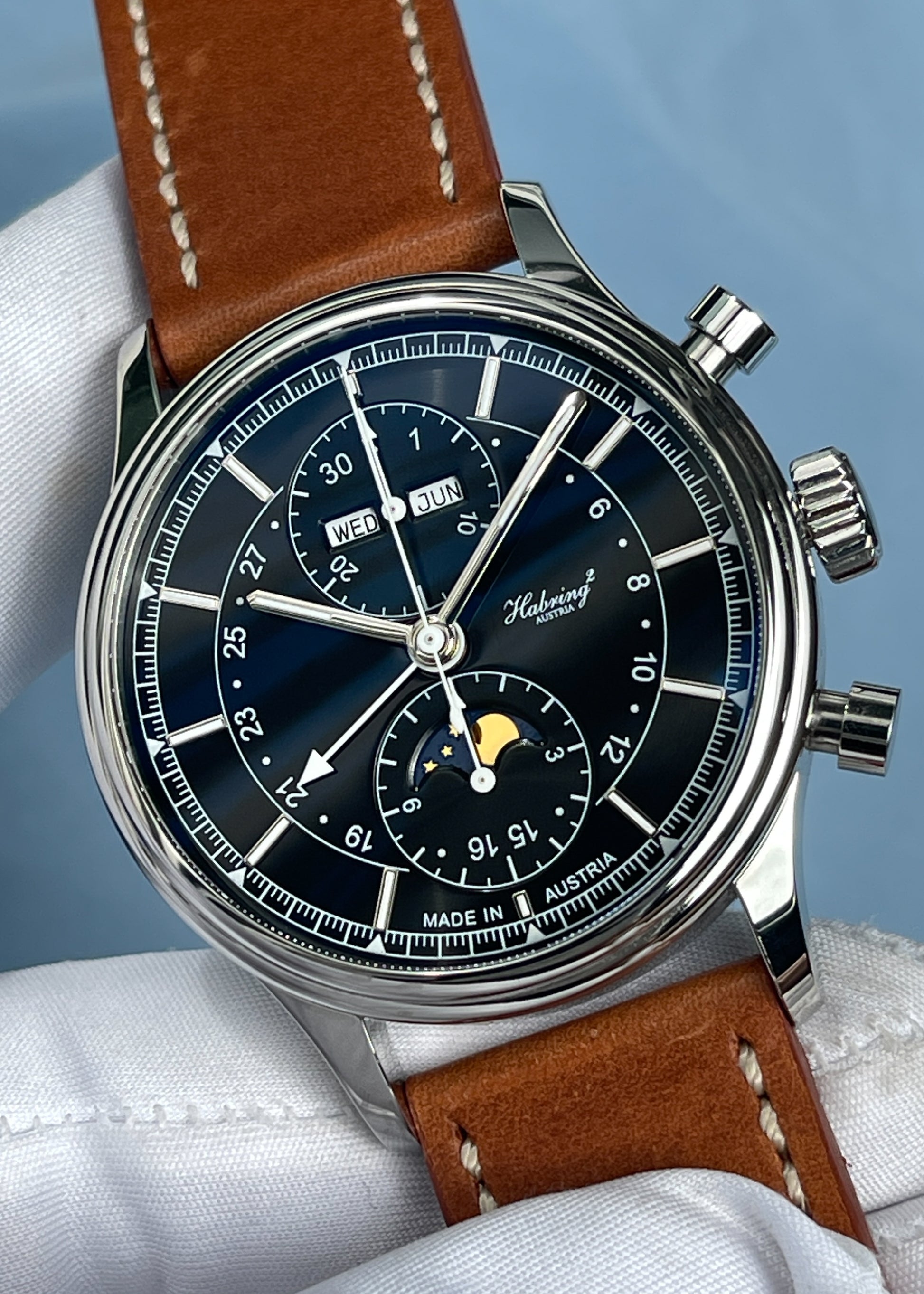 A truly fantastic neo-vintage Habring² is this "Chrono Calendar" from 2013 with a Triple Calendar, Chronograph, and Moonphase complication. The deep black lacquered dial provides excellent daytime legibility and has indices filled with luminescent material to match the hands for evening wear.