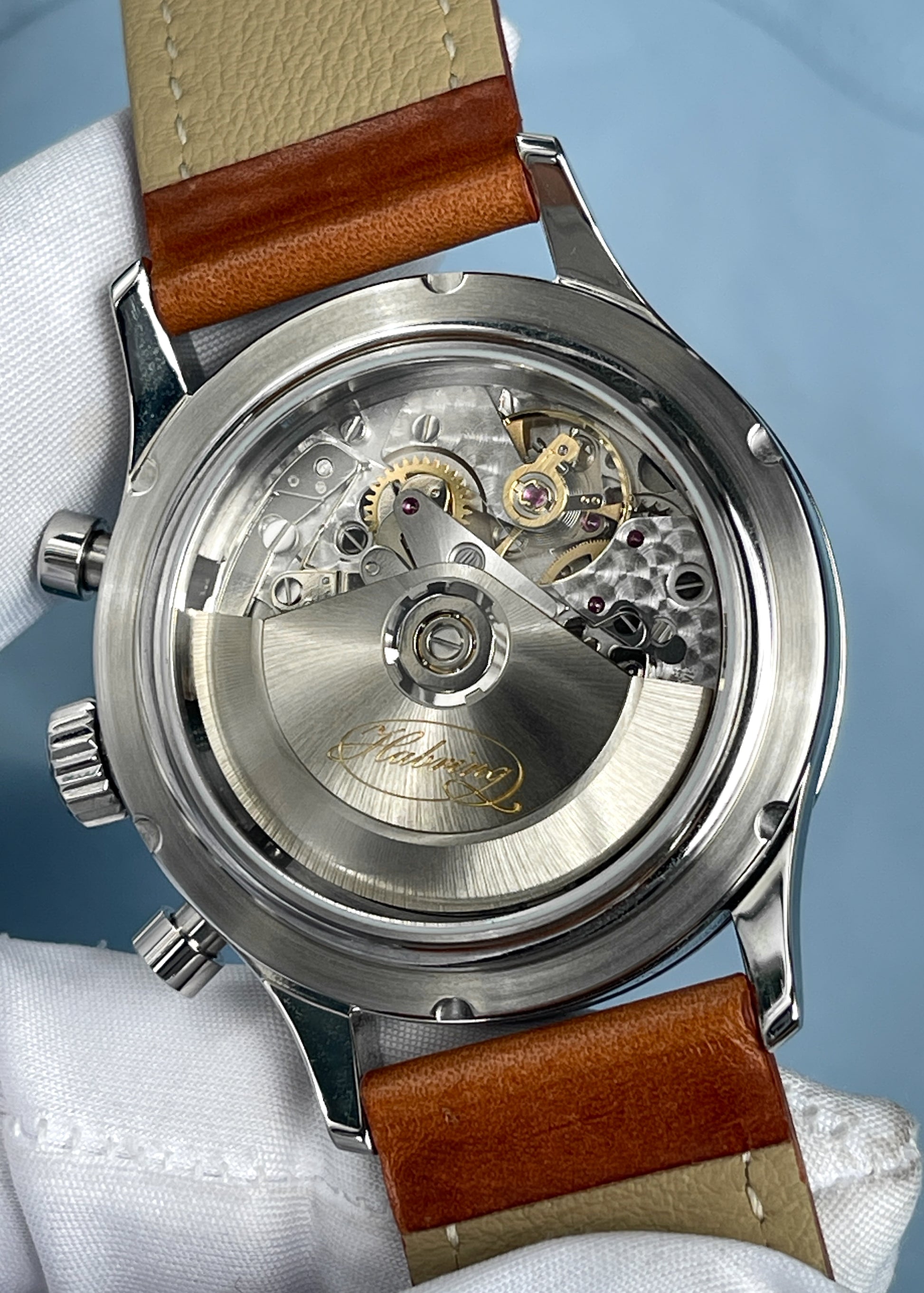 The reverse side reveals the automatic winding Habring² A08K (Valjoux 7751) caliber which operates at 4 Hz and a Power Reserve of approximately 48 hours. The entire calendar and moonphase are adjusted through the crown.