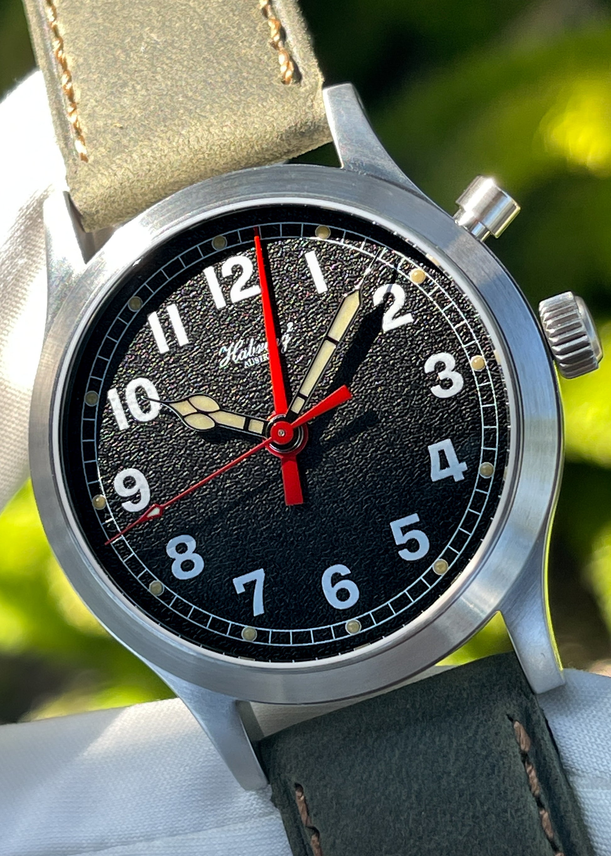 The 4th release in the Habring² Pilot series is the ultra legible Chrono-Felix ZM. The ZM (Zentraler Minutenzähler or Central Minute Counter) records elapsed minutes in addition to the seconds on the central axis by way of painted red chronograph hands. The pusher at 2 o'clock is used to start, stop, and reset the chronograph. The movement beats at 4 Hz and delivers a power reserve of 48 hours.