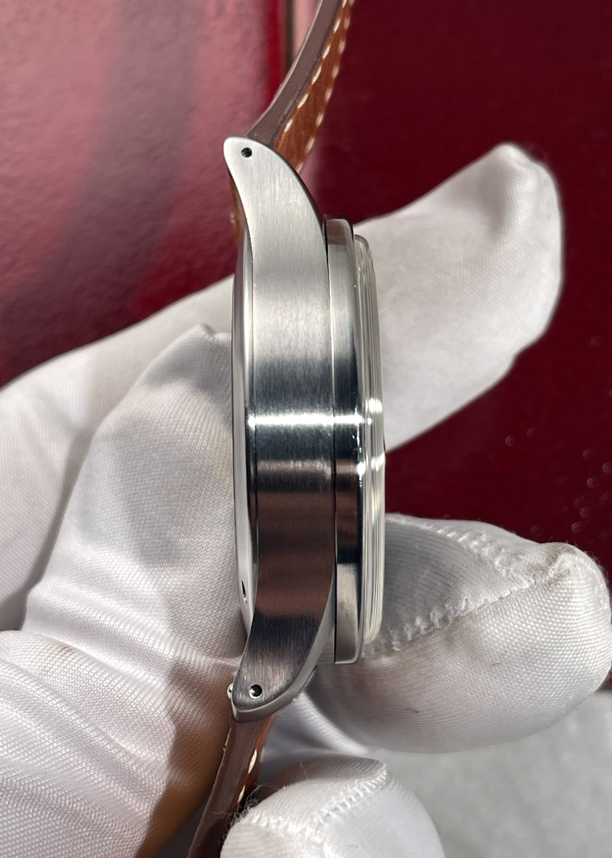 The Stainless Steel case measures 42mm x 14mm x 52mm lug-to-lug and is in excellent condition. No Box & Papers. Furnished on a DeLugs calfskin strap with pin buckle.