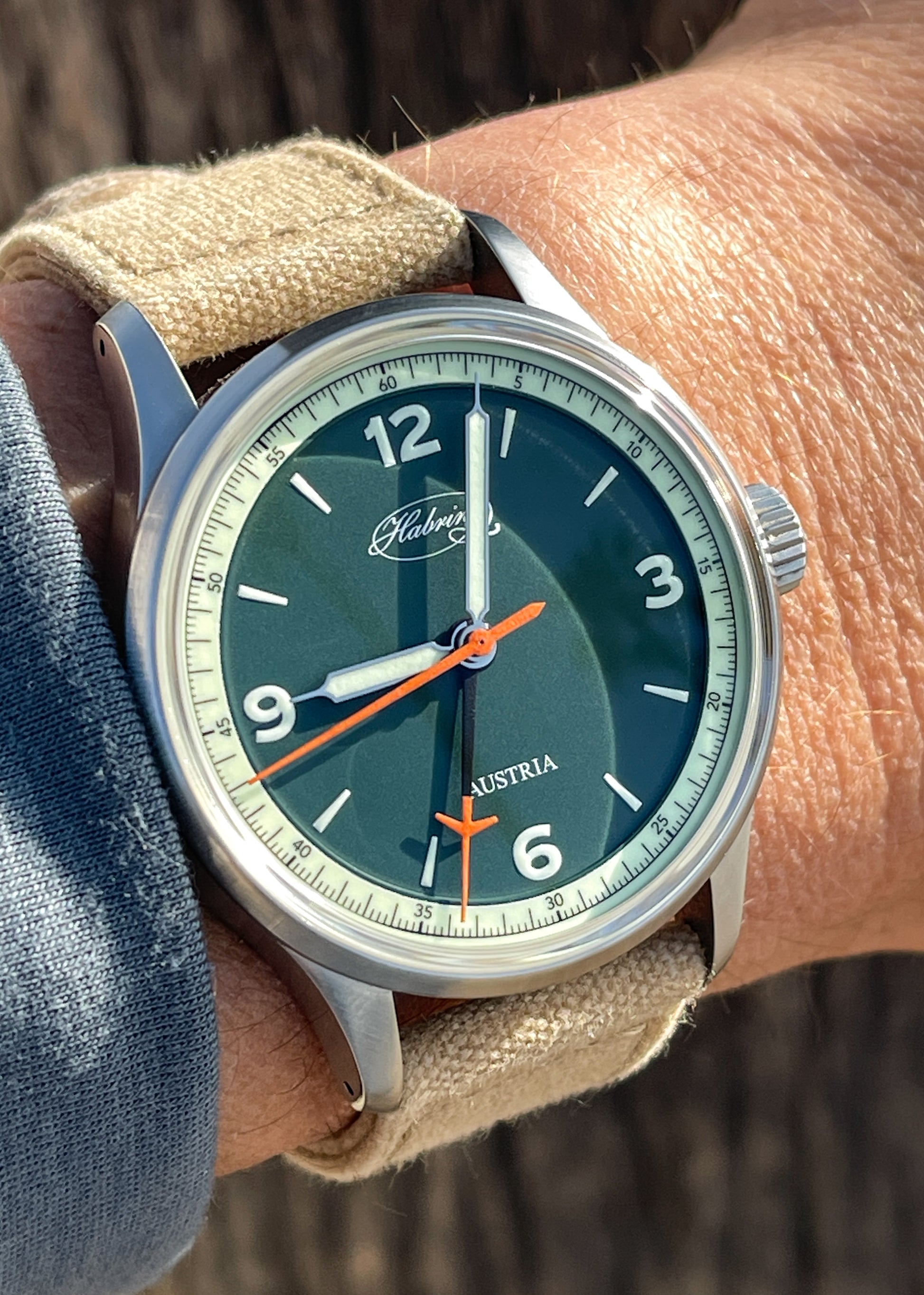 This COS ZM chronograph you may have noticed is completely without pushers. The Habring's Crown Operated System enables the user to start, stop, and reset the chronograph completely through the crown (see video). ZM, or Zentraler Minutenzähler refers to the chronograph minutes accompanying the chronograph seconds on the central axis/canon pinion.