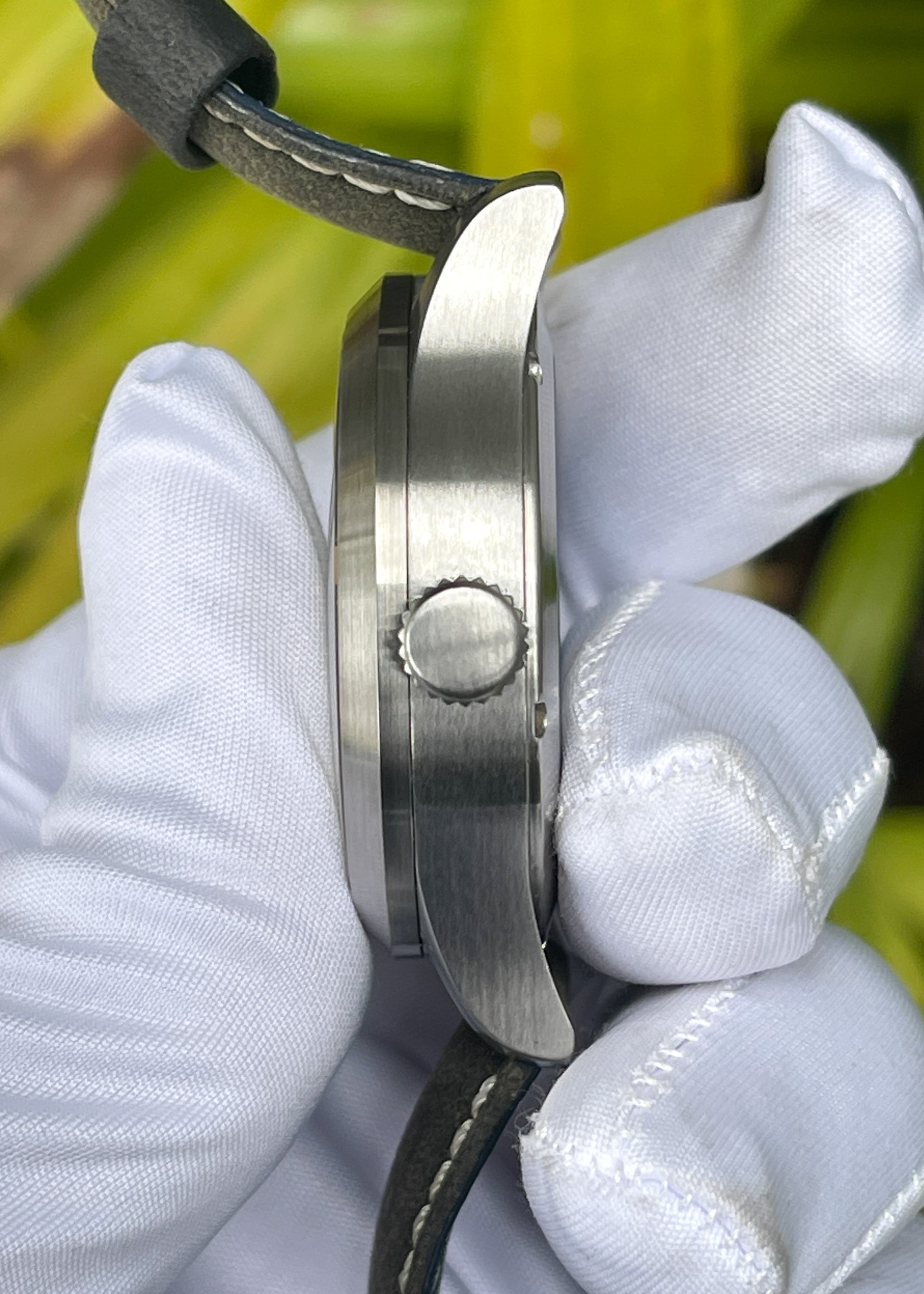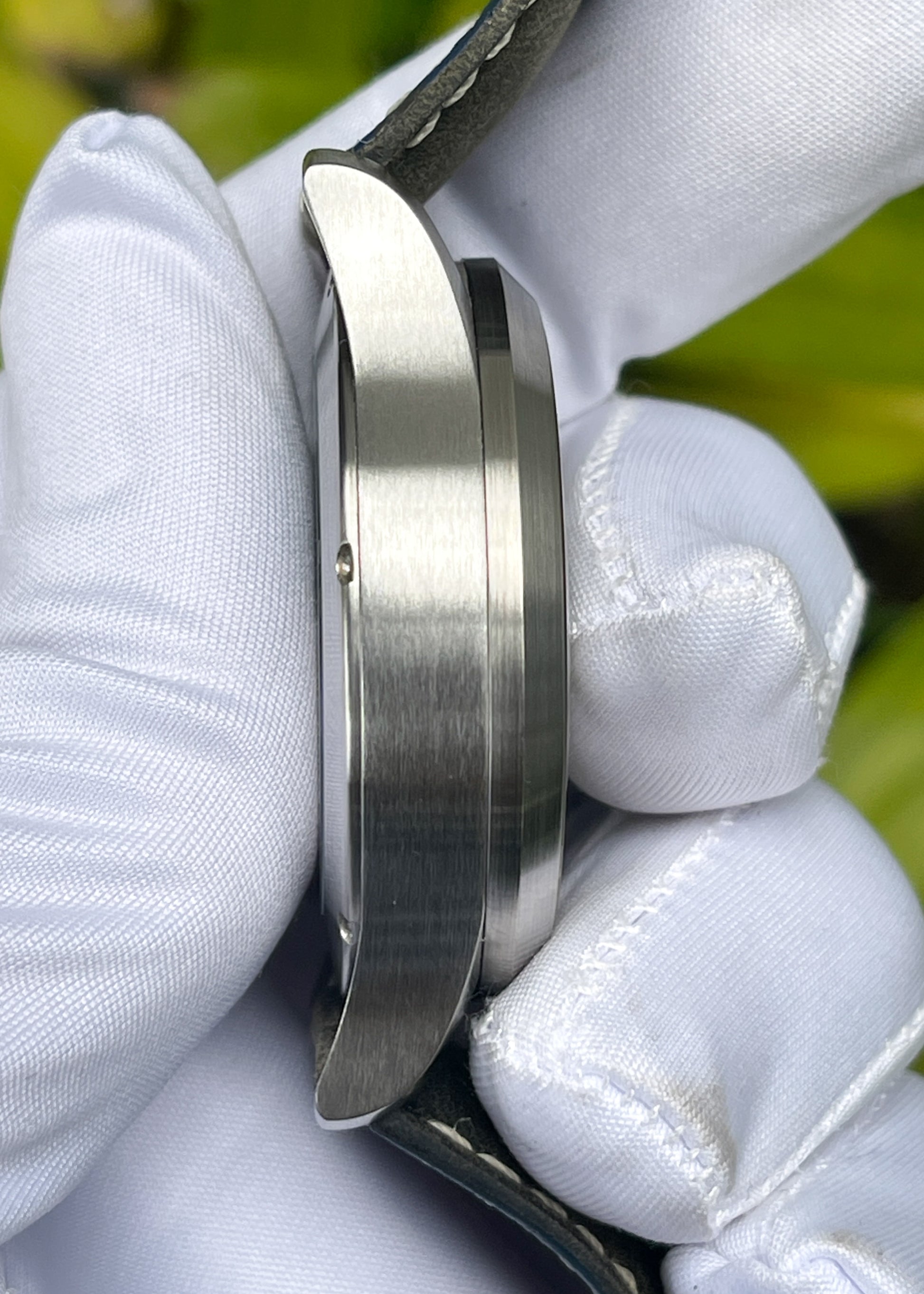 The stainless steel case measures 42mm x 13.6mm x 52mm lug-to-lug and is excellent condition. Furnished on dark grey OEM calfskin strap and complete with Box and Papers.