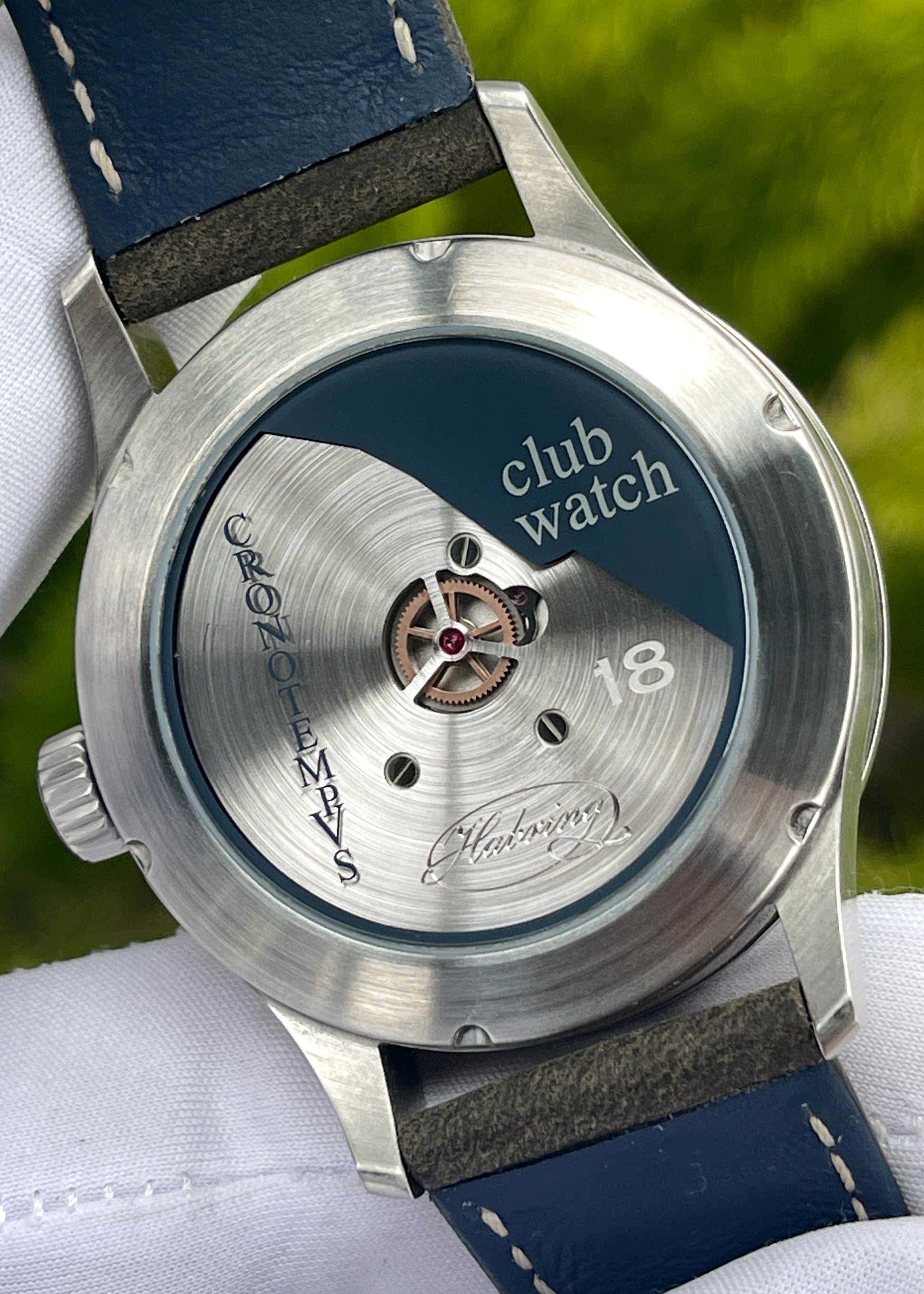 The reverse side reveals a small view of Habring²’s fully in-house manual-wind caliber underneath a circularly brushed top plate engraved with the Habring² logo and 18, the serial number of the watch. A sticker is affixed to the underside of the crystal signifying this as a watch for the CronotempVs Collectors Club.