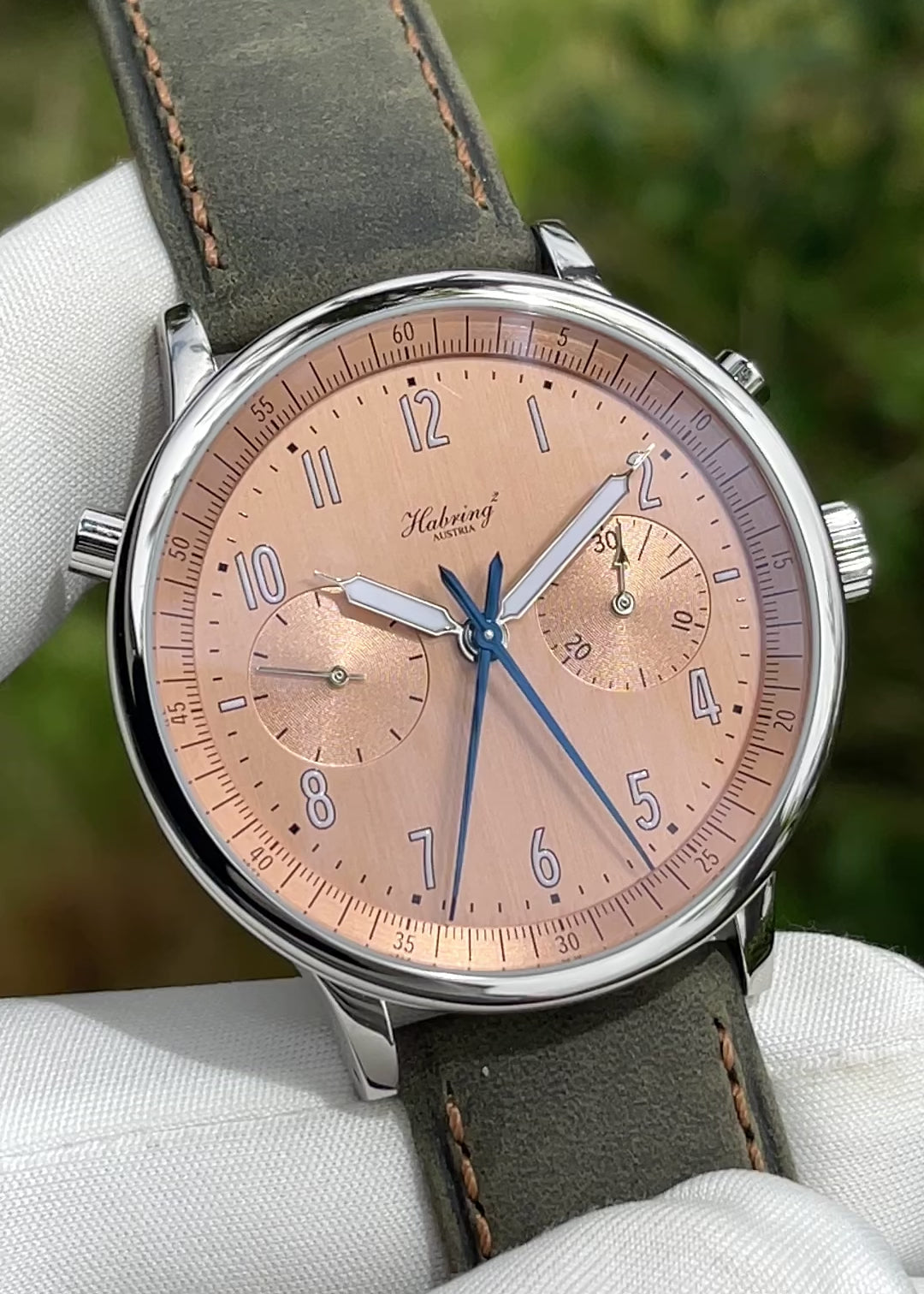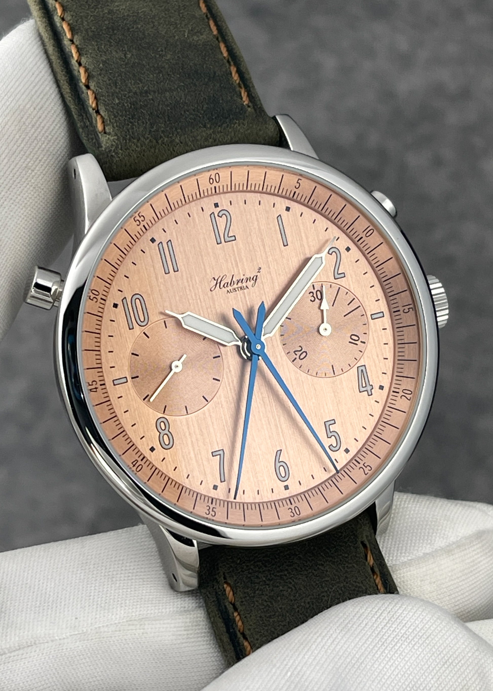 Just arrived is this mint Doppel 38 with Habring2's famous salmon dial. We sold this watch to the original owner June 10th of this year and according to him it was "only worn twice"... and judging on the condition I can definitely take him for his word!