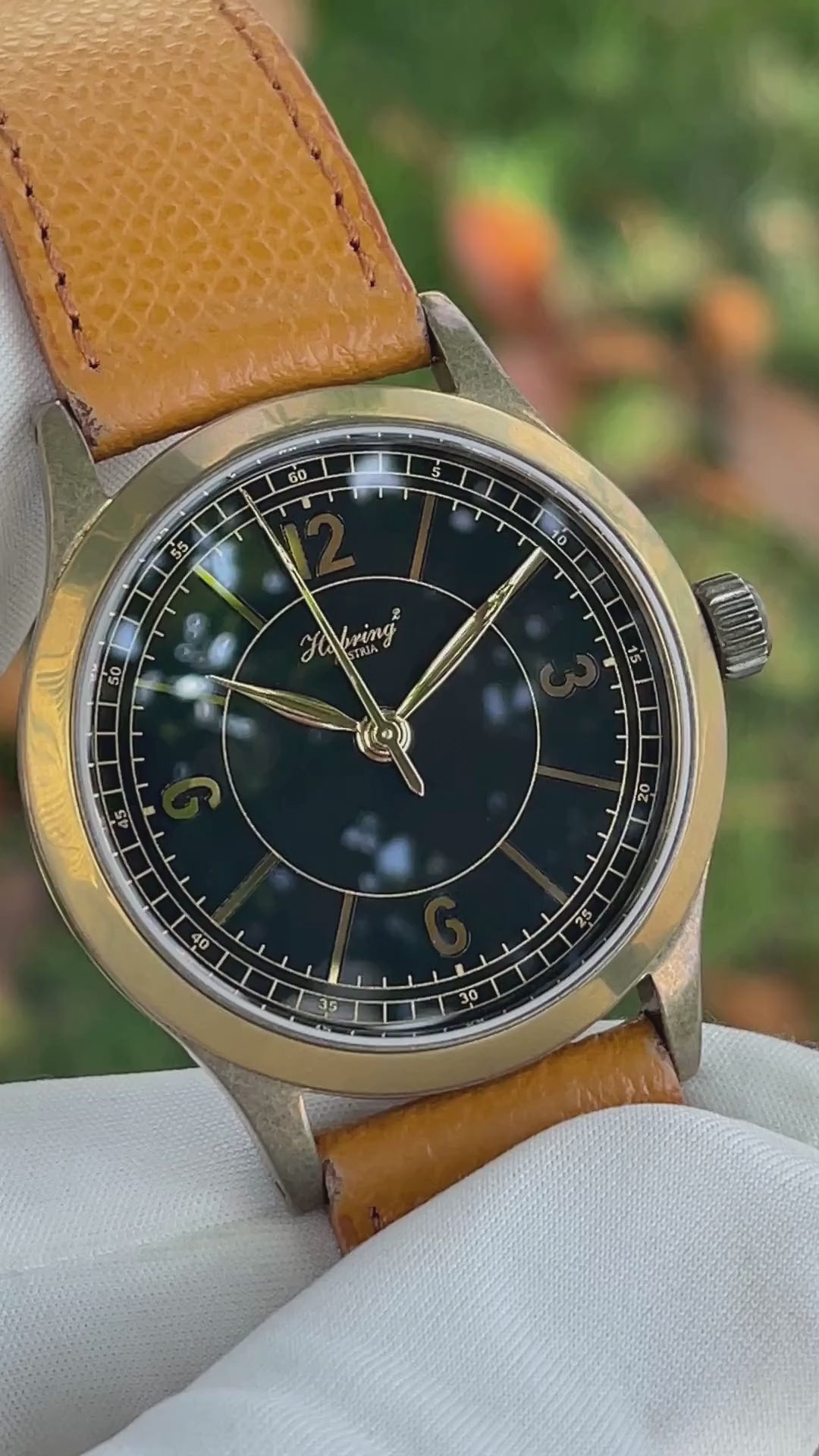 A beautiful first collaboration between Habring² and Massena Lab. The black and gilt sector dial pairs perfectly with the patinated bronze case. As with all Habring2 Erwin models, the jumping seconds hand lands precisely on each indice around the dial.