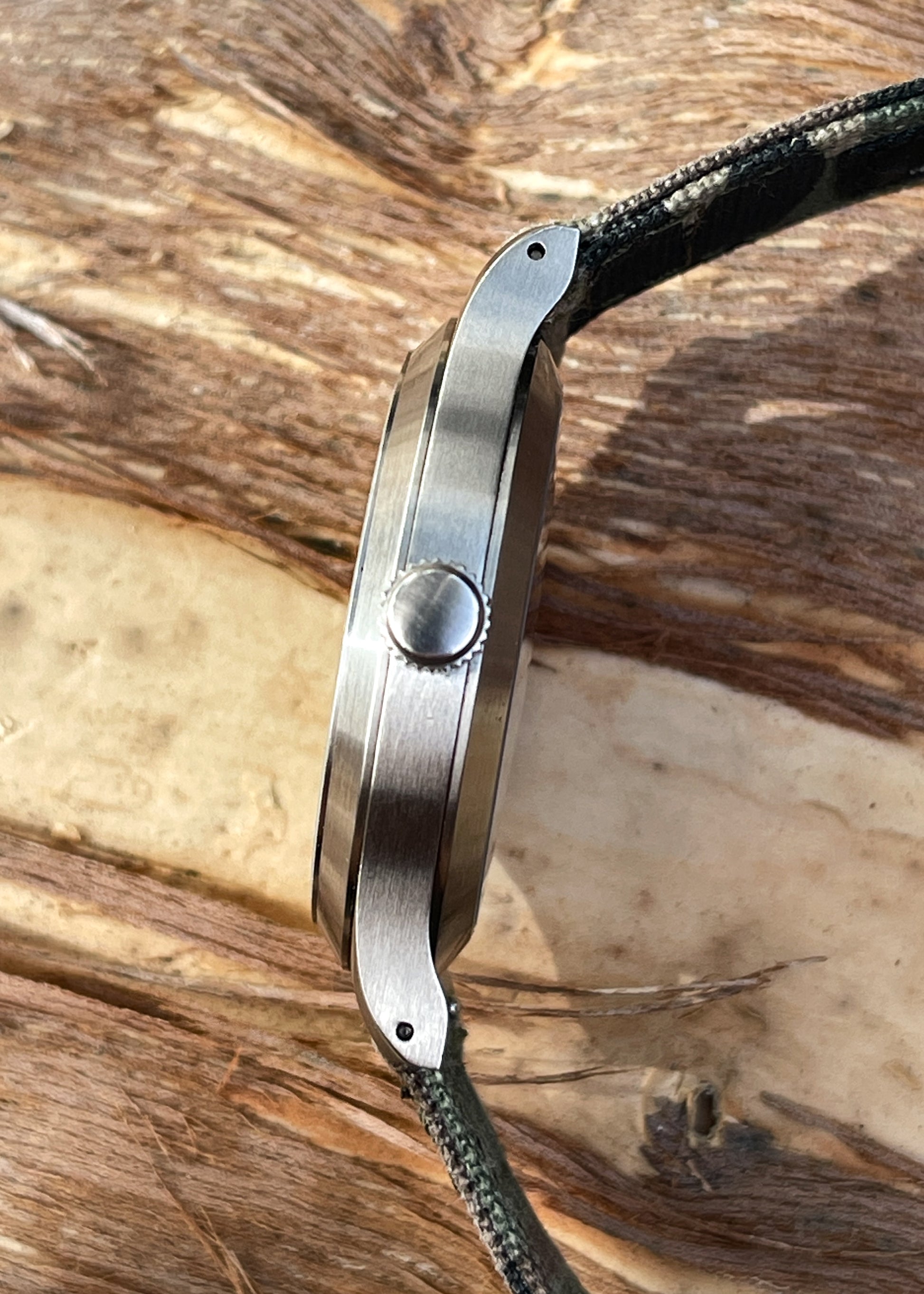 The Stainless Steel case measures 38.5mm x 12mm x 46mm lug-to-lug. Some light scratches can be observed around the bezel and a small mark to the side of the lug on the 9 o'clock side. Complete with Box and Papers. Furnished on a Barton Bands canvas strap.