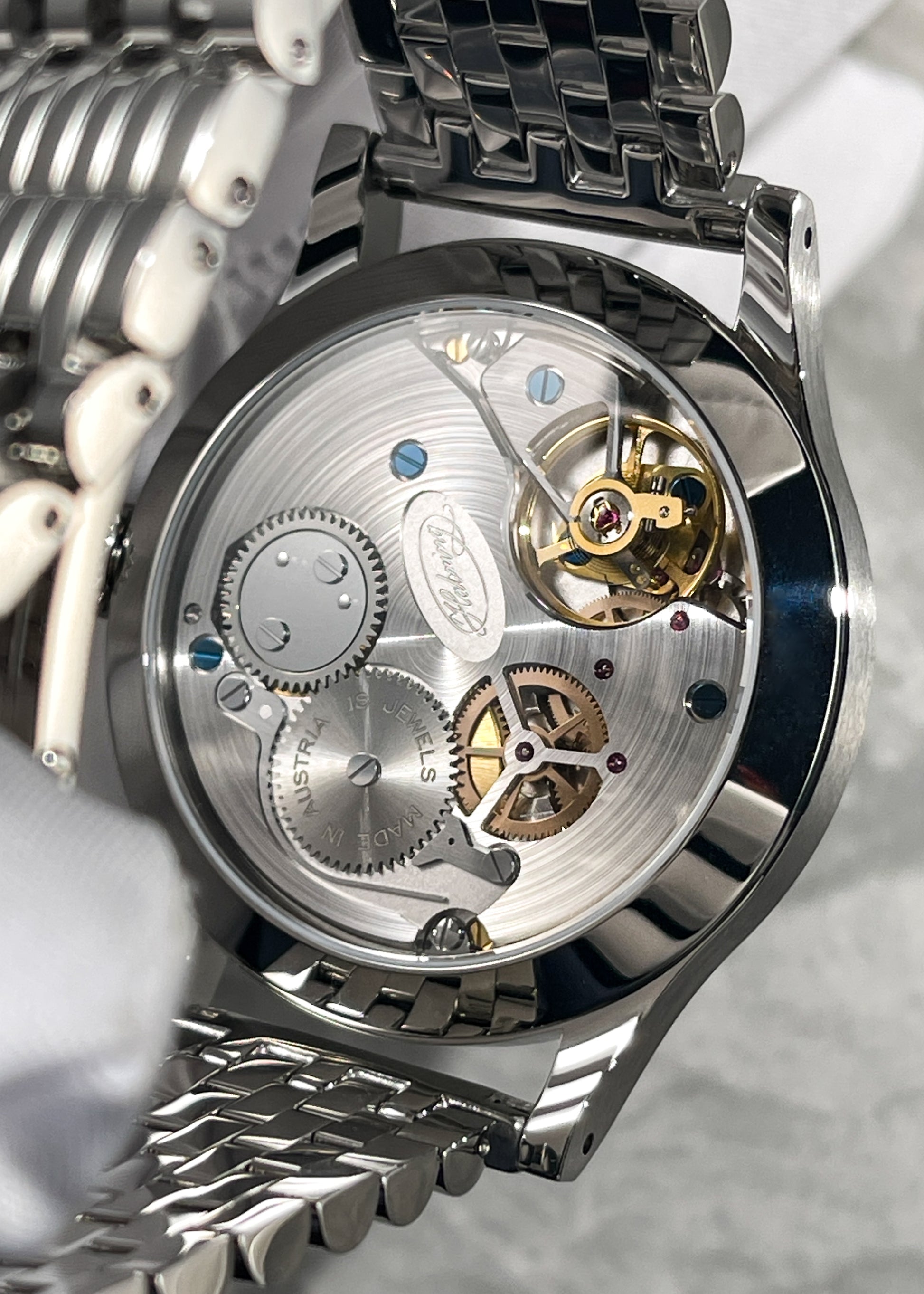 A complicated edition of the newly released Oskar line from Habring² is this pointer date variant with moon phase indication. Available with either a finely grained blue or glossy white lacquered dial with rhodium Breguet hour markers and leaf-shaped hands. 31 Breguet numerals encircle the dial to represent the date. The moon phase disc contains two faces, a masculine face representing Richard while the other naturally representing Maria.