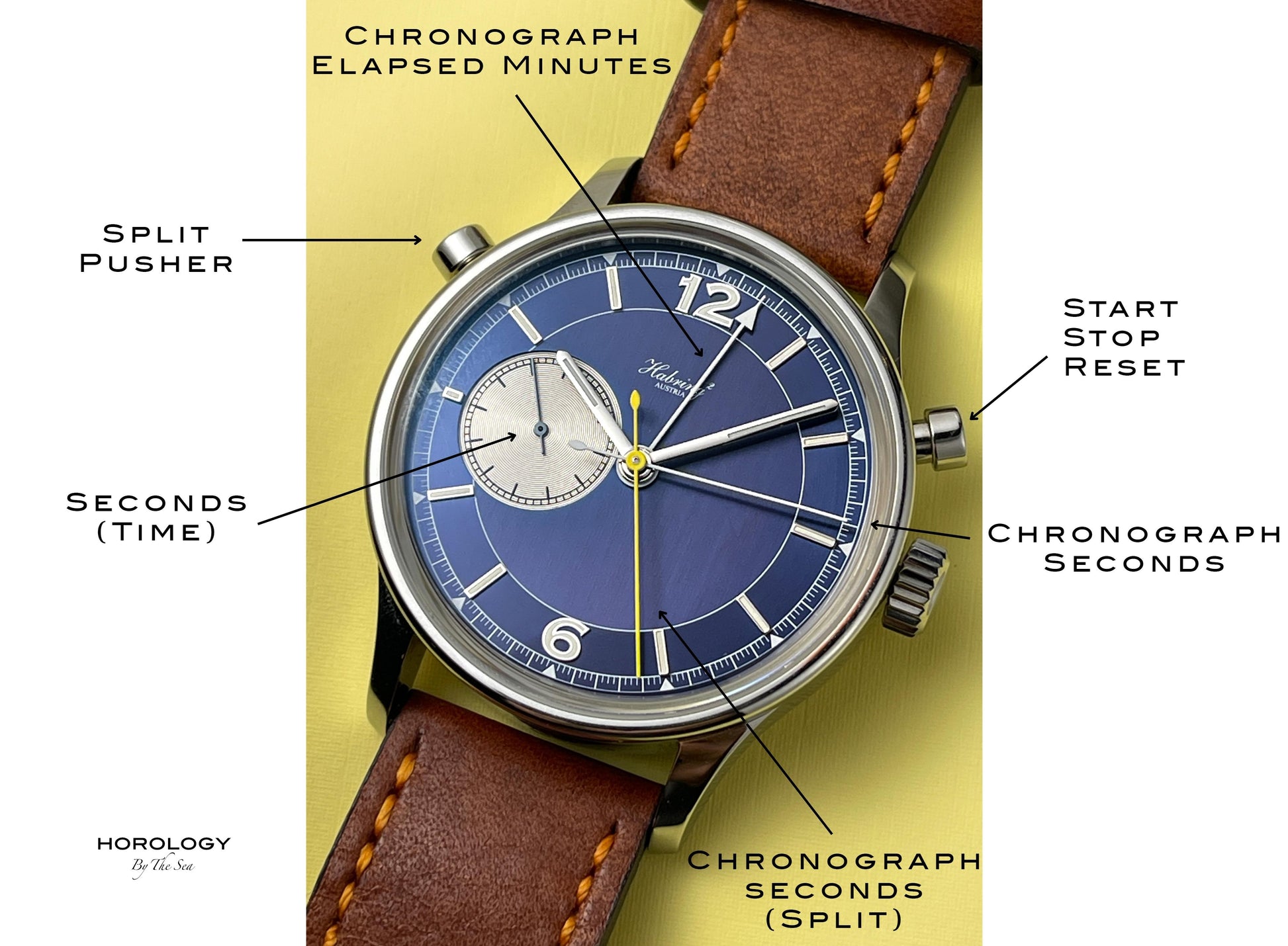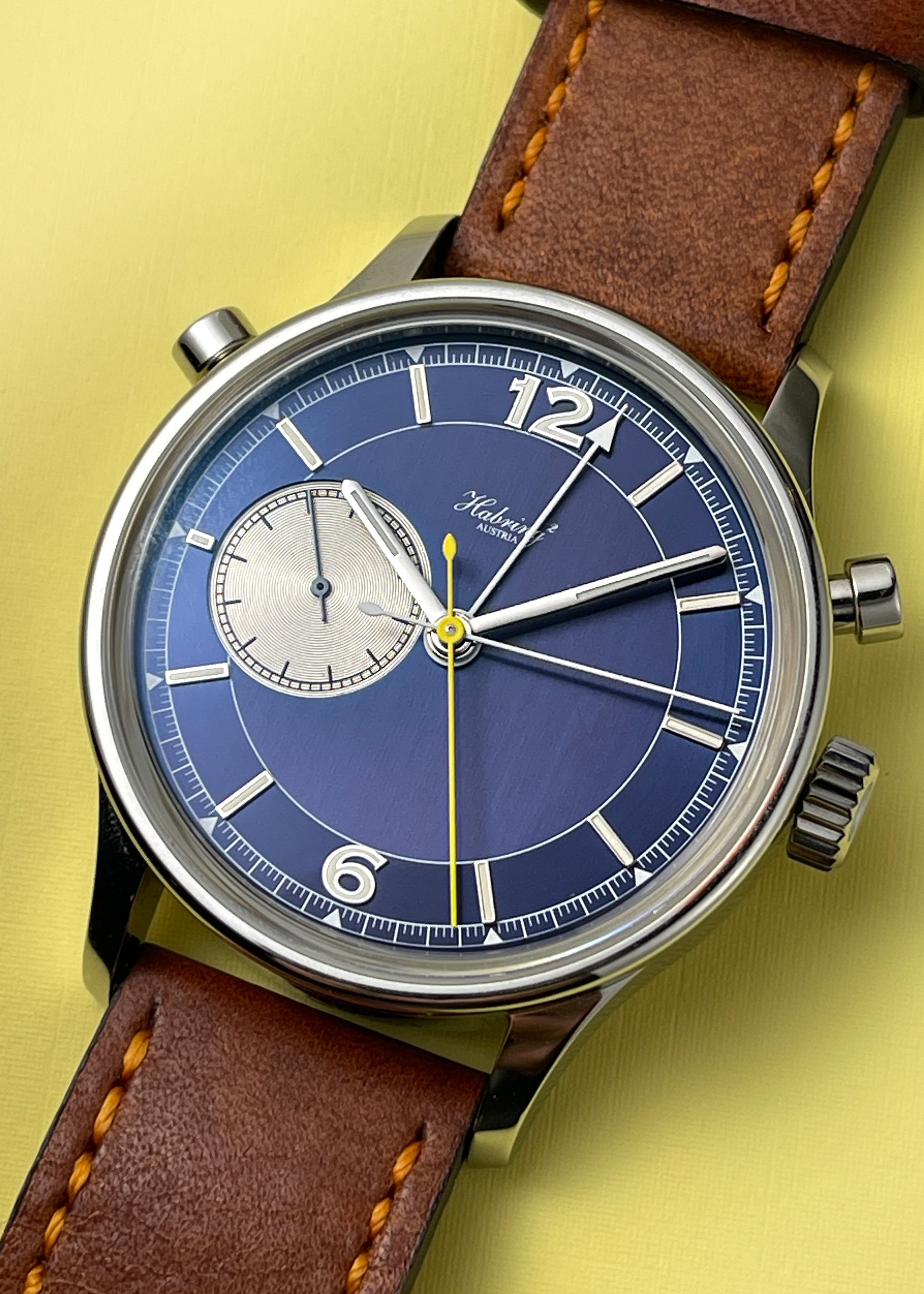 The blue dial features applied indices which have been lumed to match the hour and minute hands.