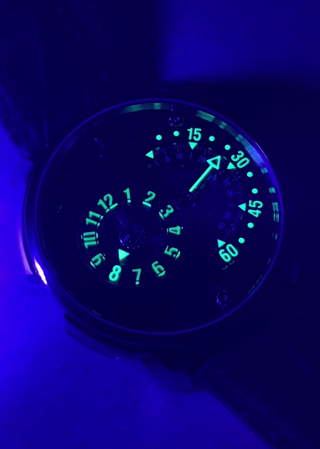 Just Say No to the beaten path with this killer Hautlence HLRQ 02 in titanium. A lot to love for not a lot of money, this watch features retrograde minutes that makes a very audible sound when returning to zero, and while this takes place the hour indicator also jumps from one to the next. Tucked down below is the date which is adjust via the pusher at 12 o'clock. The case is 44mm, though with the titanium case and super short lugs it wears much friendlier than the diameter suggests.