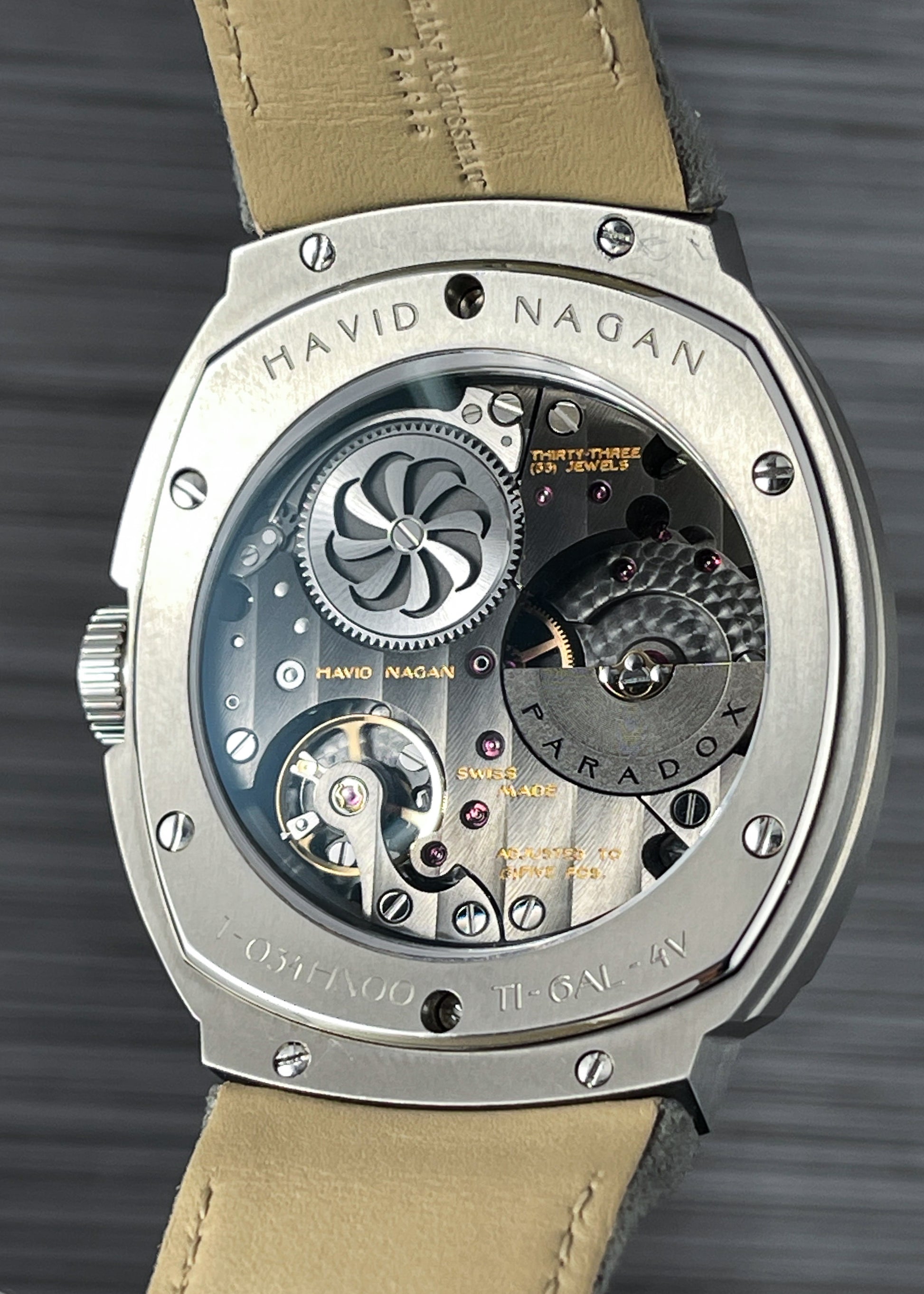 Aren chose an excellent movement for the HN00, an automatic winding Schwarz Etienne with micro-rotor. The Côtes de Genève bridges have been treated with a dark plating which creates a punch contrast to the gold colored wheels and font.