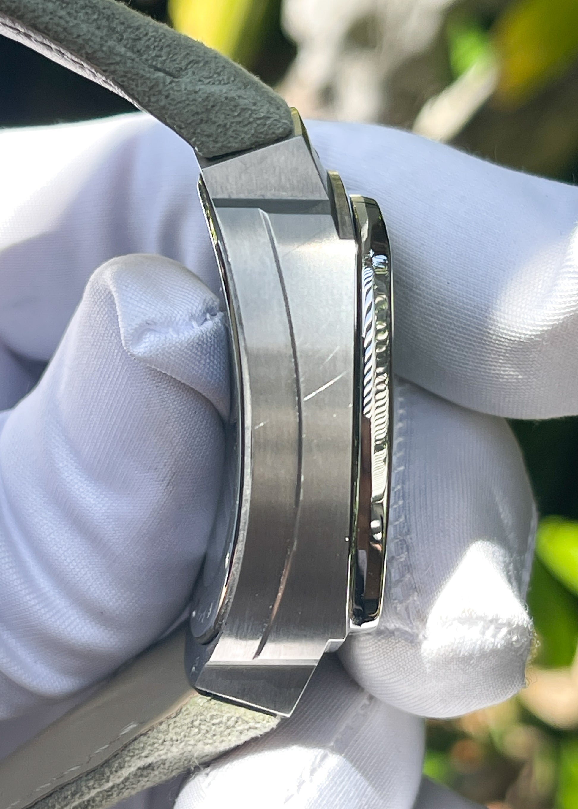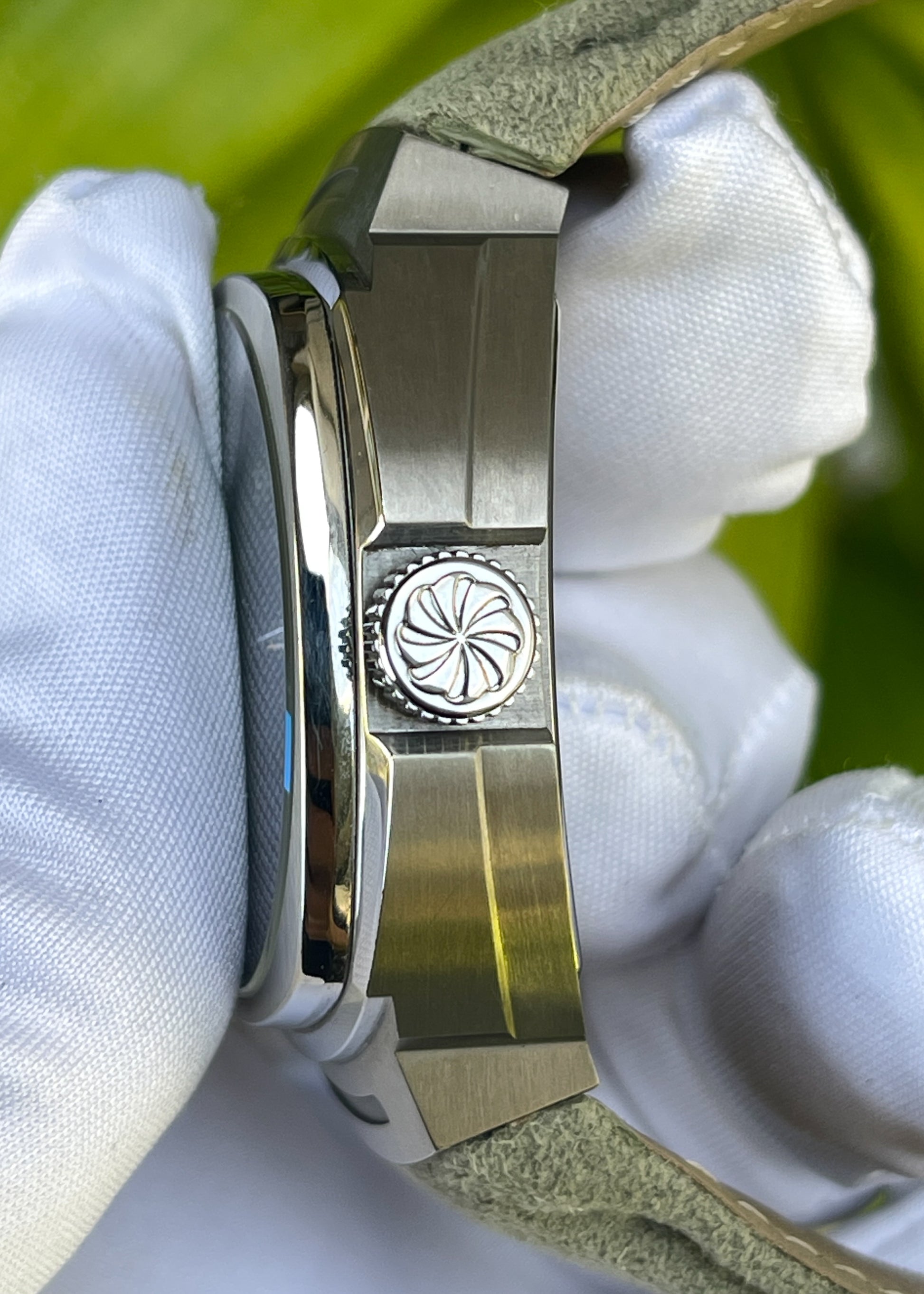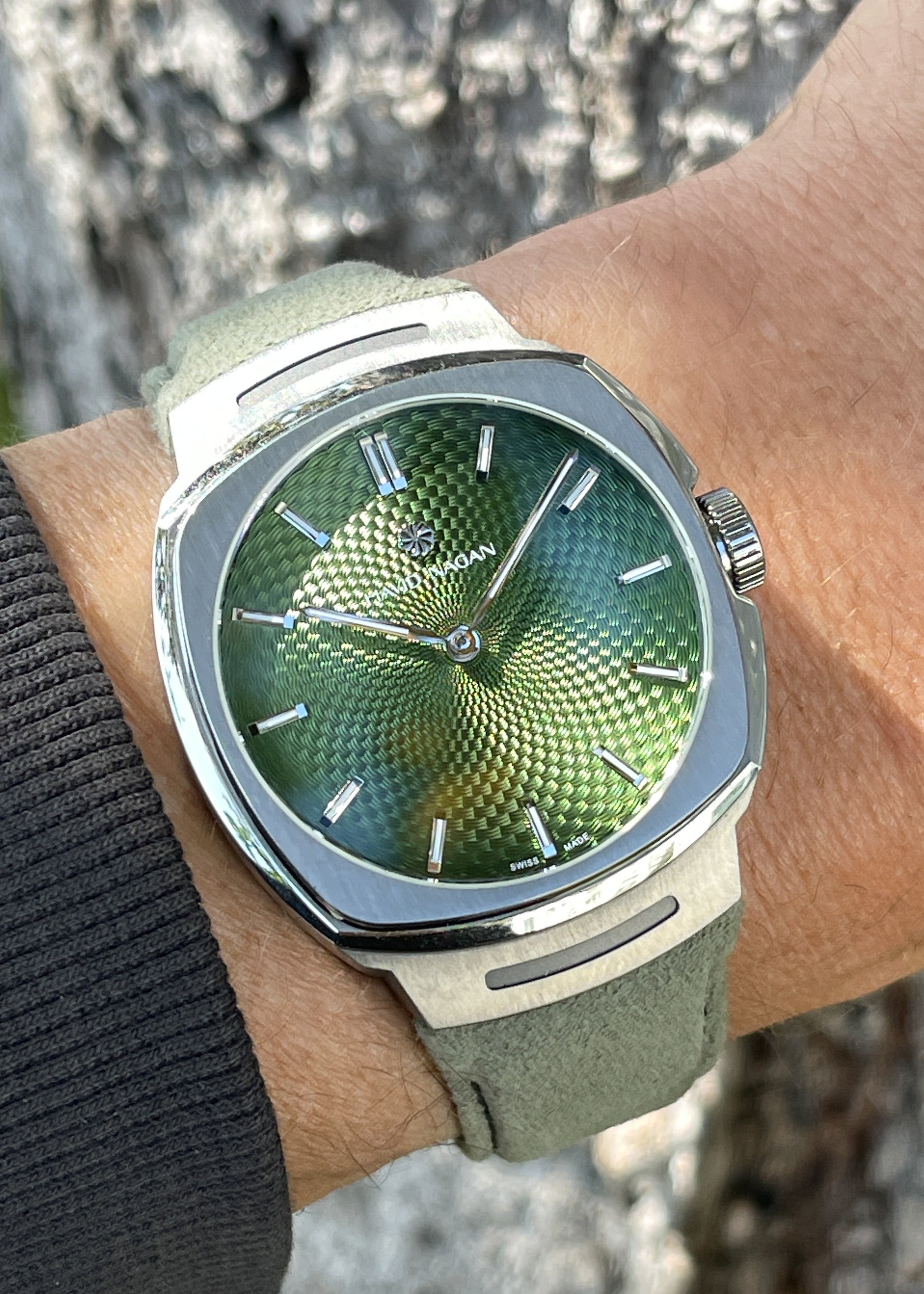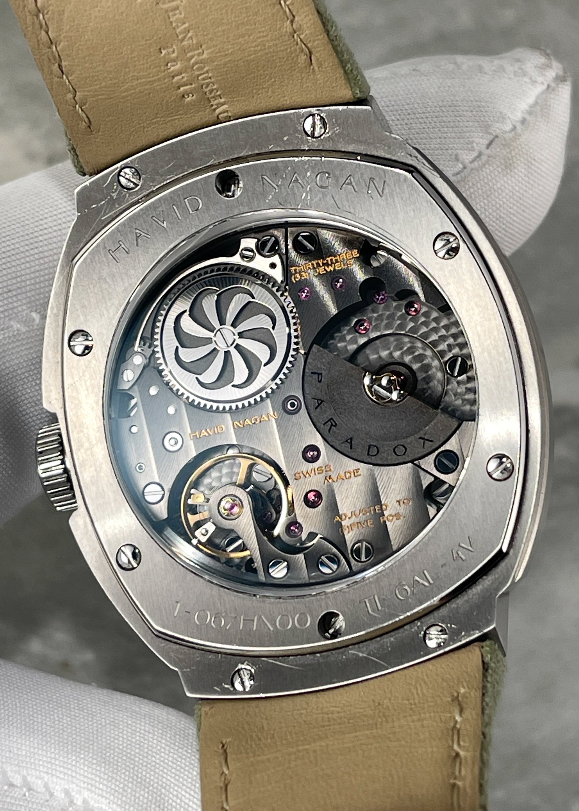 This piece features a lovely "Jade" dial with a circular Grain d' Orge guilloché pattern. The Grade 5 titanium case measures 40.7mm in diameter x 12.2mm thick at its slimmest point, and 14.8mm at its thickest. This may sound a little thicker than most prefer, however the entire caseback (sapphire crystal included) curves in a way that makes this watch super comfortable on the wrist.